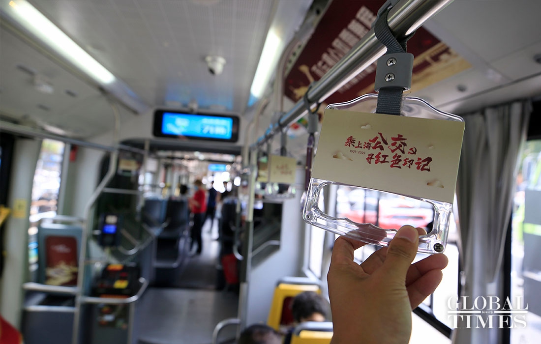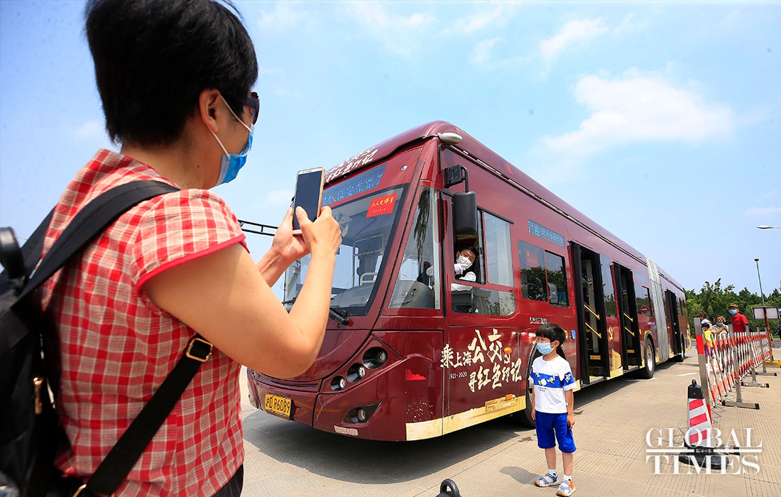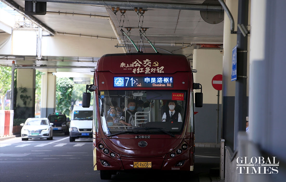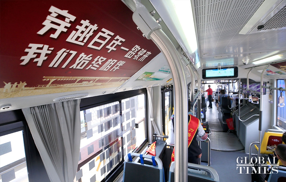 The No. 71 Bus has been put into service in Shanghai with a colorway that celebrates the founding of the Communist Party of China (CPC) on Wednesday. It is painted in the CPC’s iconic red and gold colors, and integrated with the Party's symbol and Shanghai landmarks.(Photos: Yang Hui/GT)