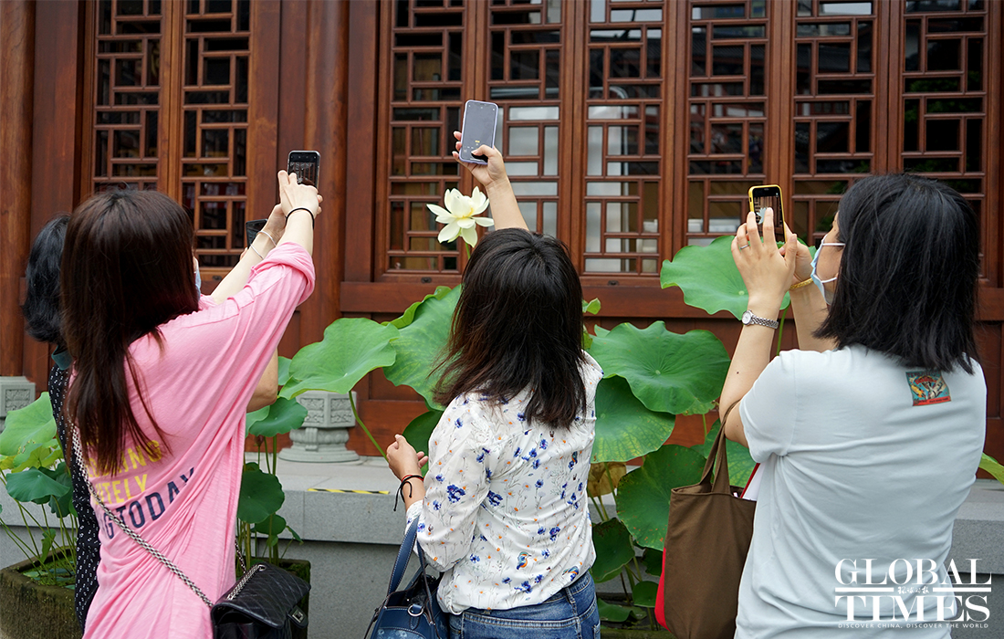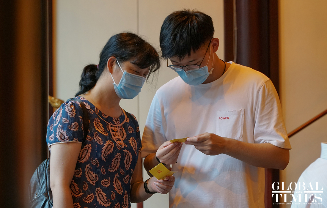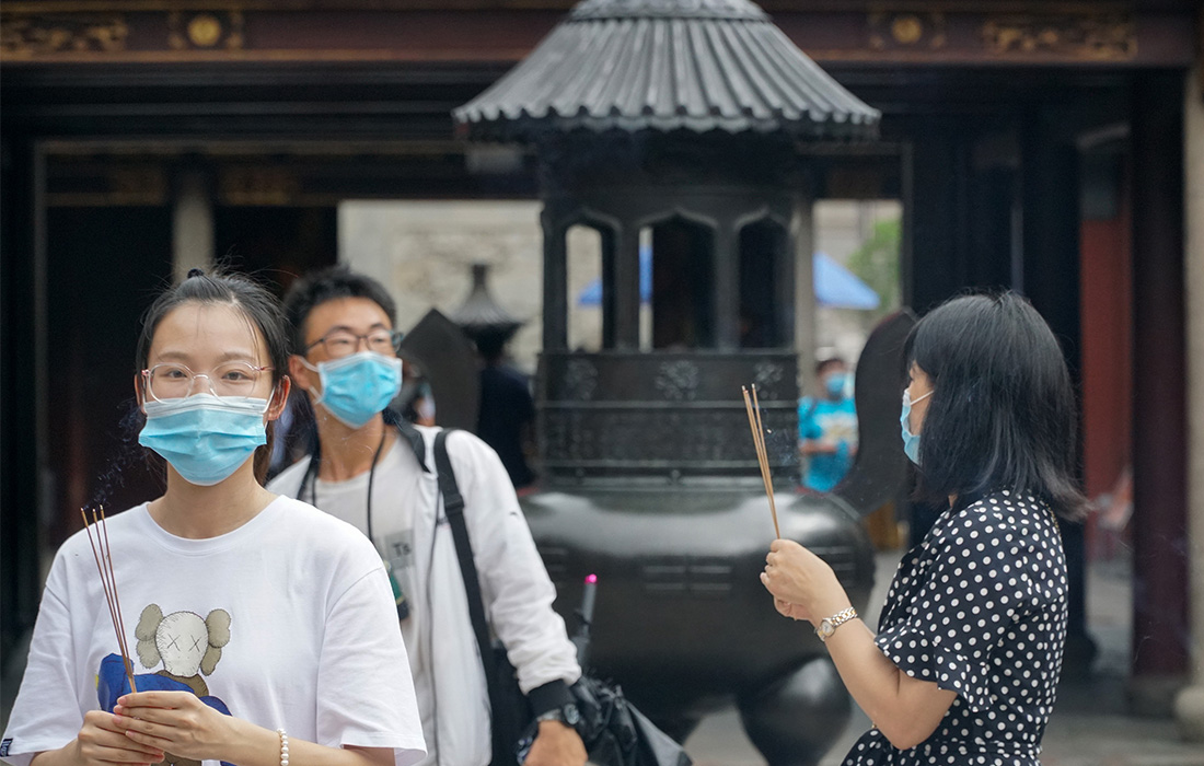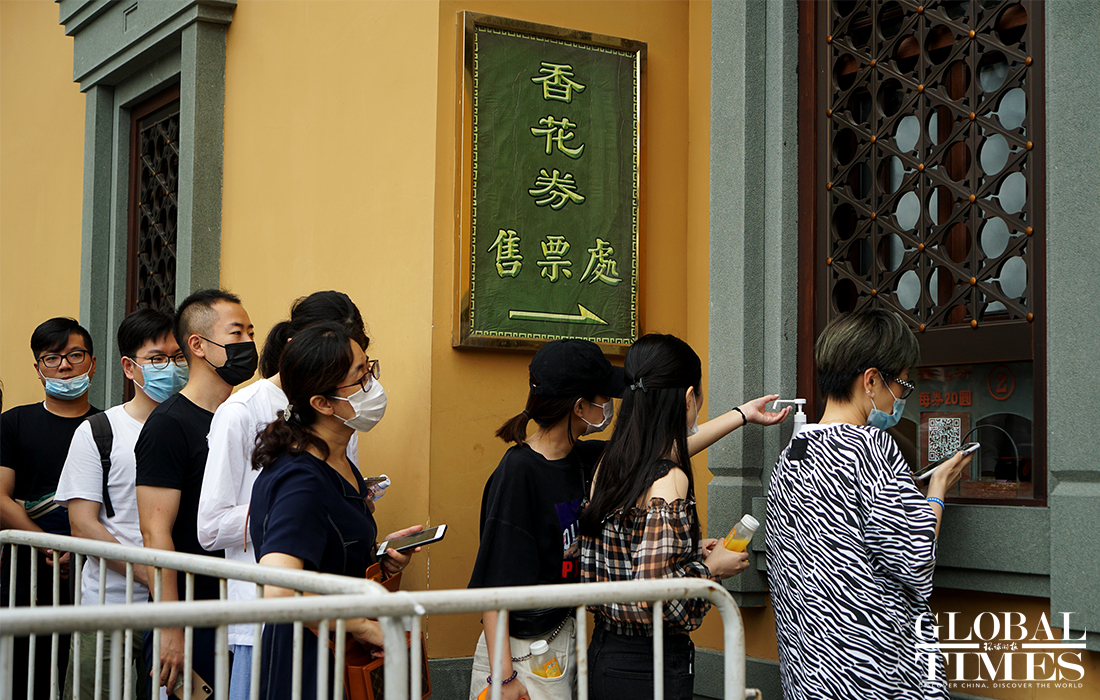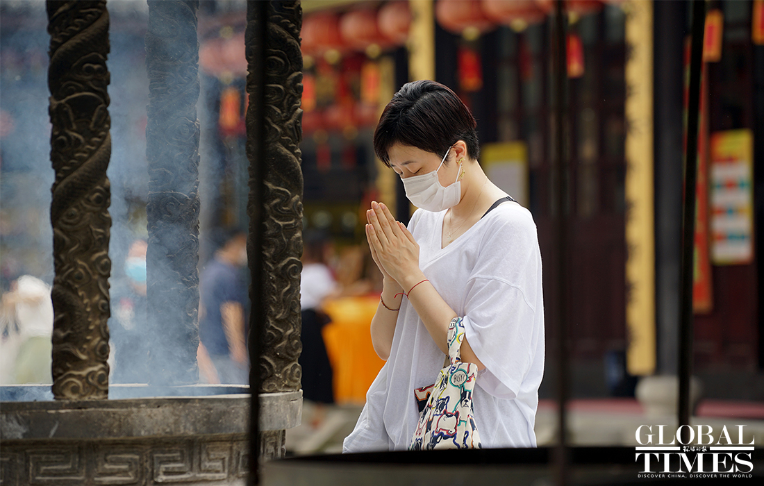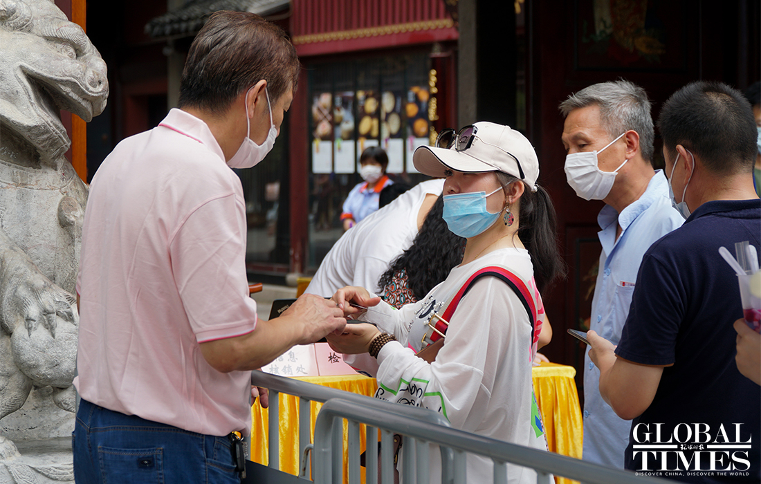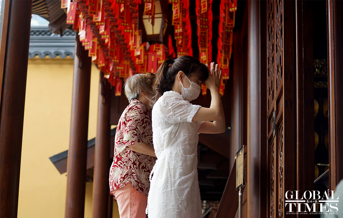Locals and visitors in Shanghai pray for good luck at the Shanghai Yufo Temple and Chenghuang Temple on Friday as the historical sites reopen to the public after being closed for more than 100 days due to the COVID-19 pandemic. To enter the temples, residents need to present a reservation, health code, mask and complete a temperature screening. Photos: Chen Xia and Lu Ting/GT