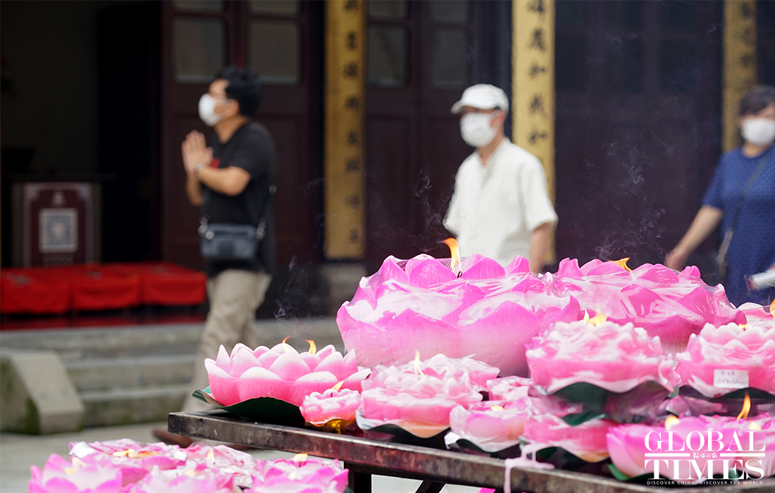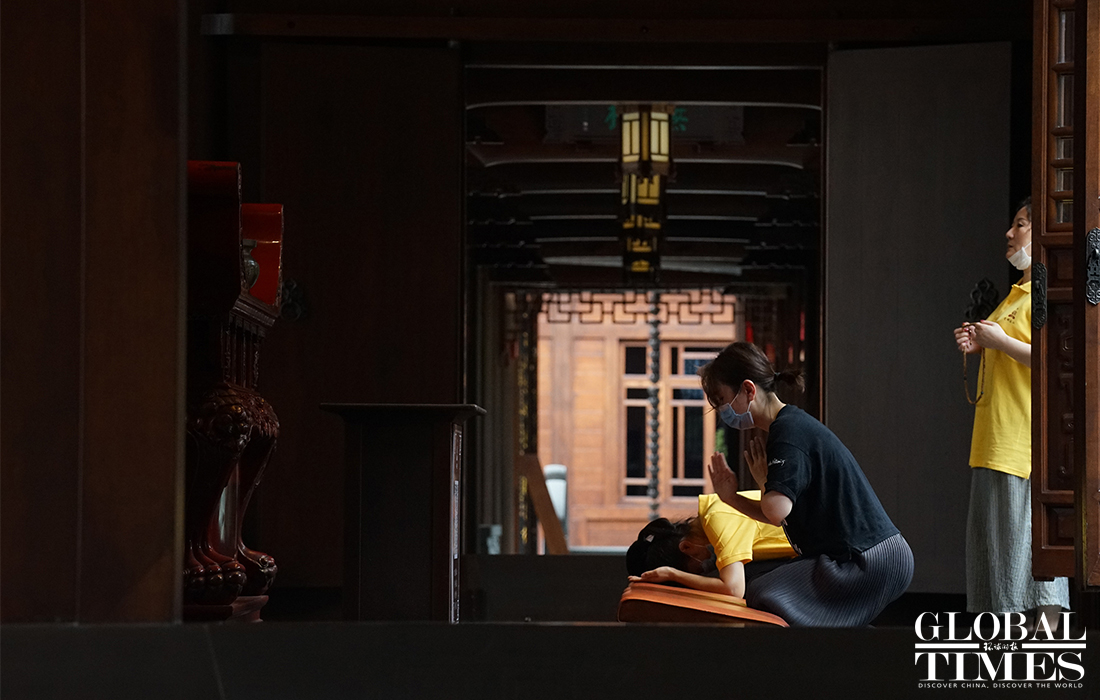 People worship at Shanghai Yufo Temple on July 10. Photo: Chen Xia/GT figcaption >