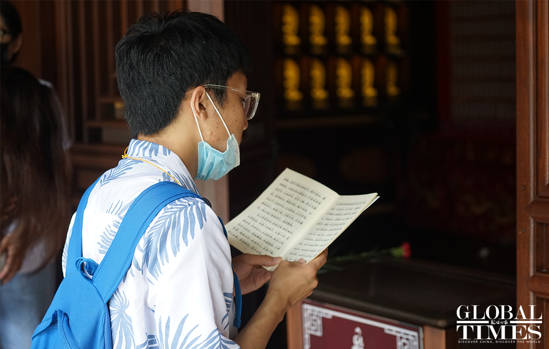 A visitor worships at the Shanghai Yufo Temple on July 10. Photo: Chen Xia/GT figcaption >