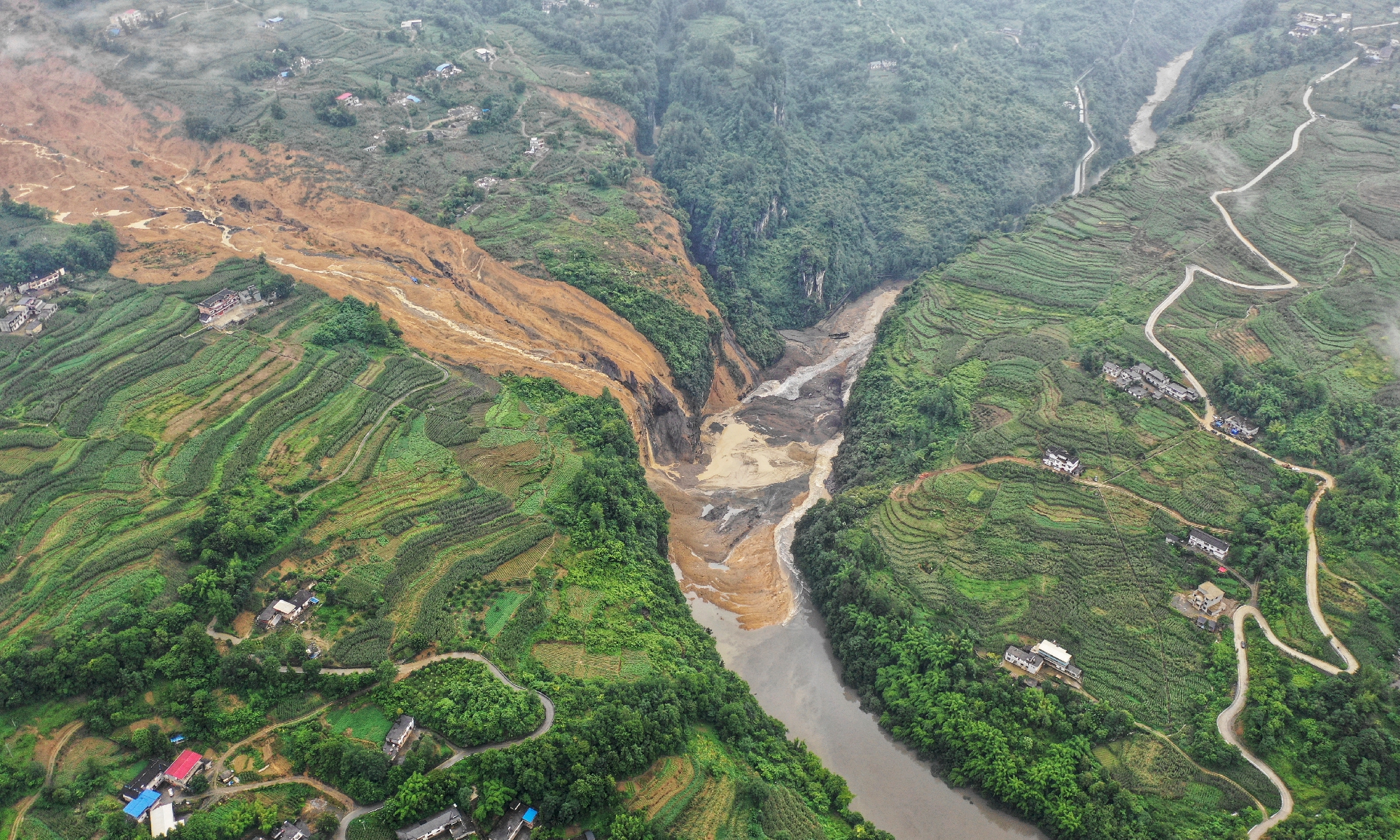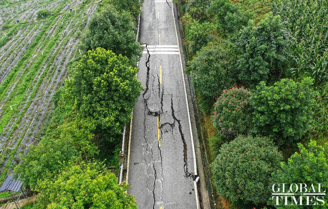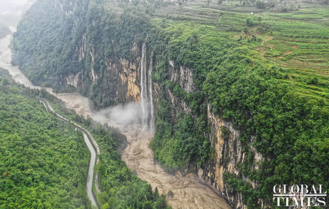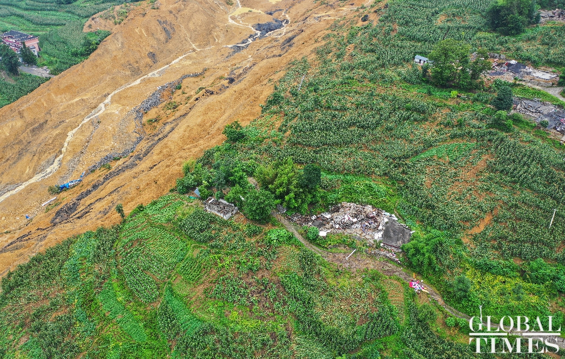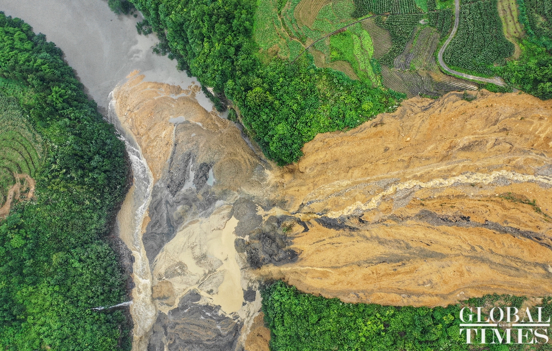 Aerial photos taken on Wednesday shows a landslide near Mazhe village of Enshi Tujia and Miao Autonomous Prefecture in Central China's Hubei Province. The 10-million-cubic-meter landslide has blocked a river and created a barrier lake which threatens nearby villages. Local residents were evacuated from their homes on Tuesday. (Photos: Cui Meng/GT)