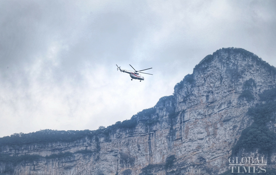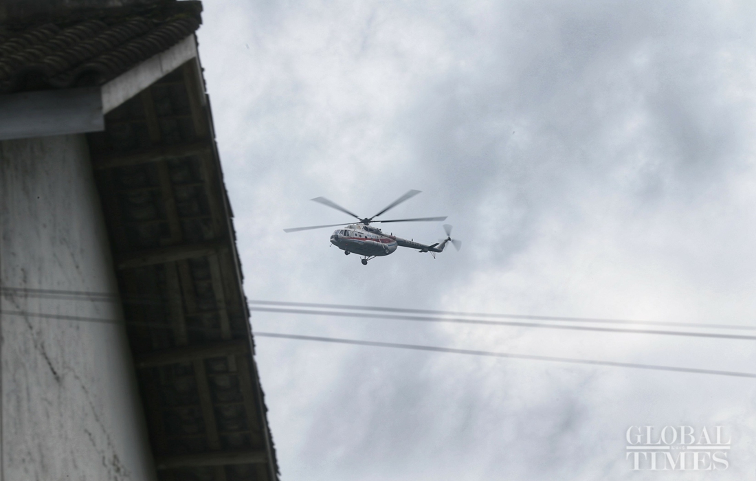 A helicopter flies above Tunbao township to monitor the development of the landslides. Photo: Cui Meng/GT figcaption >