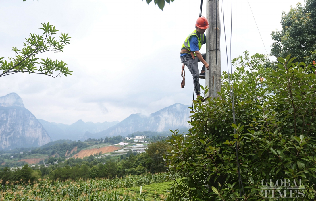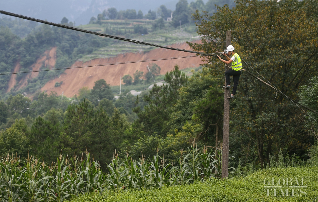 A rescue worker repairs a communication network affected by a landslide in Tunbao township, Enshi, Hubei Province, on Friday. Photo: Cui Meng/GT figcaption >
