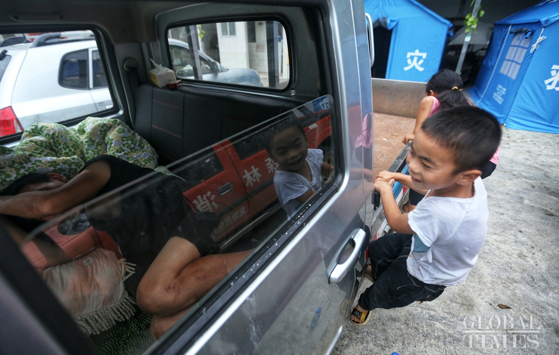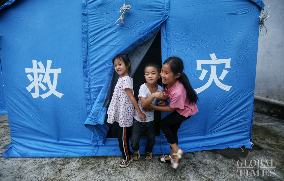 A boy plays with his cousins in evacuation tents on Thursday. Photo: Cui Meng/GT figcaption >