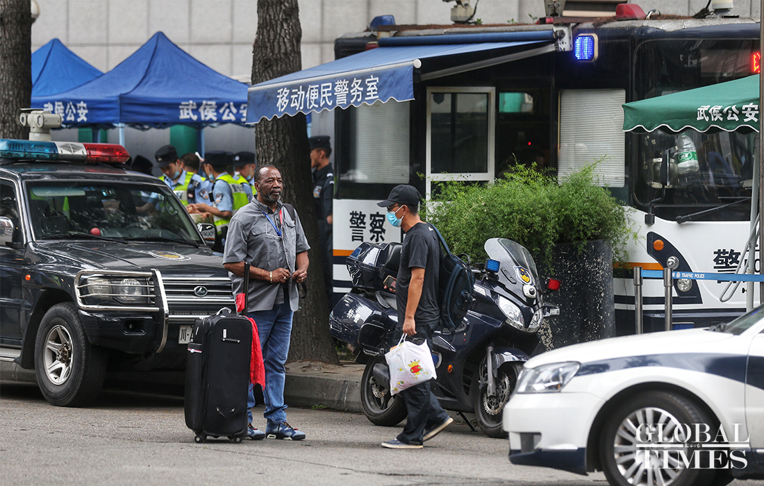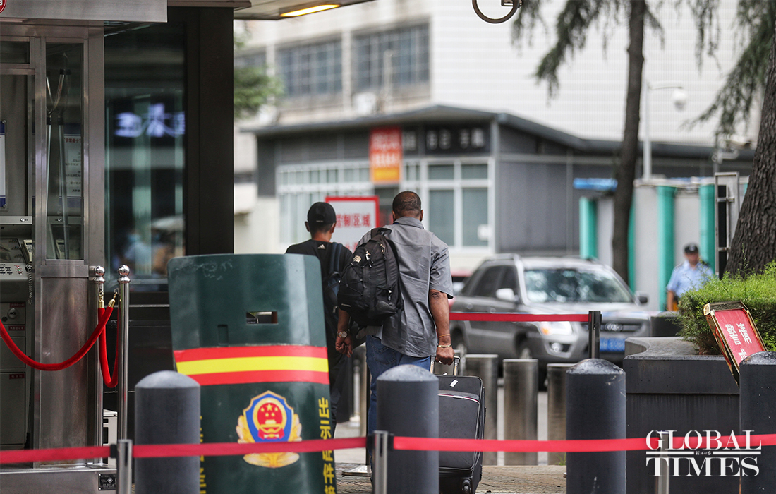 Some foreign workers leave with their luggage from the US Consulate in Chengdu, SW China's Sichuan Province on Saturday. Photo: Cui Meng/GT figcaption >