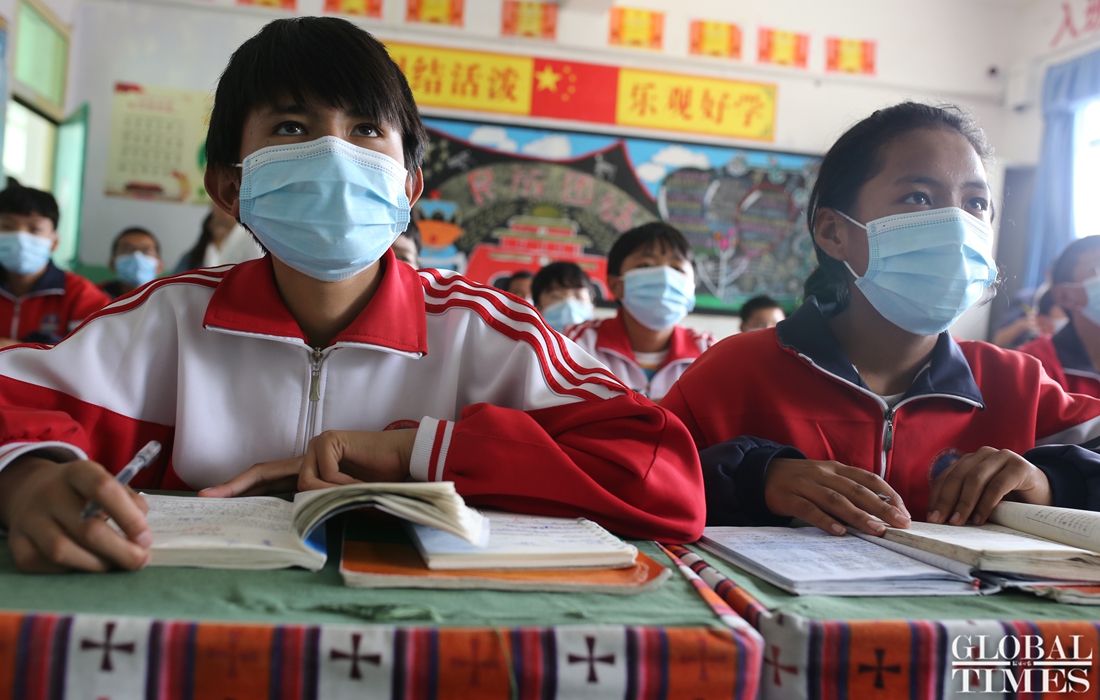 Students in Sangri County Middle School in Shannan, Tibet, take a Tibetan language class on July 28. Education from elementary school to high school is free in Tibet.(Photo: Zhao Juecheng) figcaption >