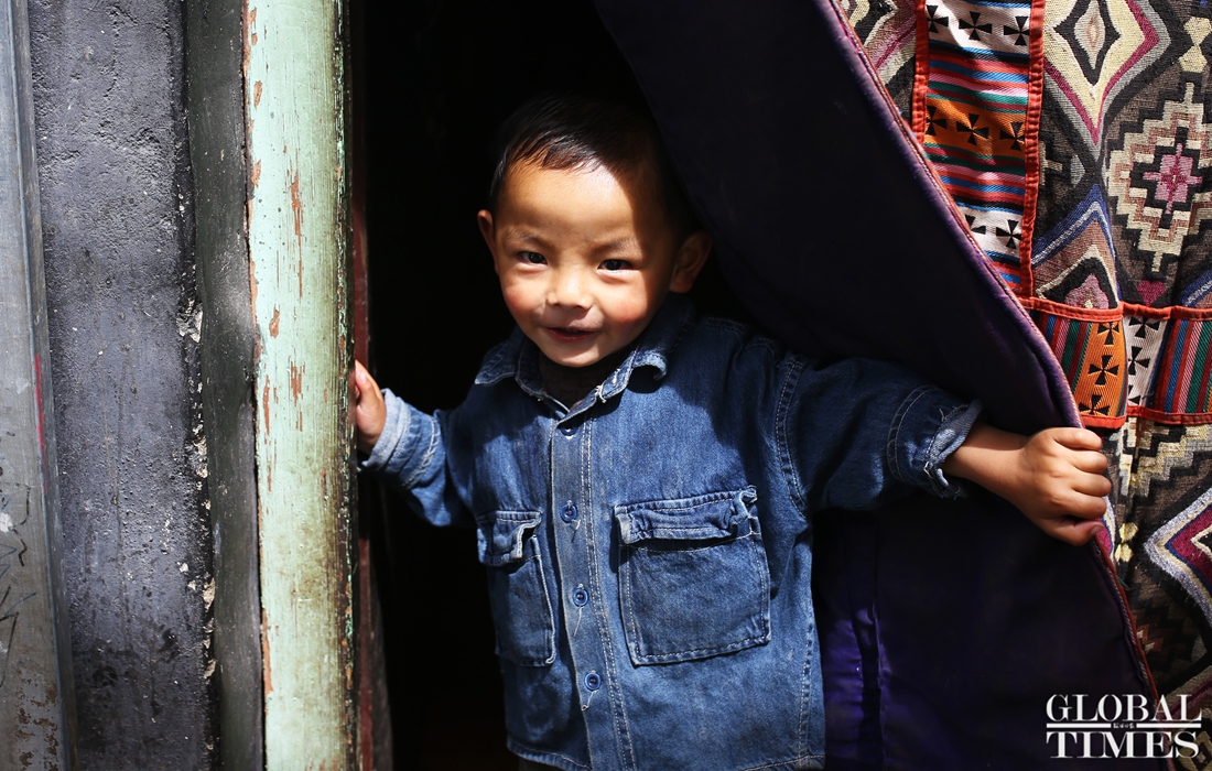 A child coming out of his home in Cuomai Village, Lhasa, Tibet on August 1.(Photo: Zhao Juecheng) figcaption >