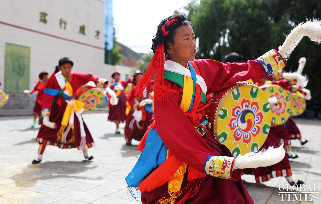 Students of Sangri County Middle School in Shannan, Tibet, perform a traditional dance called Zhuoba on July 28.(Photo: Zhao Juecheng) figcaption >