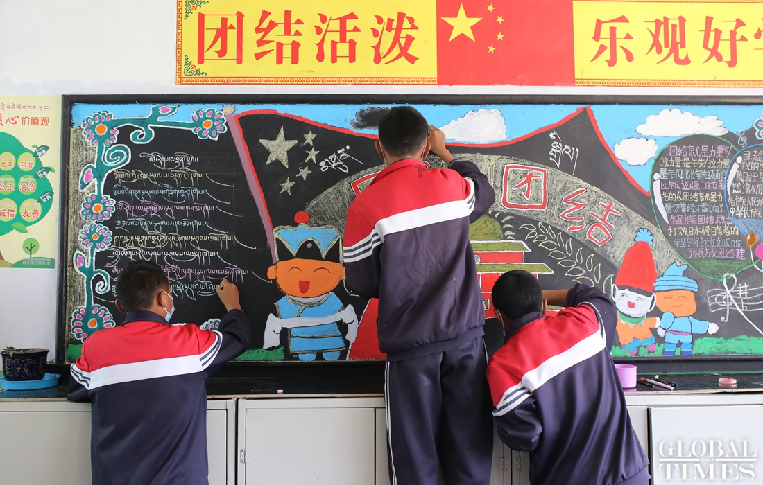 Students of the Sangri County Middle School in Shannan, Tibet, make a blackboard notice on July 28.(Photo: Zhao Juecheng) figcaption >