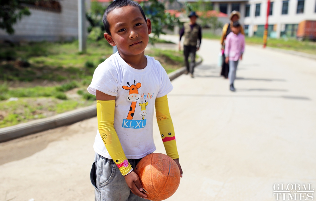 A boy plays basketball in Gongkang Village, Shannan, Tibet on July 27.(Photo: Zhao Juecheng) figcaption >