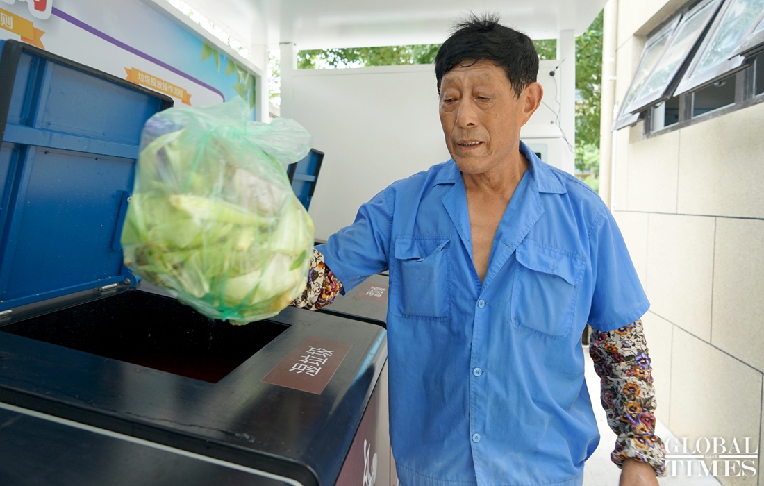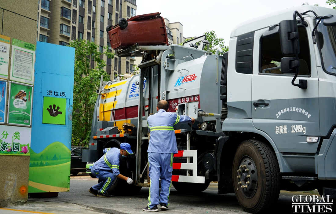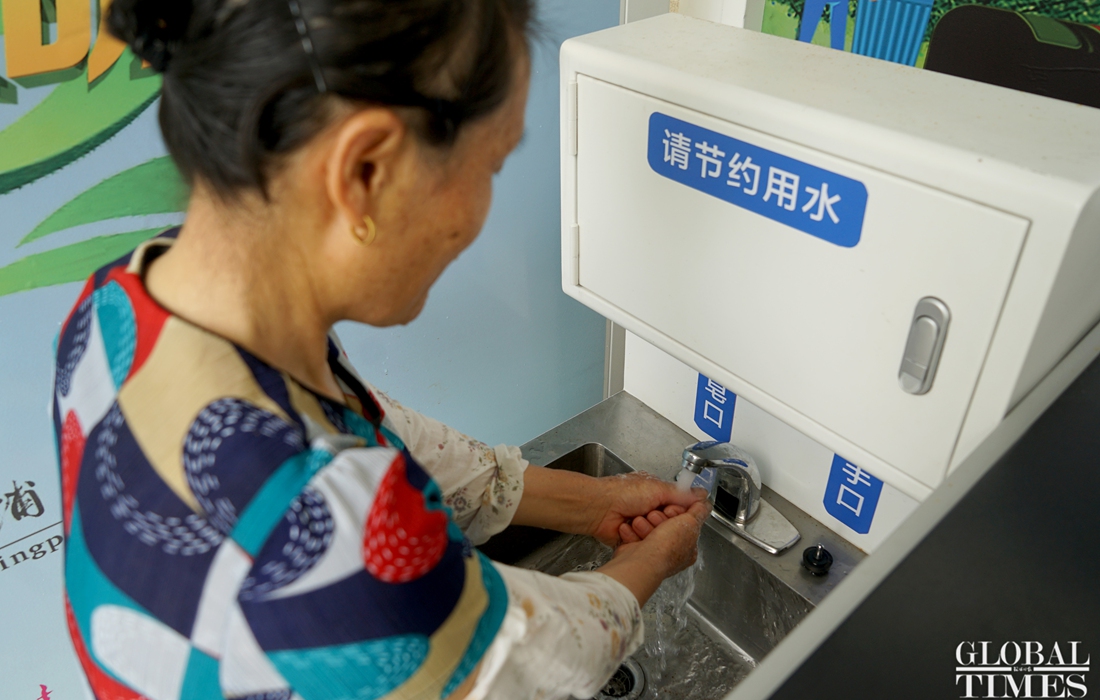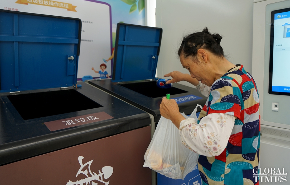 Shanghai's communities have become the first to trial an innovative, smart garbage recycling system. The communities’ trash bins use facial recognition technology to open automatically and close after trash is thrown inside. It is complete with an ultraviolet disinfection system, intelligent observation capabilities and induction faucets to provide a clean and “touchless” garbage disposal experience. (Photos: Chen Xia/GT)