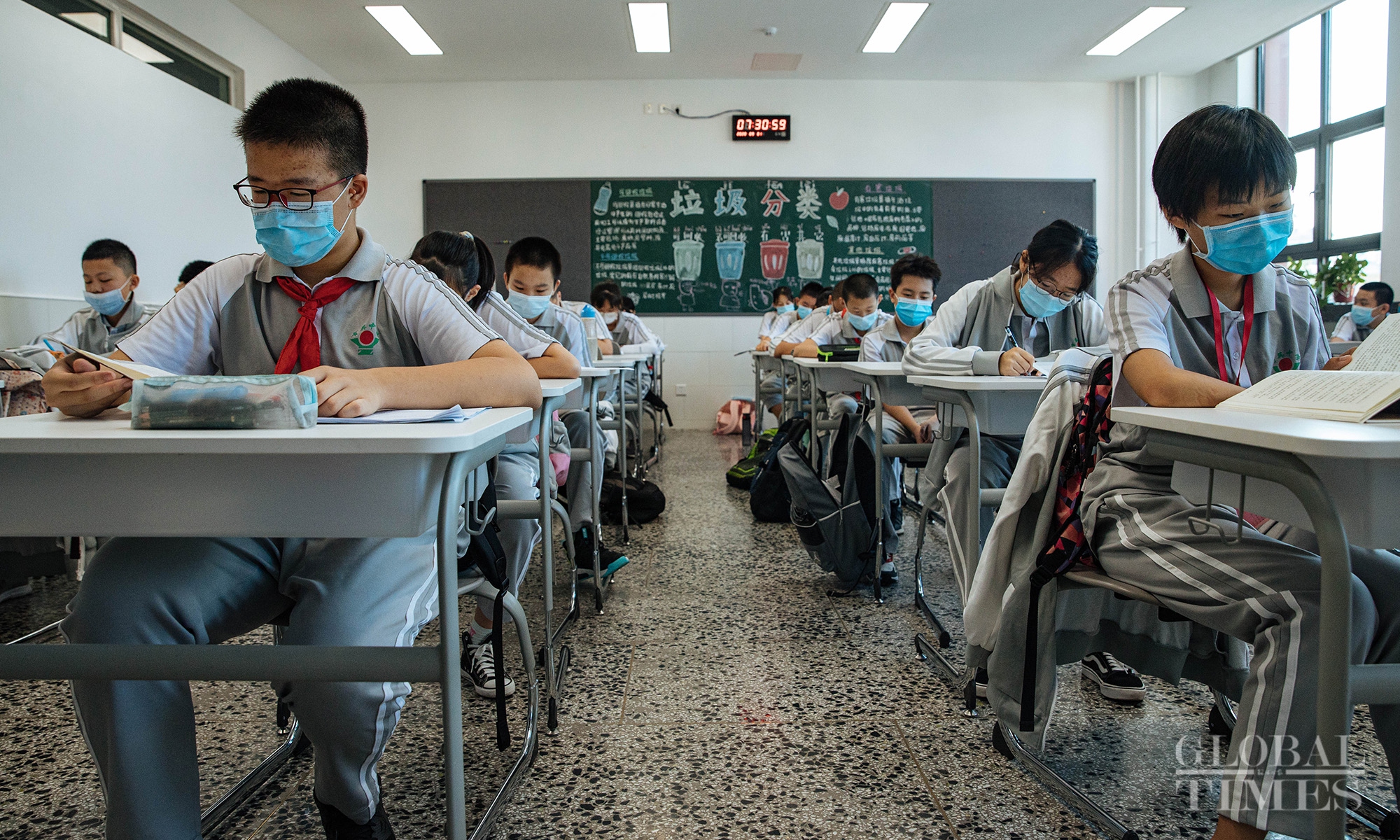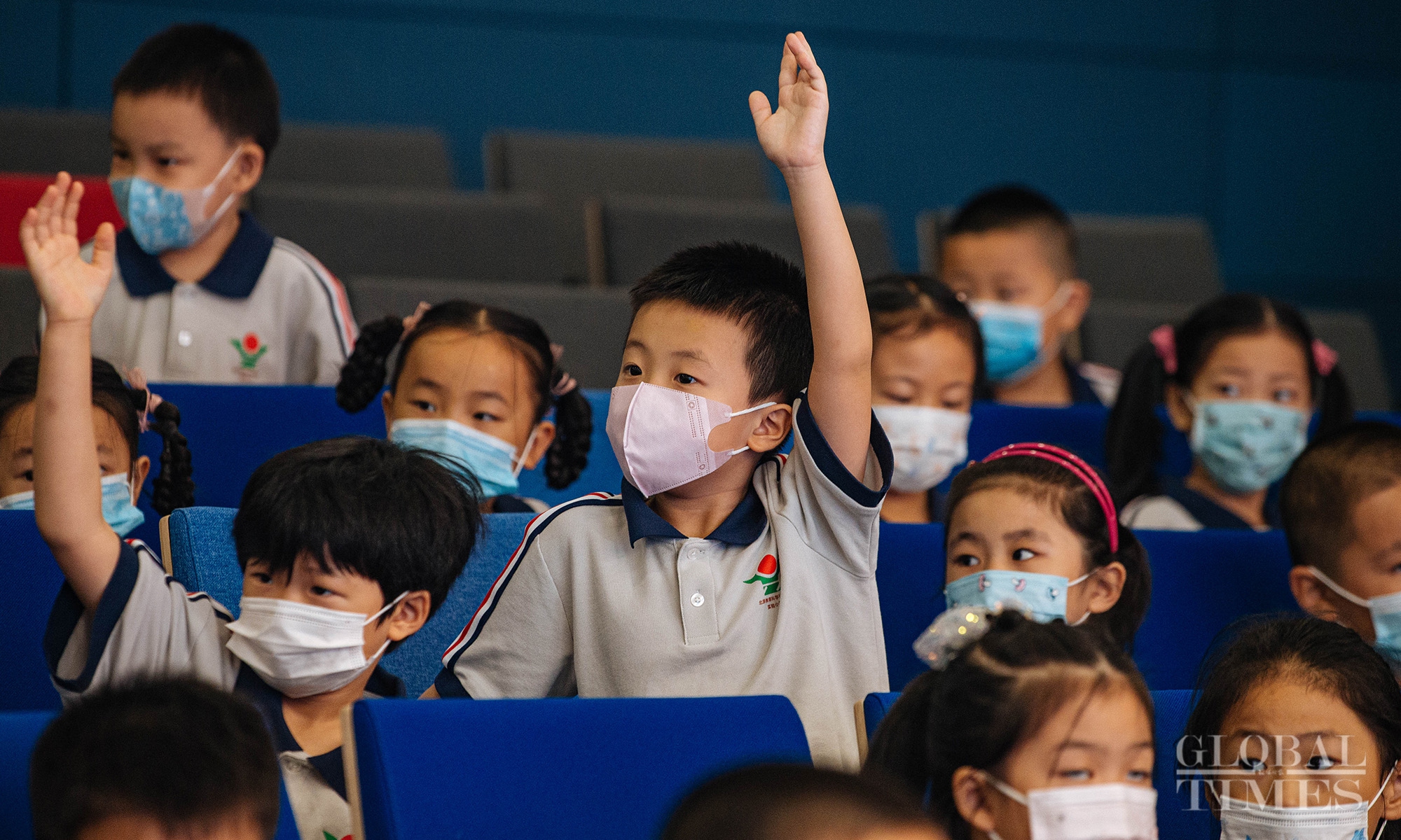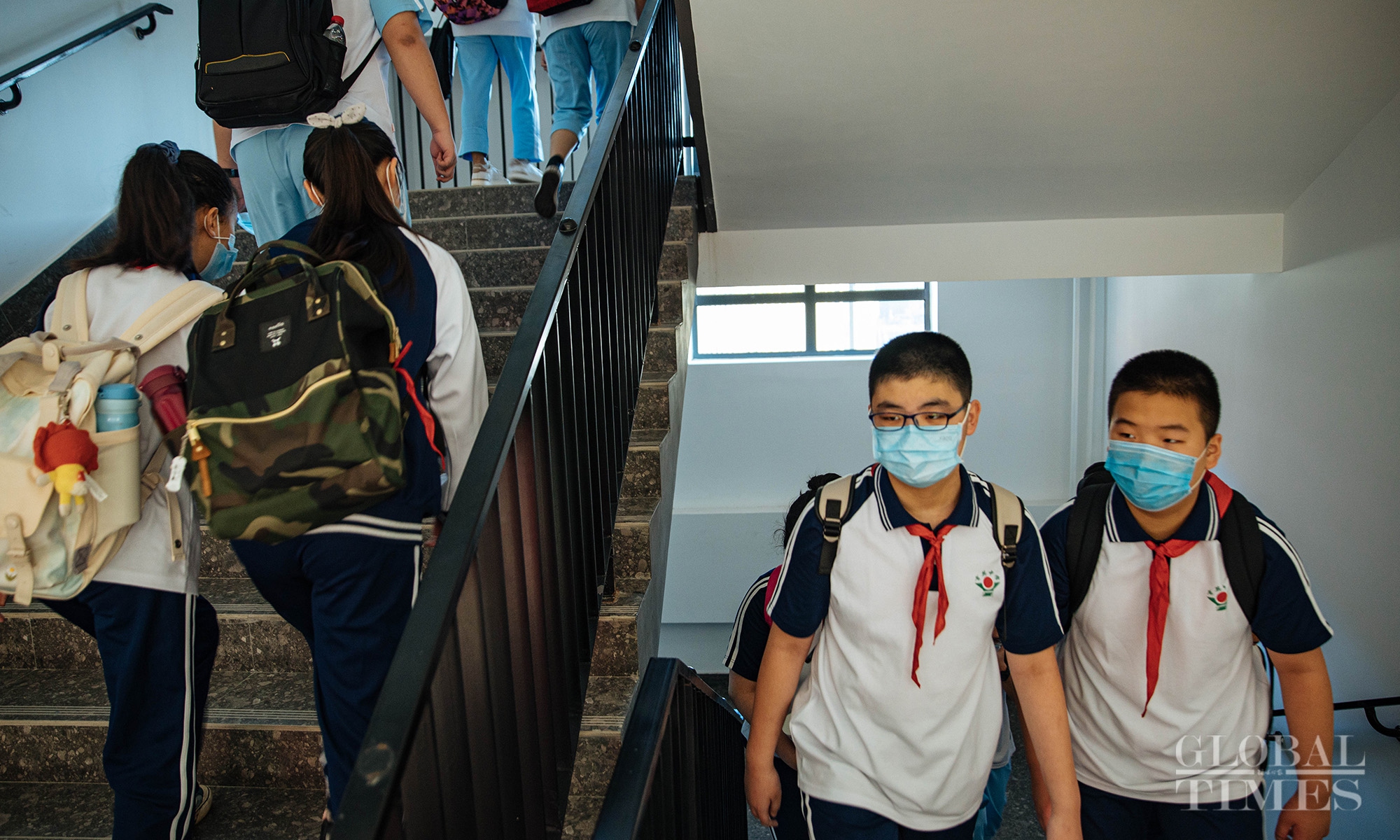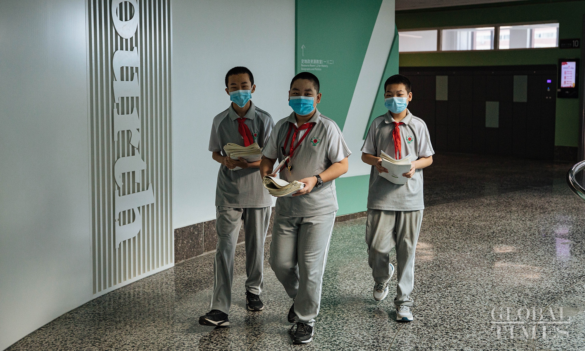 With the second outbreak of COVID-19 in Beijing brought under control, students were welcomed back into school Tuesday. Schools arranged for their students to watch a pre-recorded school-opening ceremony in classrooms to celebrate the new semester and avoid large scale gatherings. PE classes and outdoor activities will be held as normal, but with strict COVID-19 control precautions in place. Photos: Li Hao/GT