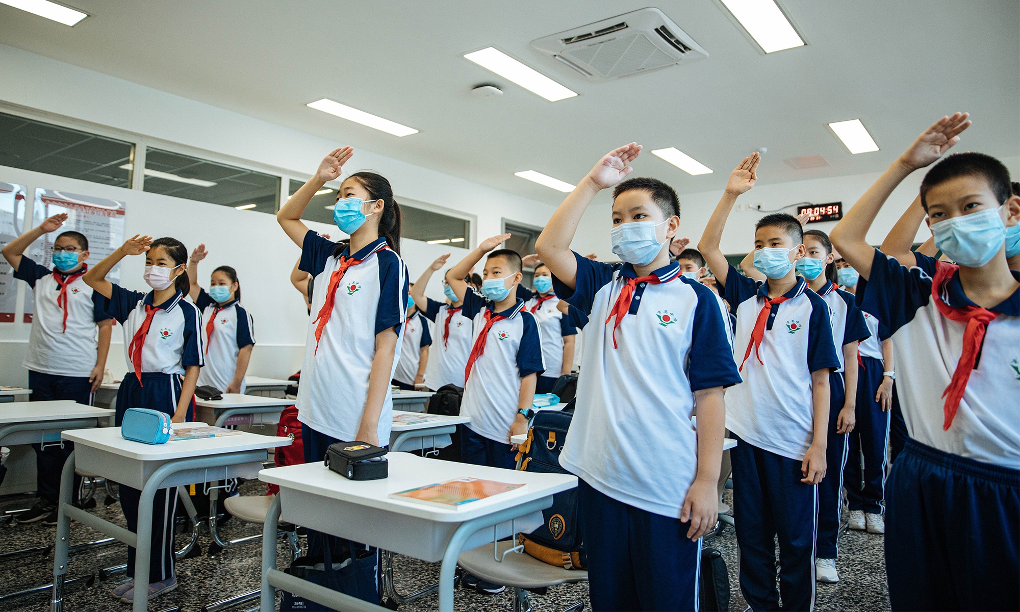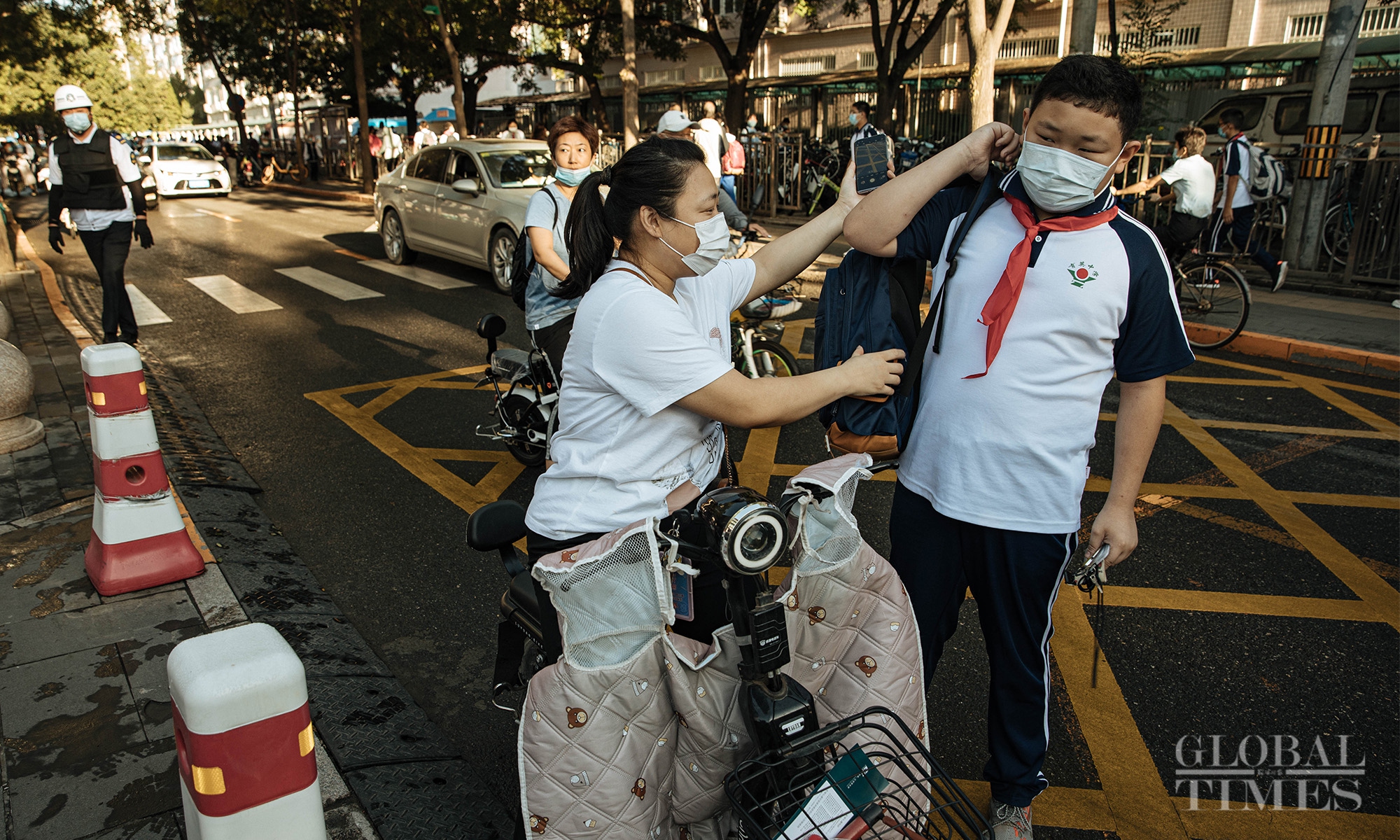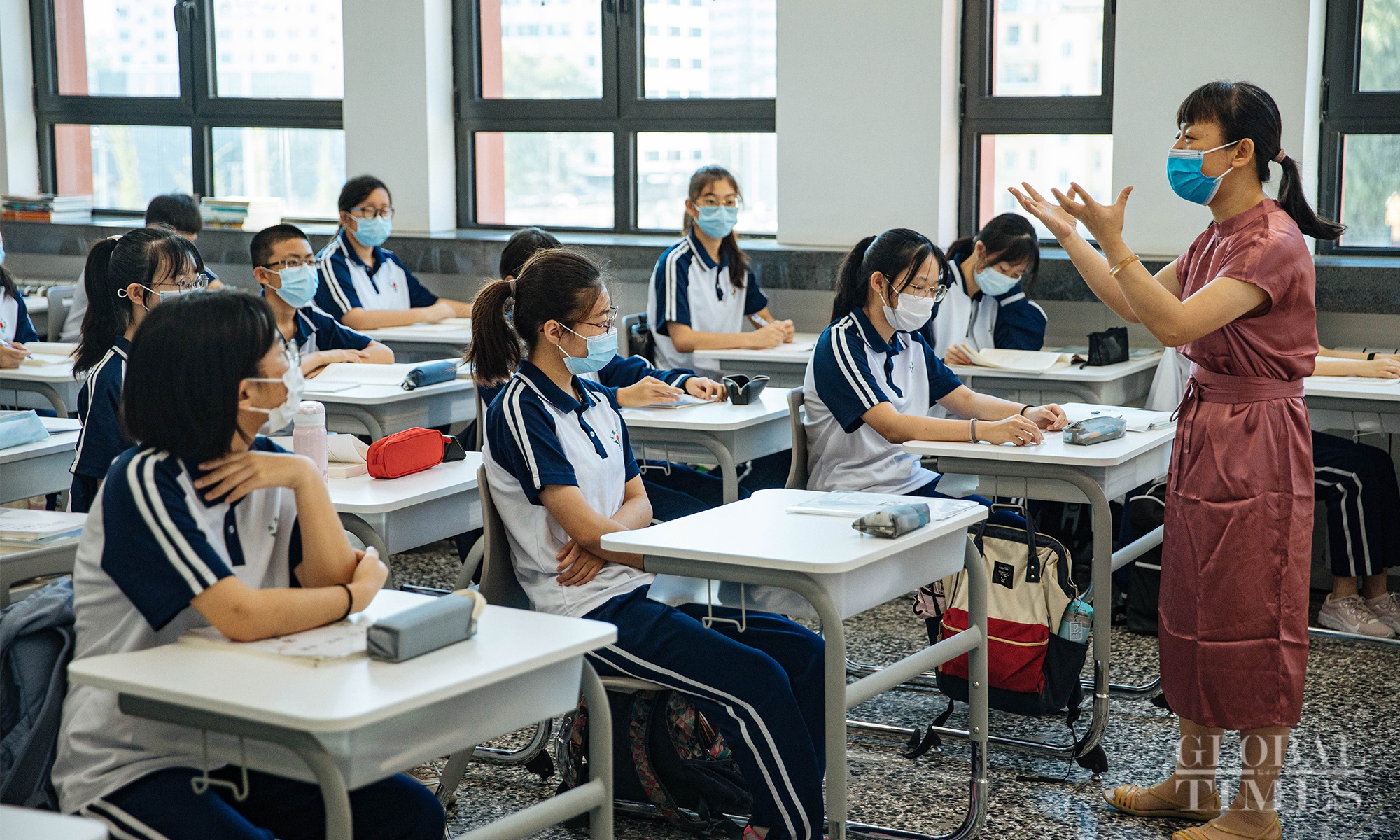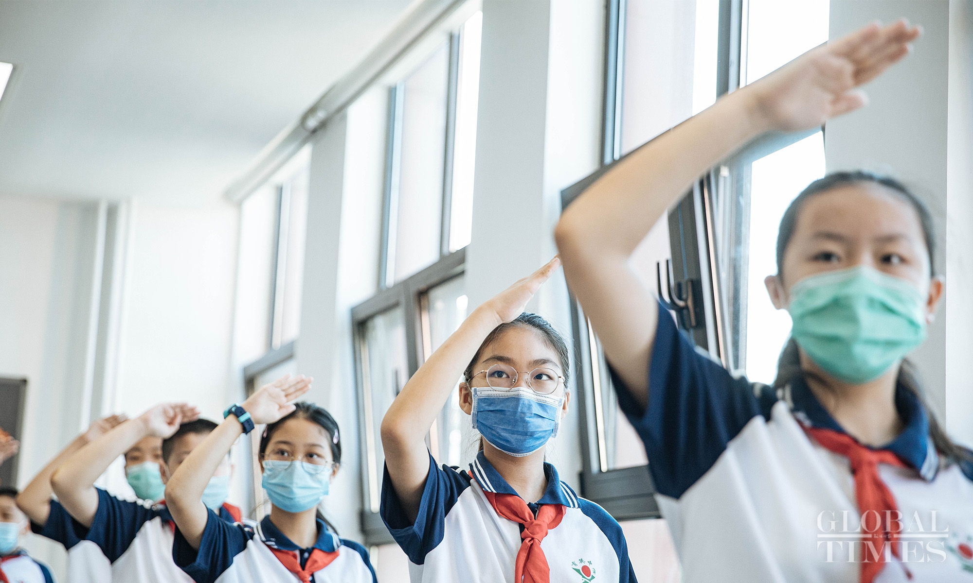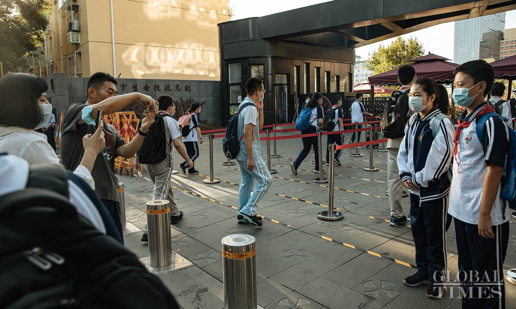 With the second outbreak of COVID-19 in Beijing brought under control, students were welcomed back into school Tuesday. Schools arranged for their students to watch a pre-recorded school-opening ceremony in classrooms to celebrate the new semester and avoid large scale gatherings. PE classes and outdoor activities will be held as normal, but with strict COVID-19 control precautions in place. Photos: Li Hao/GT