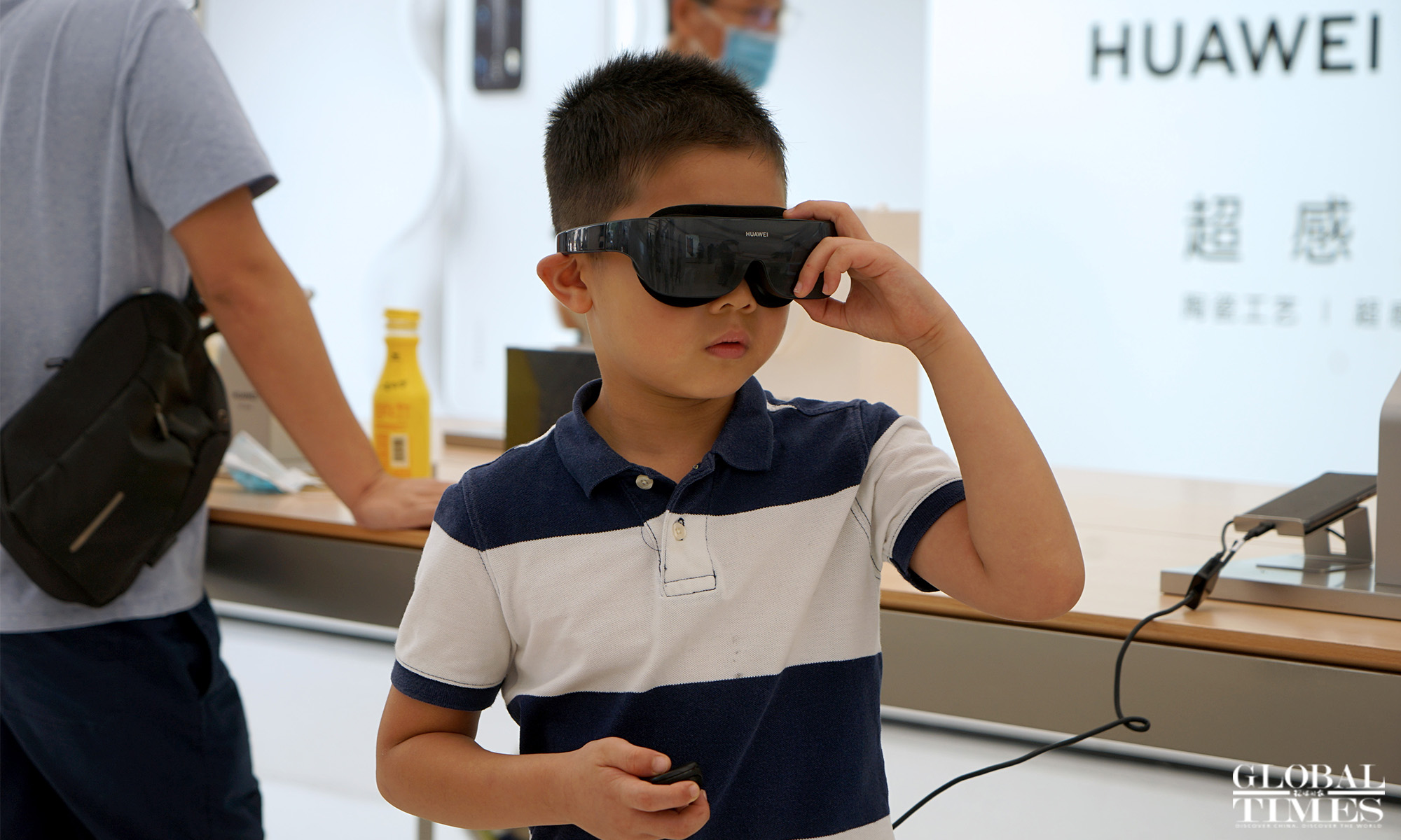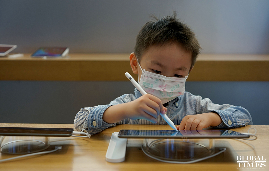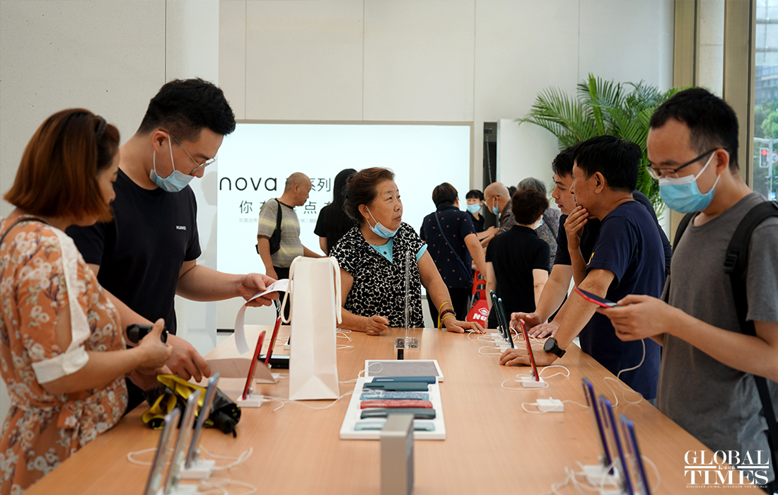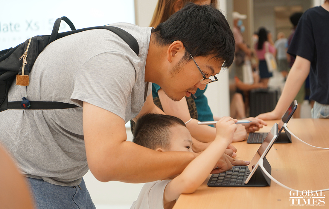 On Shanghai’s landmark West Nanjing Road, Apple and Huawei have opened stores next to each other and both were packed with customers on Sunday. The Apple store’s return-to-school promotion attracted parents and children who tried its electronic products during the weekend. At the Huawei store, customers can not only pick and try out products, they can also listen to speeches on mobile phone use. Photos: Chen Xia/GT