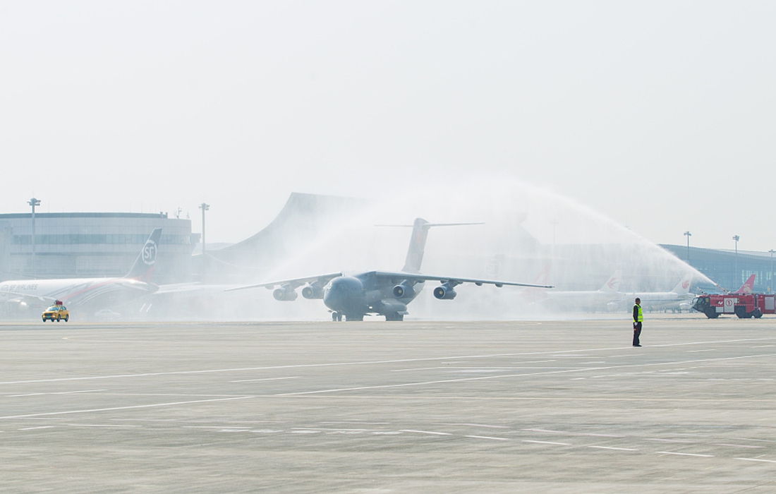 As China’s domestically developed Y-20 transport aircraft landed at Shenyang Taoxian International Airport in Shenyang, NE China's Liaoning Province,two fire-fighting trucks sprayed a "water gate" to show the highest respect for the remains of 117 Chinese soldiers killed in the Korea War (1950-53), Sept. 27, 2020. Photo: VCG figcaption >