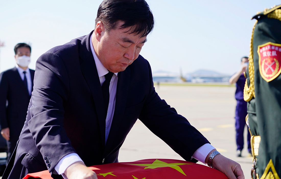 Chinese ambassador to S.Korea Xing Haiming placed a Chinese national flag on a coffin carrying remains of a soldier killed in Korean War (1950-53) at Incheon International Airport in Incheon, the Republic of Korea (ROK), Sept. 27, 2020. Photo: CNSphoto figcaption >