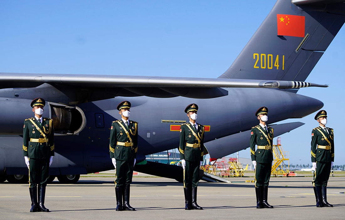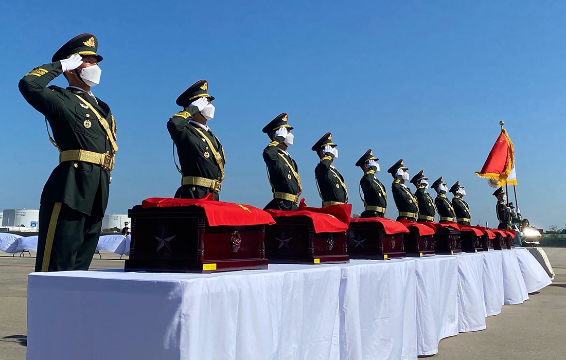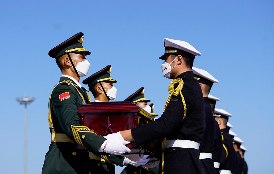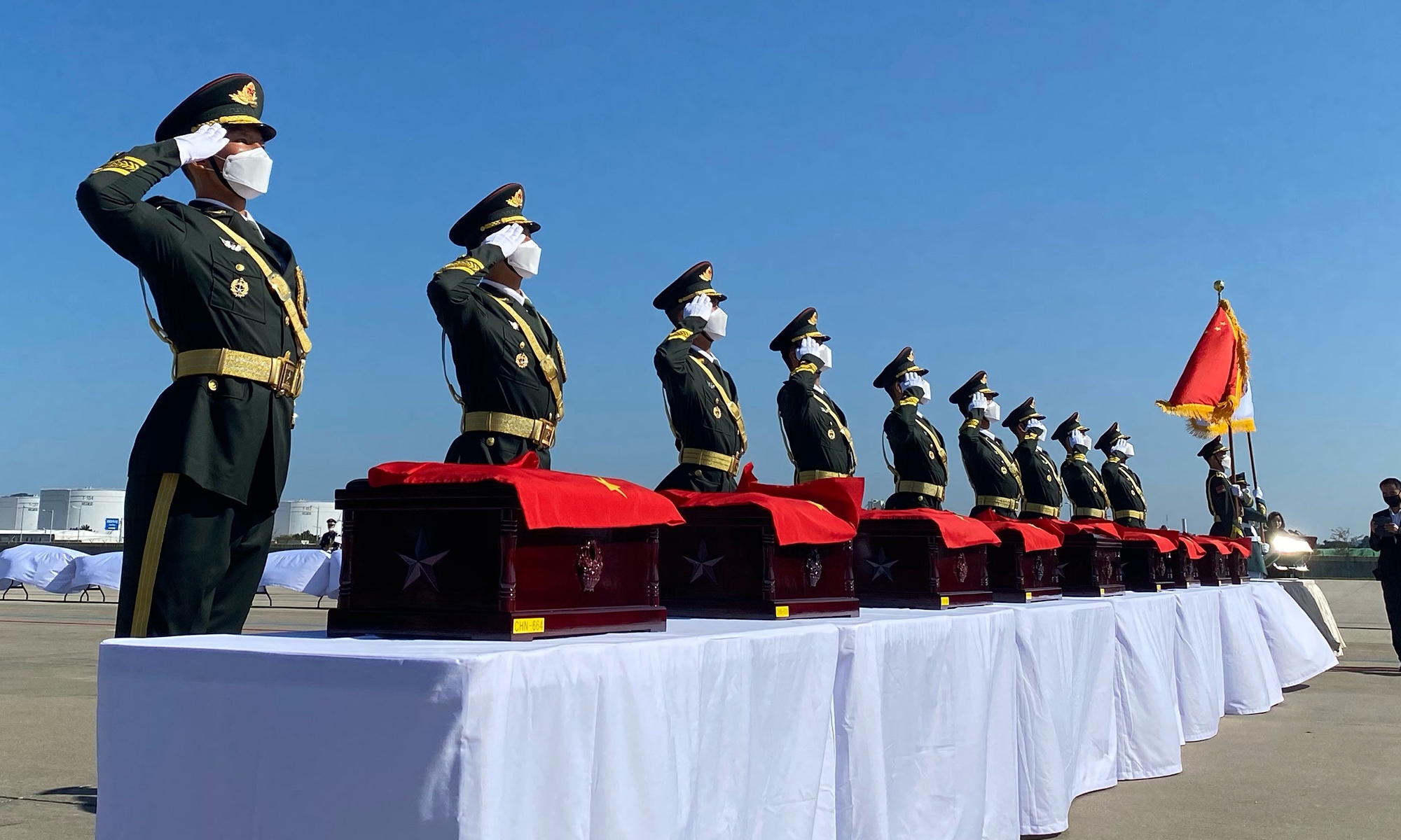 Chinese soldiers wait to receive coffins containing remains of Chinese soldiers killed in the 1950-53 Korean War from South Korea during a repatriation ceremony at Incheon International Airport in Incheon, South Korea, Sept. 27, 2020. Photo: CNSphoto figcaption >