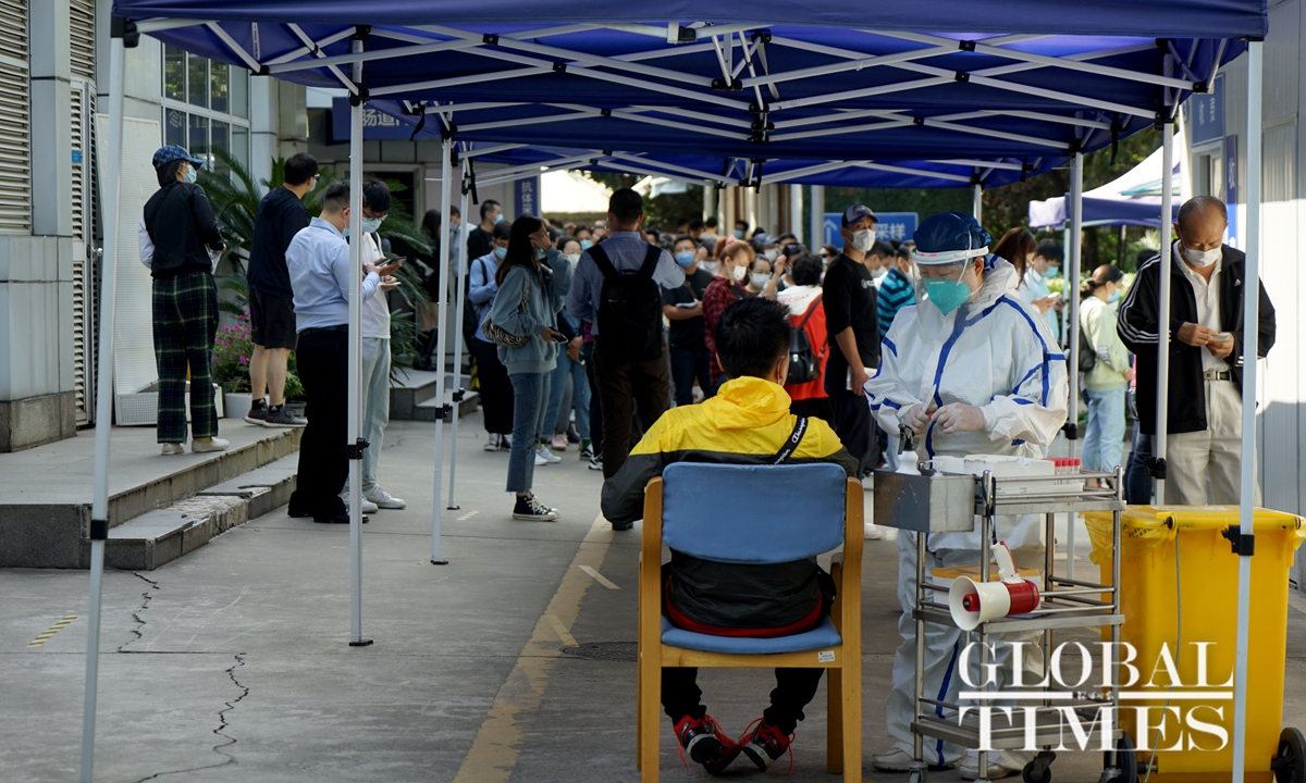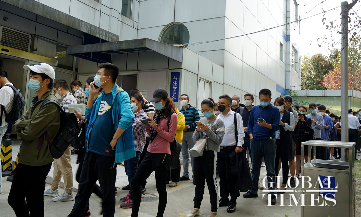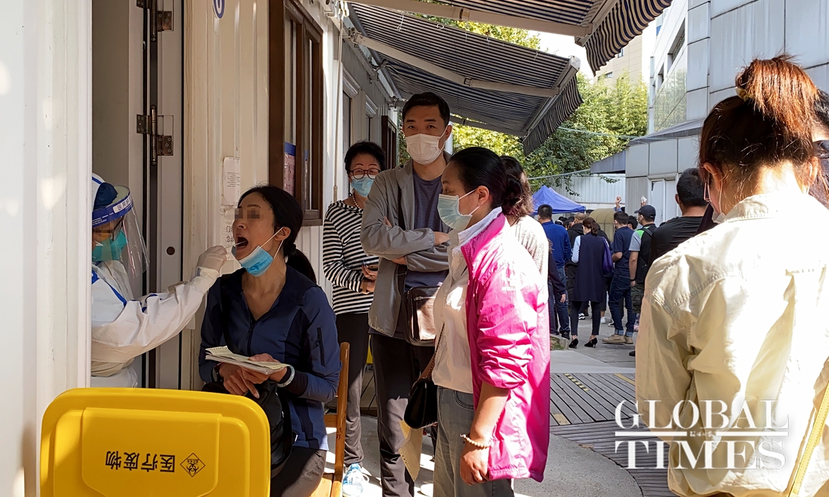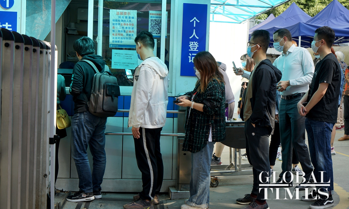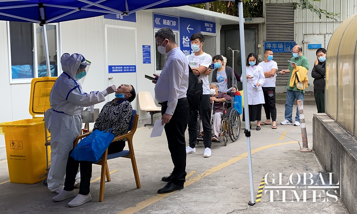 Residents were seen waiting patiently in long queues to take nucleic acid tests for COVID-19 at a Shanghai hospital on Tuesday morning. Each test costs 120 yuan ($17.7). A young man, who preferred to be unnamed, told the Global Times on Tuesday that he needed proof of a negative test result before returning to work as he traveled to Qingdao in East China’s Shandong Province during the recent holidays.