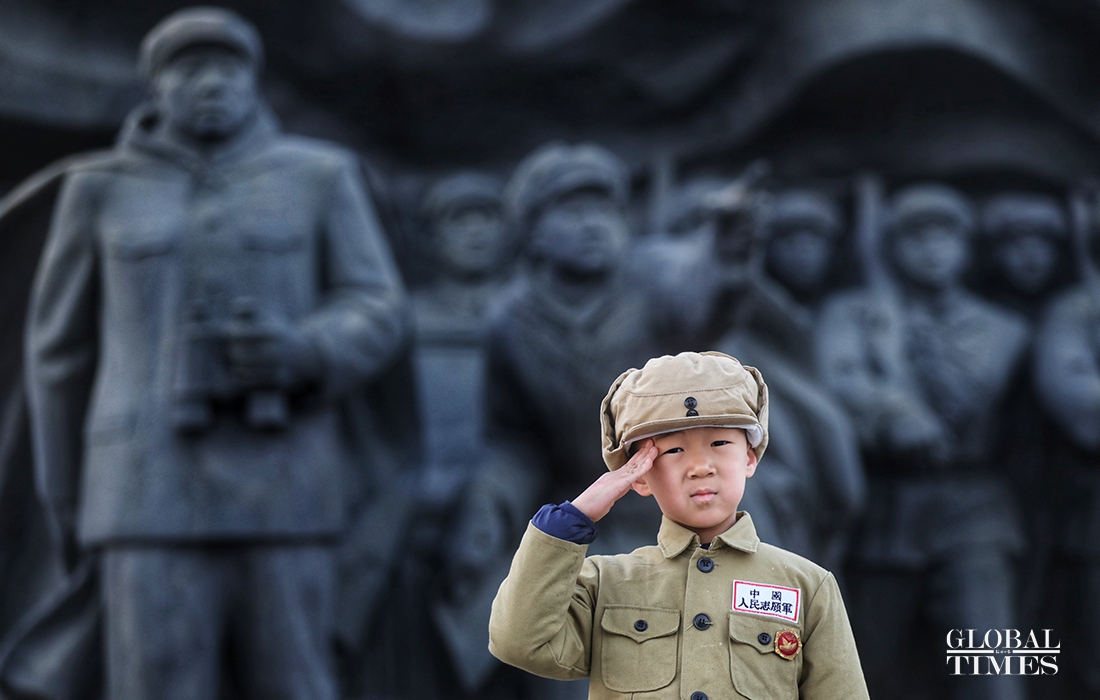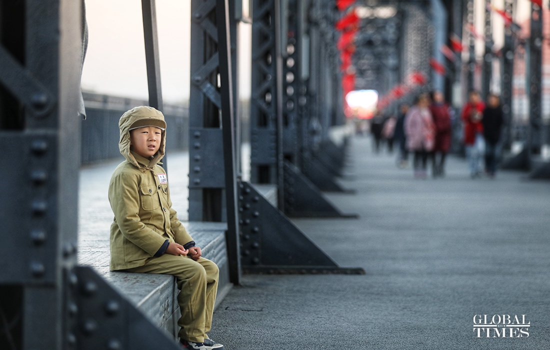 Huhu, a 6-year-old boy, wears a costume based on the CPV uniform and visits the Yalu River Broken Bridge with his grandmother and mother. 70 years ago, his great grandfather went to join the War to Resist US Aggression and Aid Korea from here. The three generations came to Dandong from Beijing to commemorate the 70th anniversary. Huhu's mother put his great grandfather's memorial medal on him. (Photo: Cui Meng/GT)