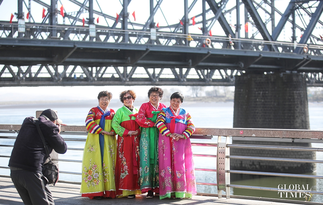 People enjoy wearing Korean traditional costumes and taking pictures at the shore of the Yalu river.(Photo: Cui Meng/GT) figcaption >