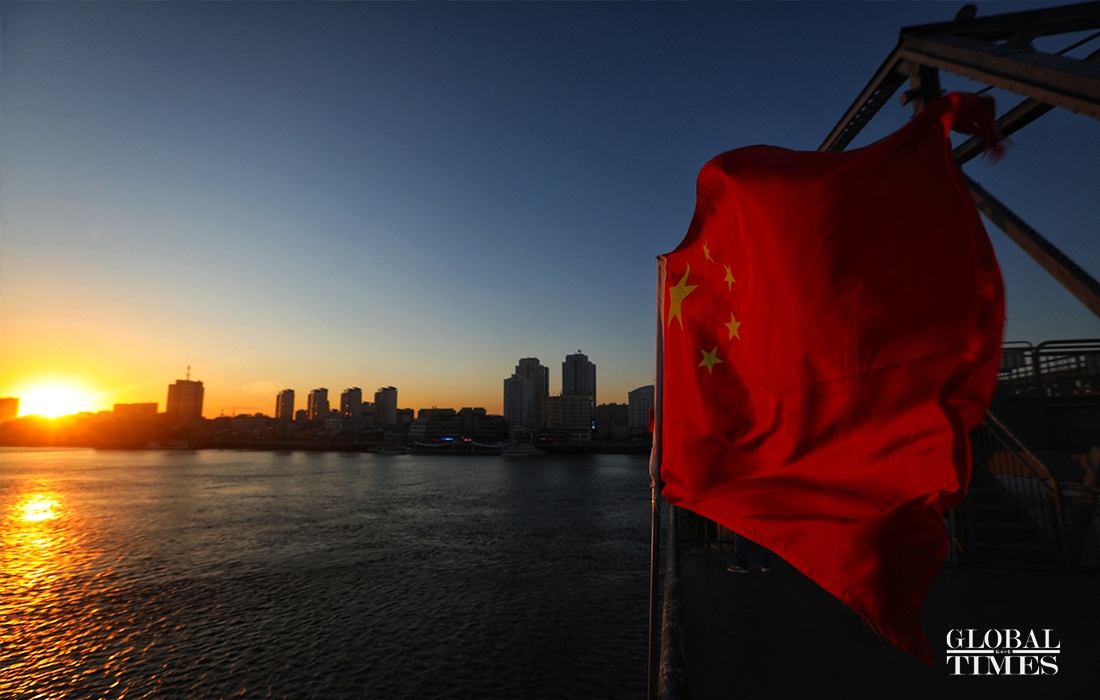 A red flower is placed on the sculpture of "Hero Air Force" on the shore of the Yalu River.(Photo: Cui Meng/GT) figcaption >