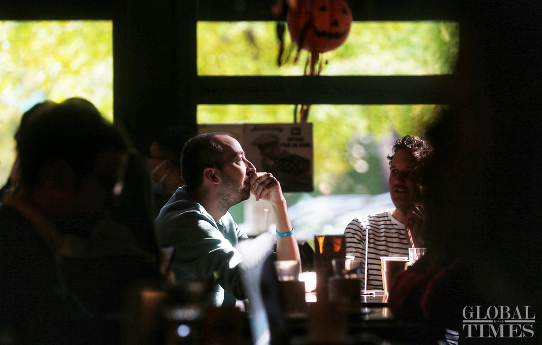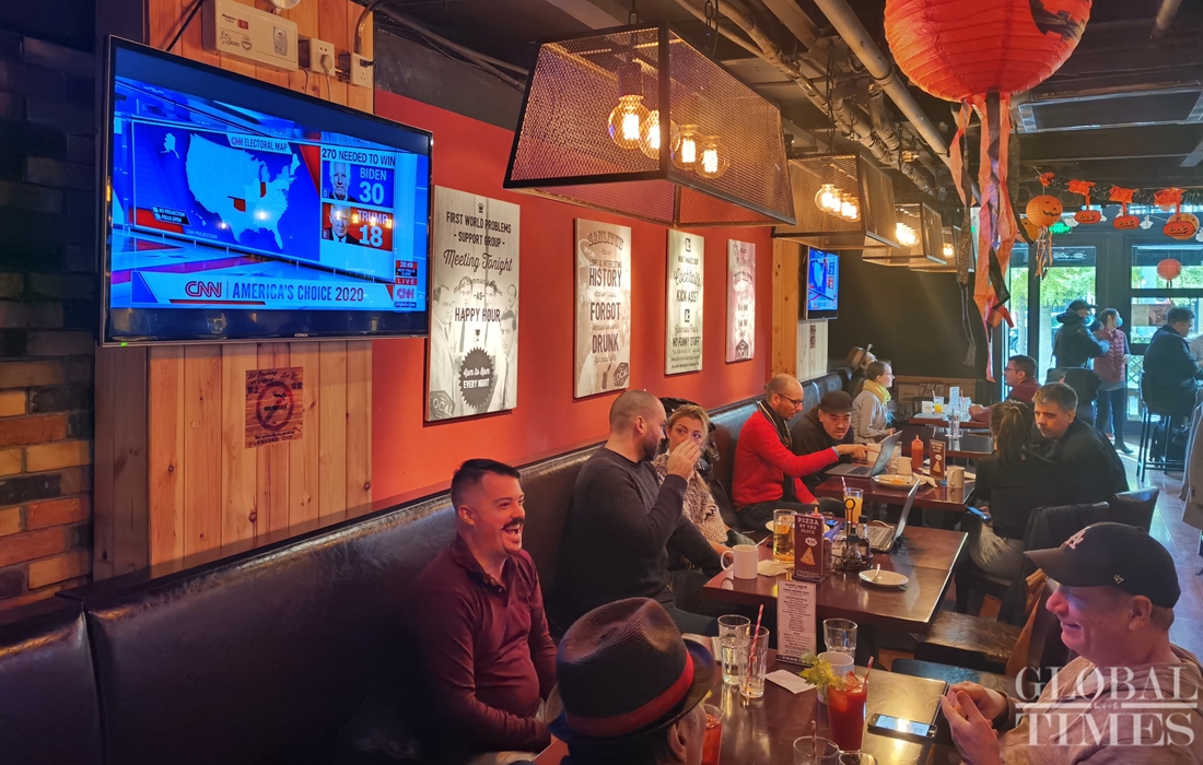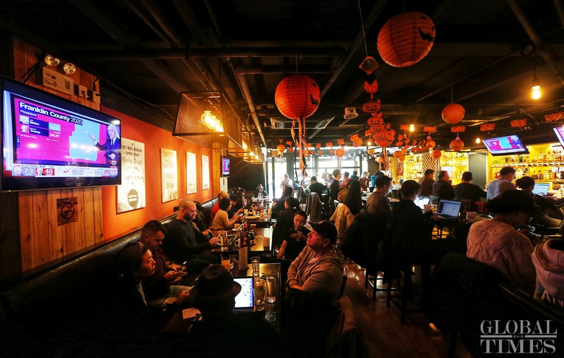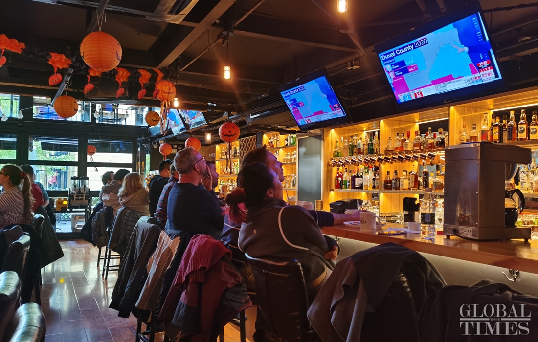 Many foreigners gather at a bar in Beijing to watch the US election live early Wednesday morning. People have to choose different colored bracelets according to which candidate they support before entering.