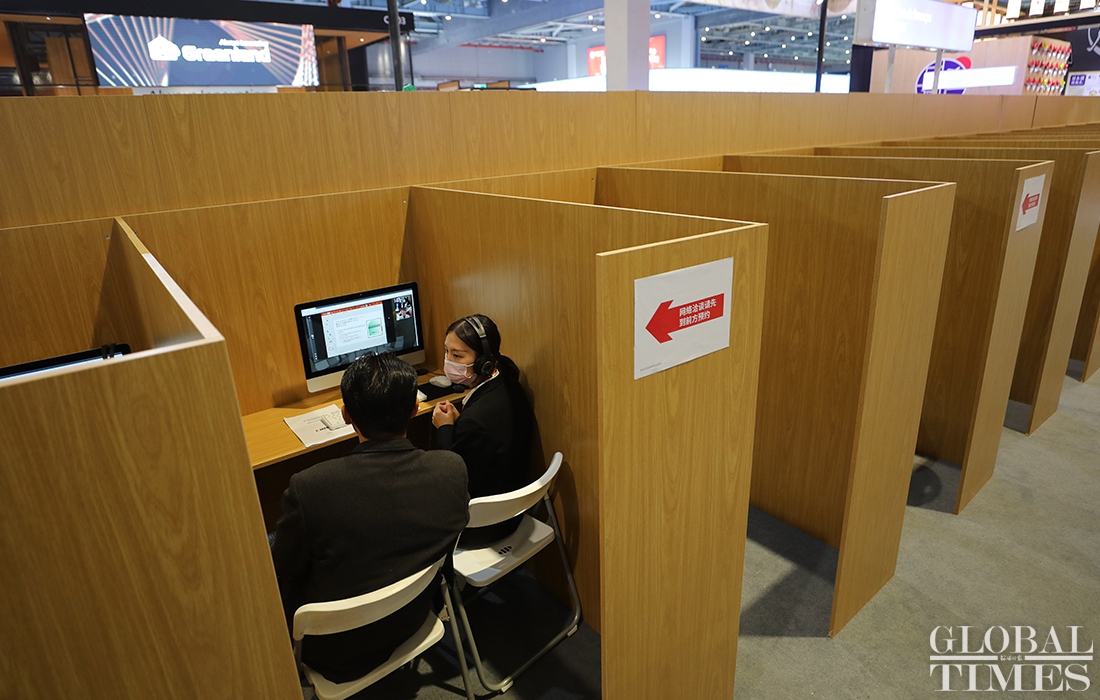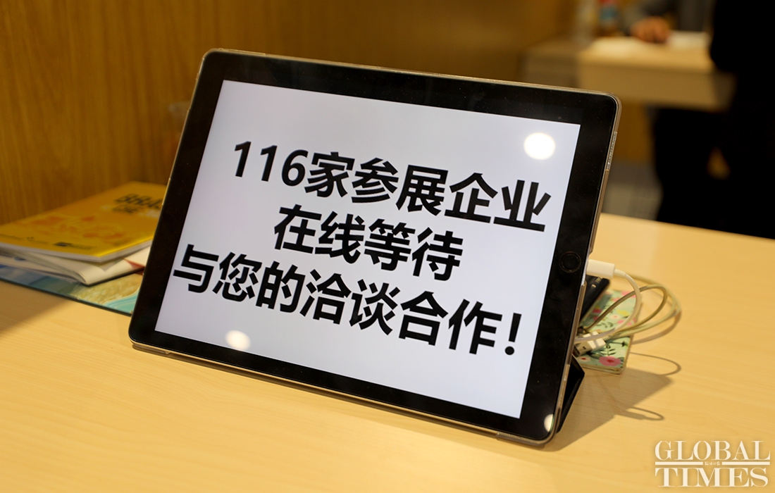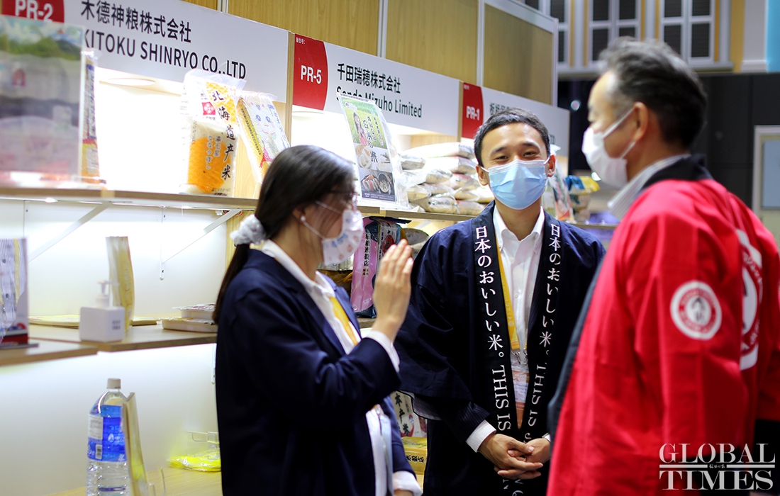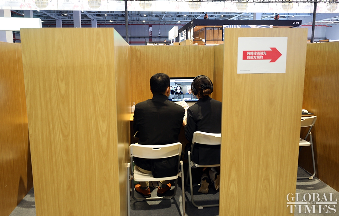In the food and agricultural product pavilion, Japan External Trade Organization prepared 60 semi-open rooms that can be used for business negotiations. If interested after trying samples from 116 exhibitors, visitors can enter the rooms and conduct "cloud negotiations" with the companies who are waiting online in Japan. Photos: Yang Hui/GT