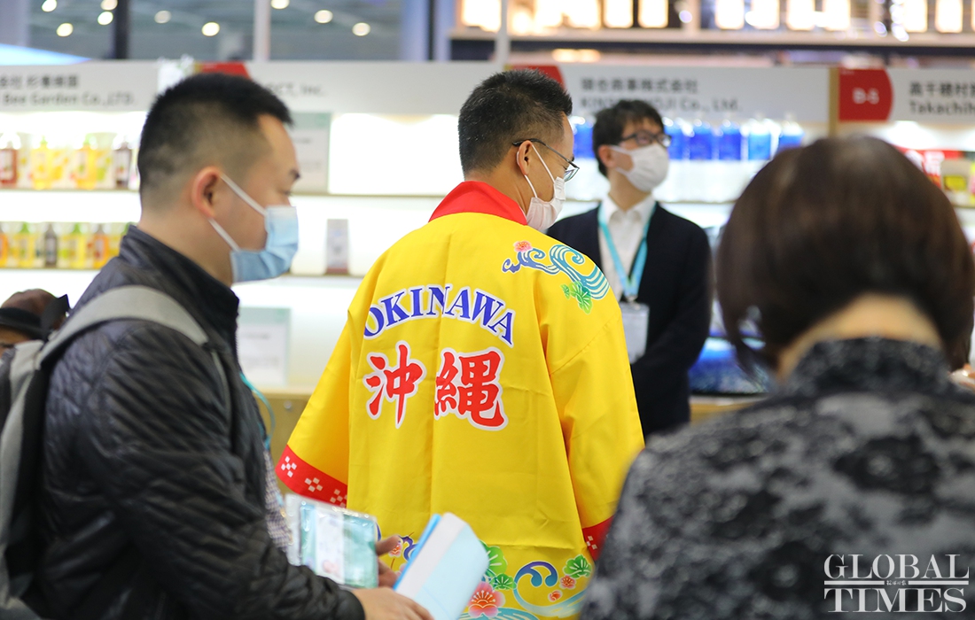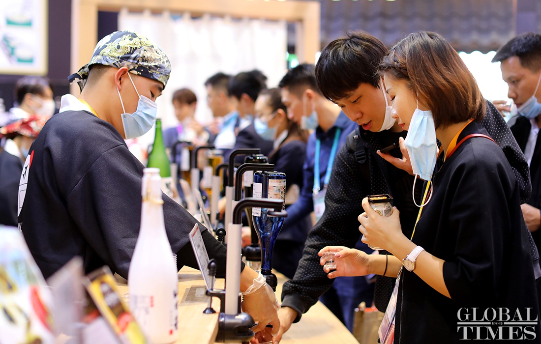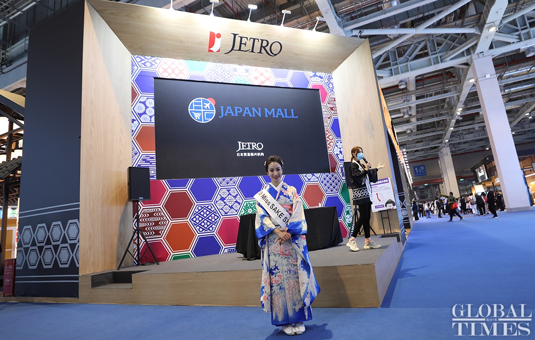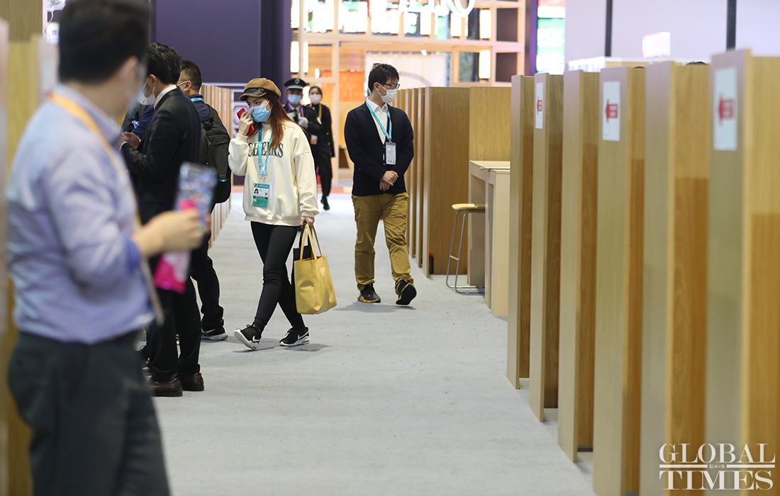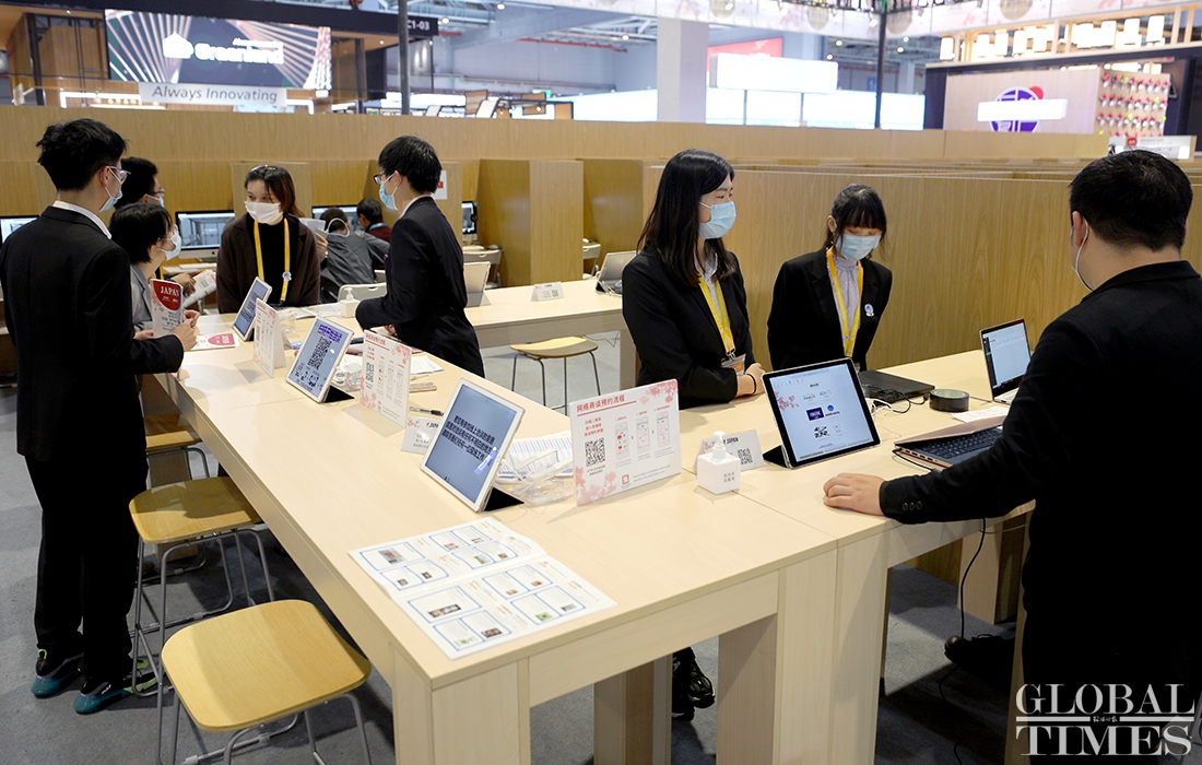In the food and agricultural product pavilion, Japan External Trade Organization prepared 60 semi-open rooms that can be used for business negotiations. If interested after trying samples from 116 exhibitors, visitors can enter the rooms and conduct "cloud negotiations" with the companies who are waiting online in Japan. Photos: Yang Hui/GT