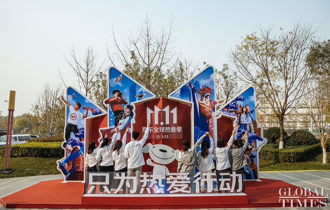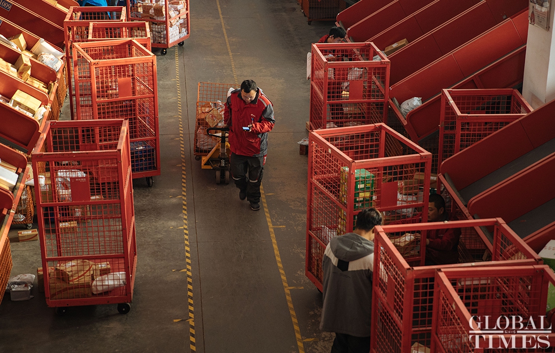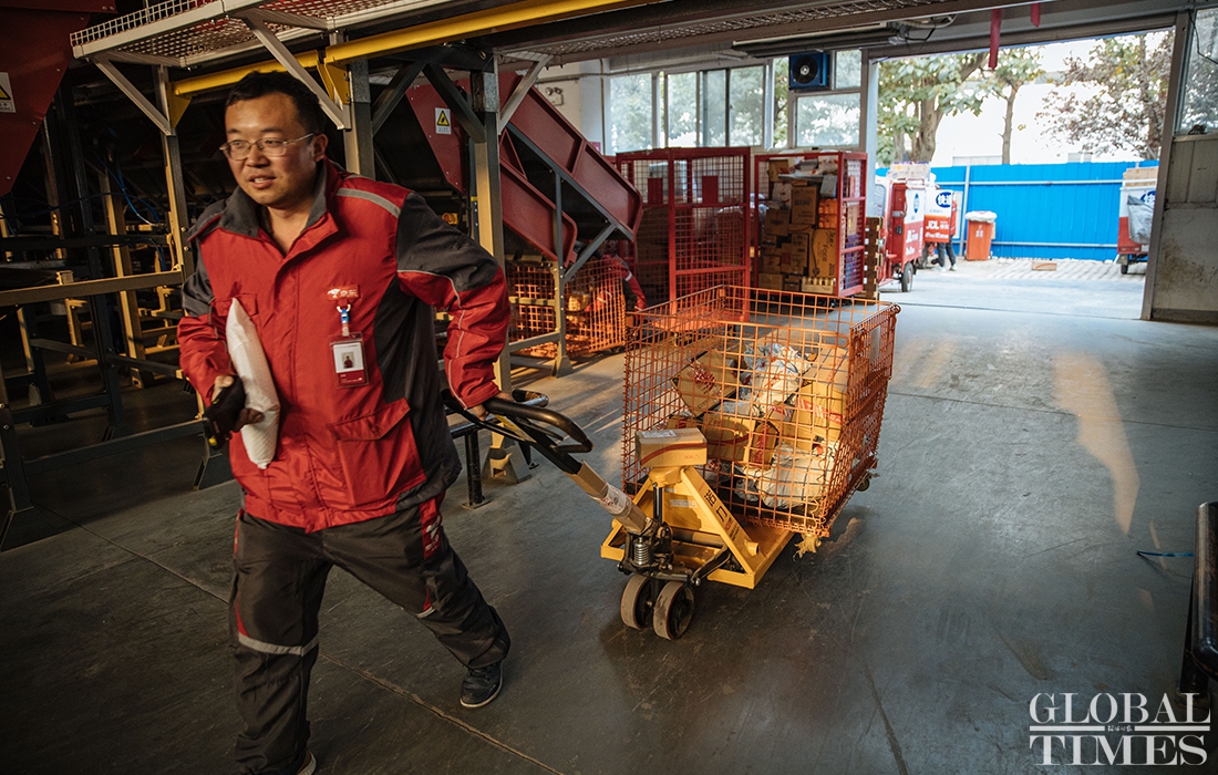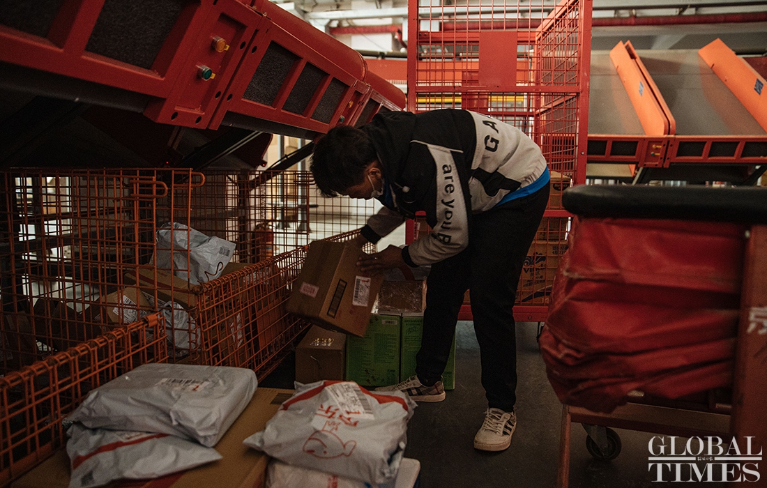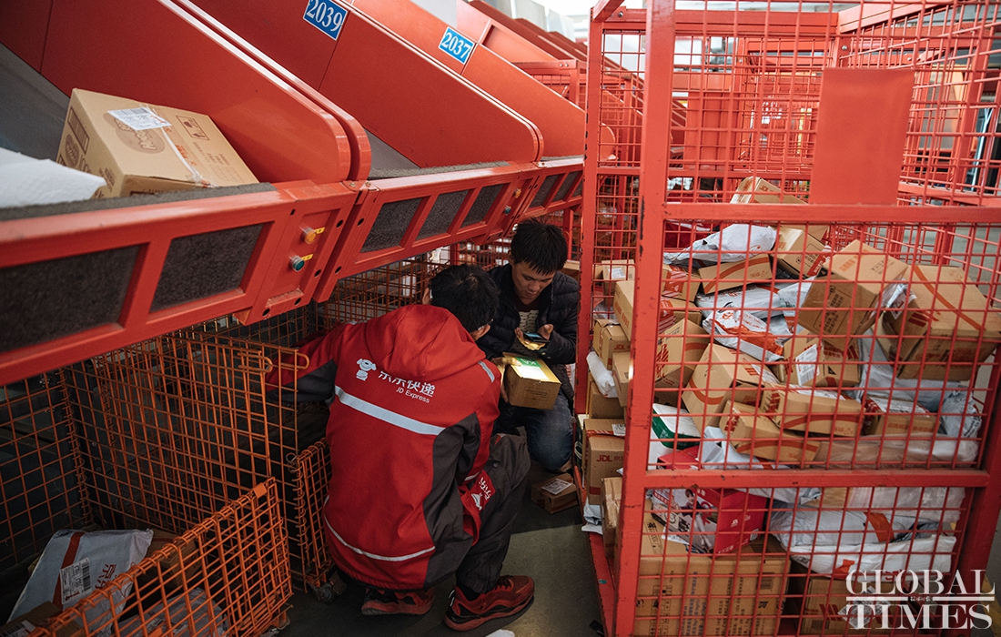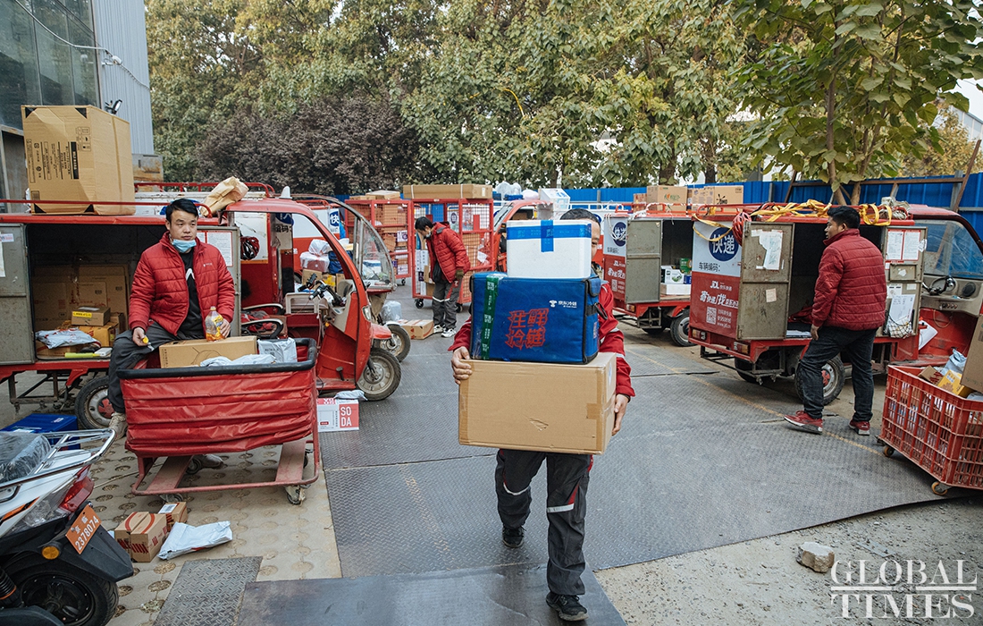 At the smart delivery depot in Beijing’s Yizhuang economic development zone, logistics workers help sort packages on November 11. The depot combines manual and machine sorting. According to JD, the number of deliveries doubles during the online Double 11 shopping spree compared with normal days. Over the past 10 days, total sales exceeded 243.1 billion yuan ($36.7 billion) by 2:26 pm on November 11. Photos: Li Hao/GT