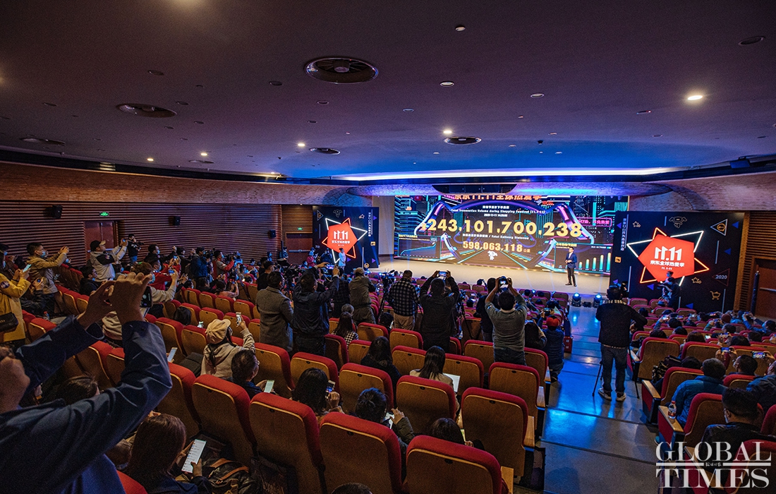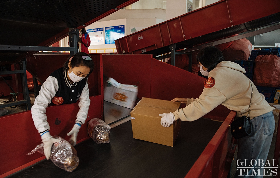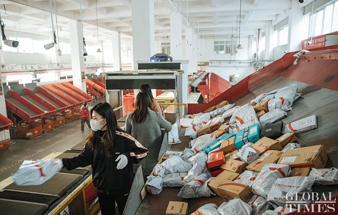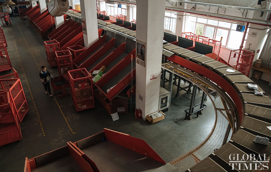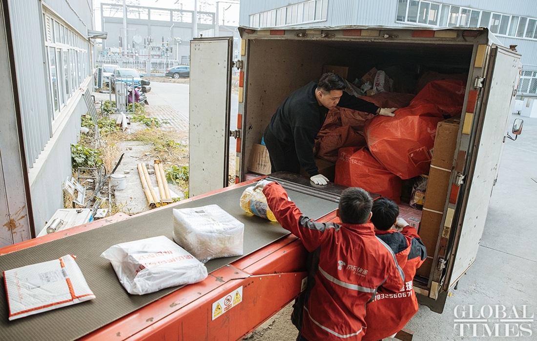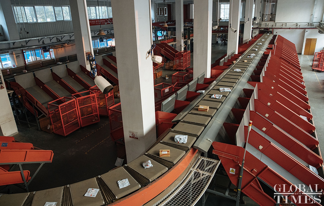 At the smart delivery depot in Beijing’s Yizhuang economic development zone, logistics workers help sort packages on November 11. The depot combines manual and machine sorting. According to JD, the number of deliveries doubles during the online Double 11 shopping spree compared with normal days. Over the past 10 days, total sales exceeded 243.1 billion yuan ($36.7 billion) by 2:26 pm on November 11. Photos: Li Hao/GT