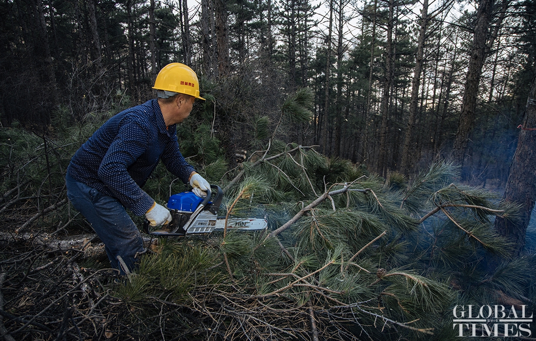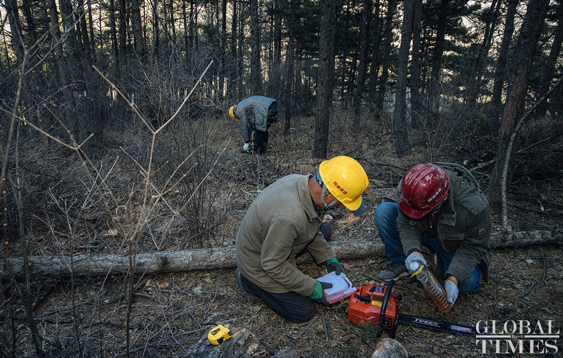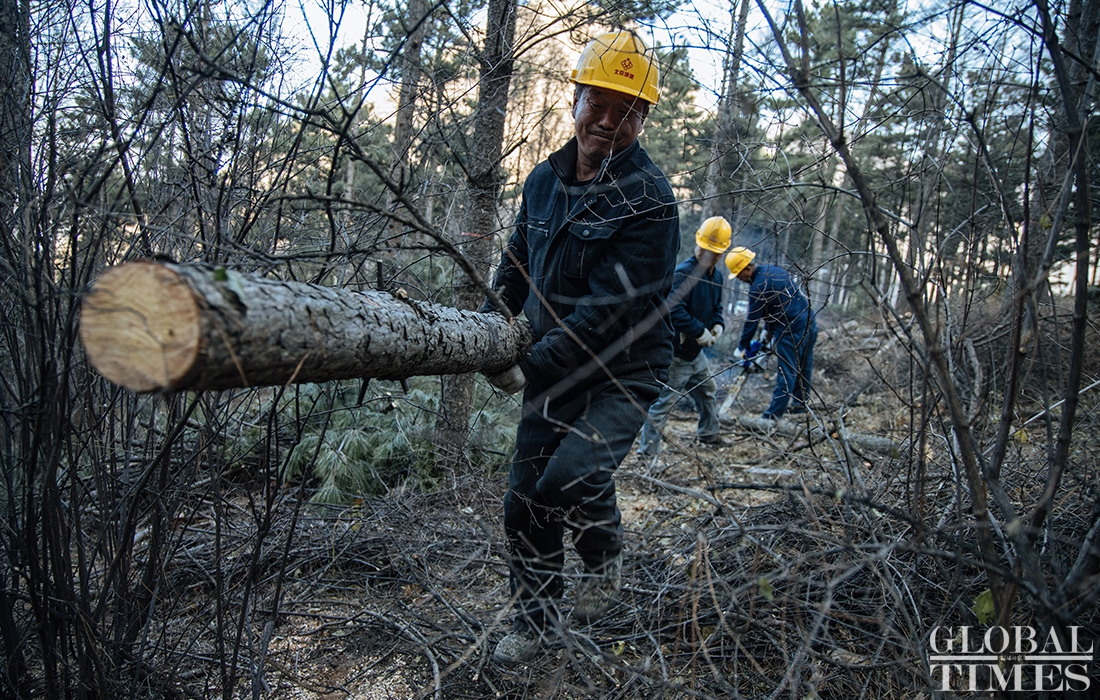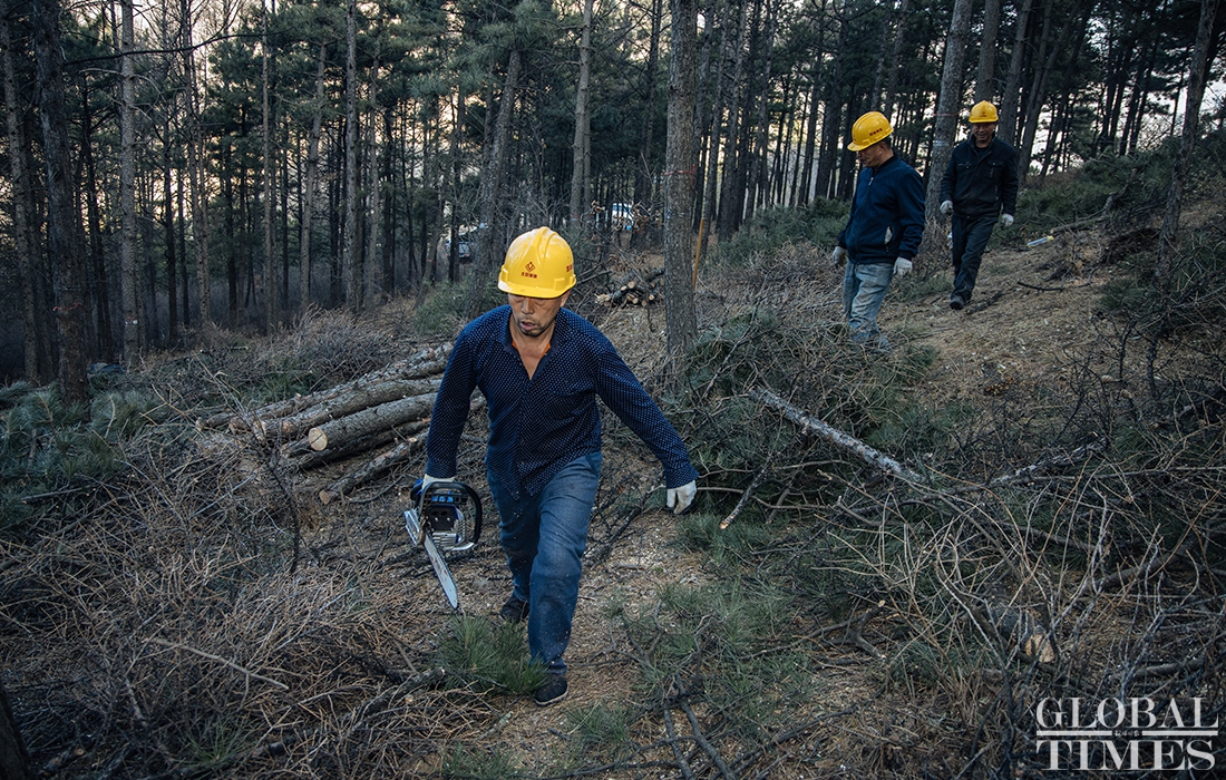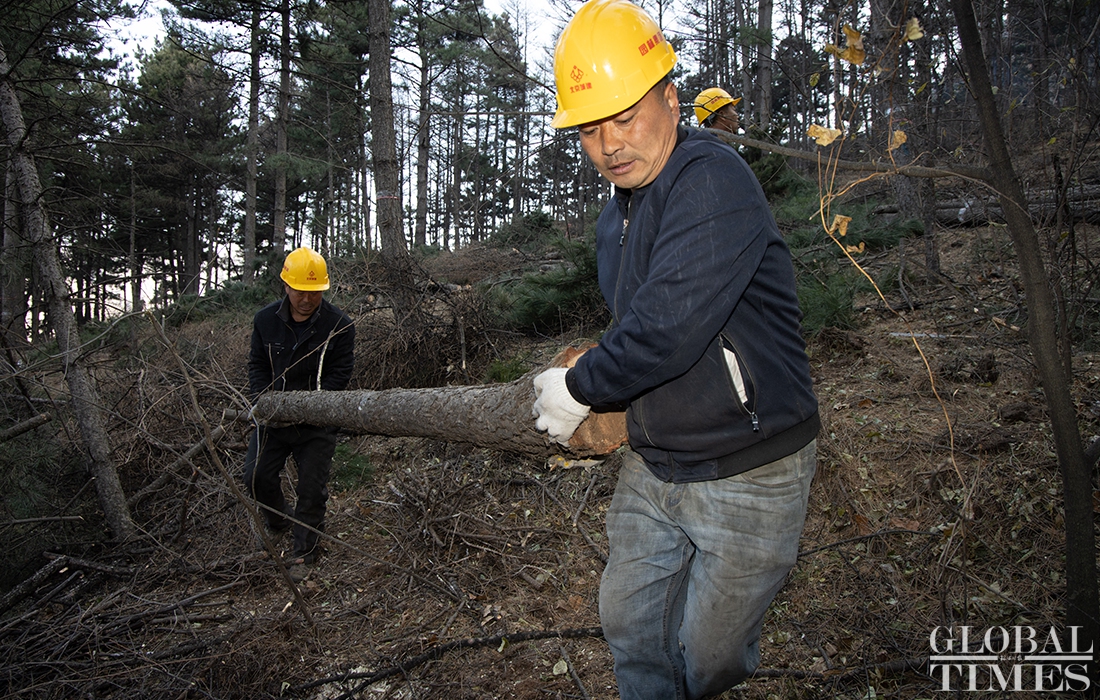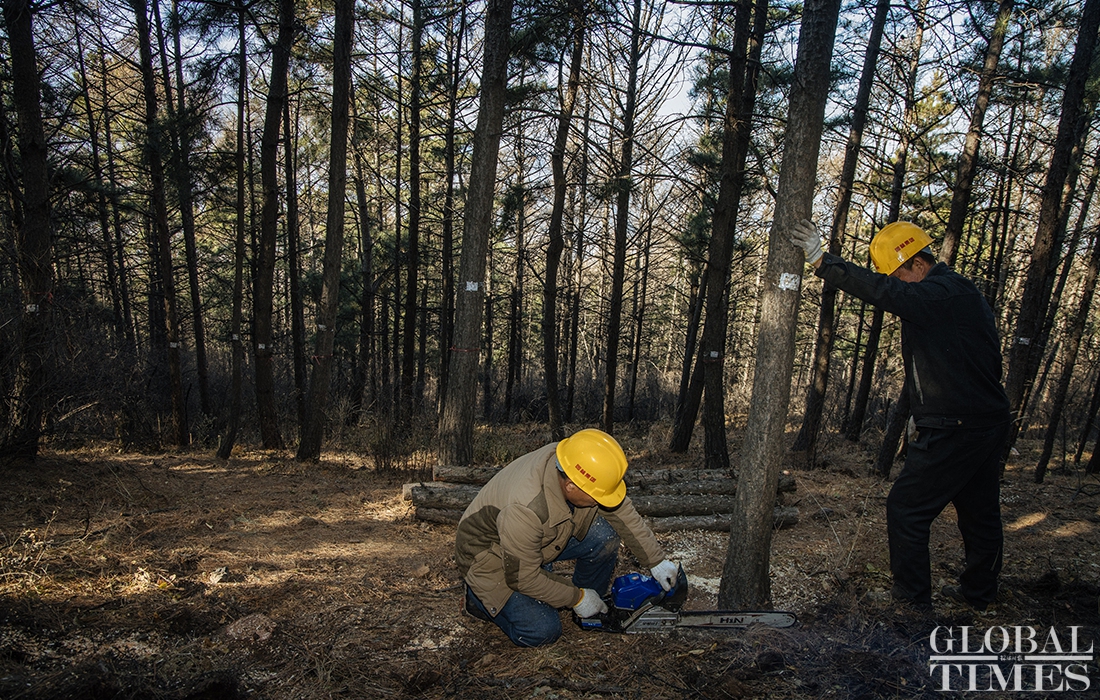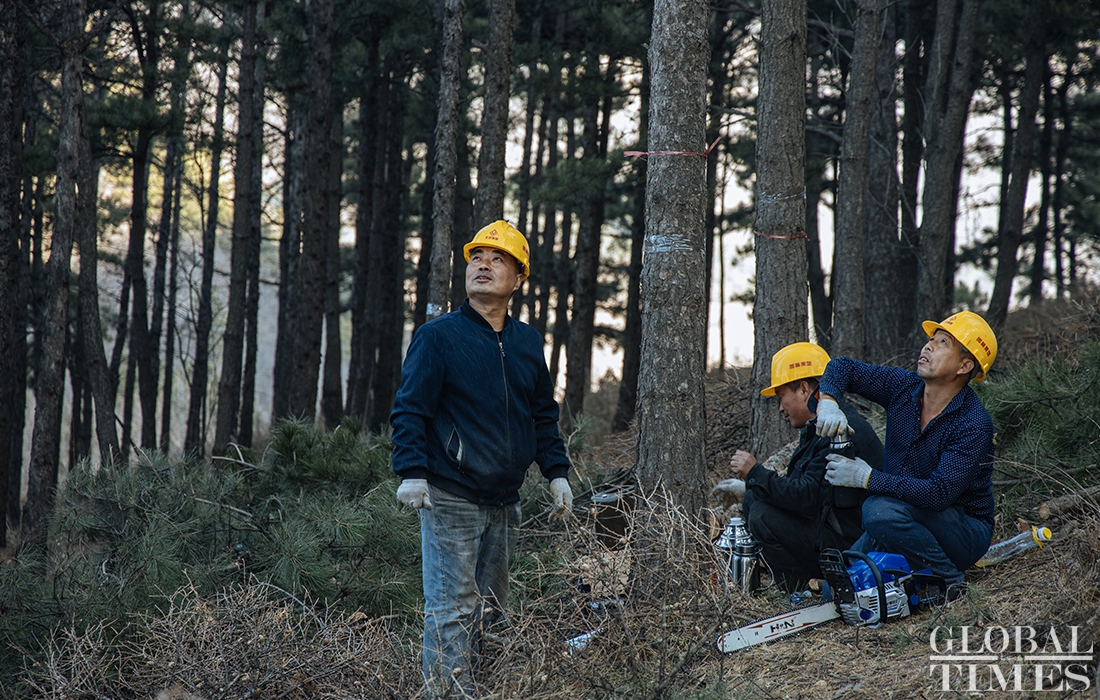 Lumberjacks were busy on Thursday cutting down trees in Beijing’s Jingxi Forest Farm. The farm had planted saplings too close together, which stunted their growth as they matured. After seeking professional advice, the farm started logging on Thursday to promote the growth of trees and enhance the biodiversity of the forest. Photos: Li Hao/GT