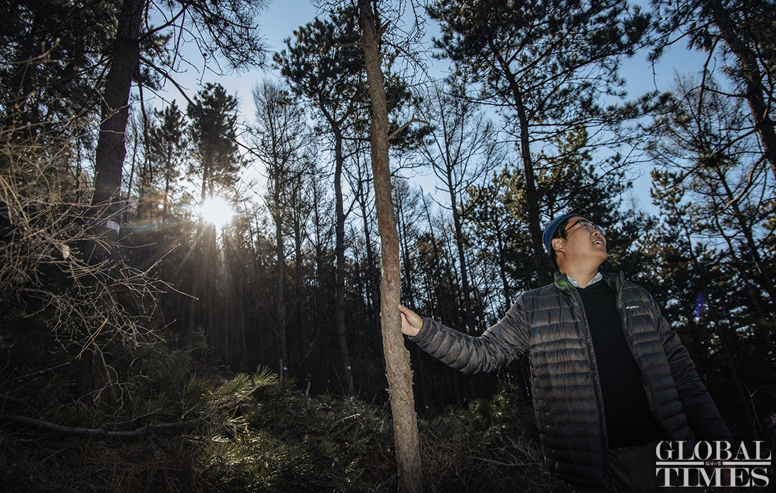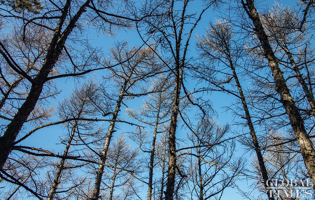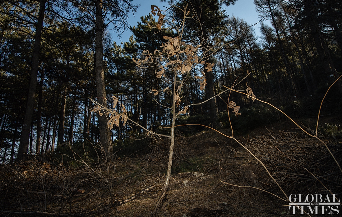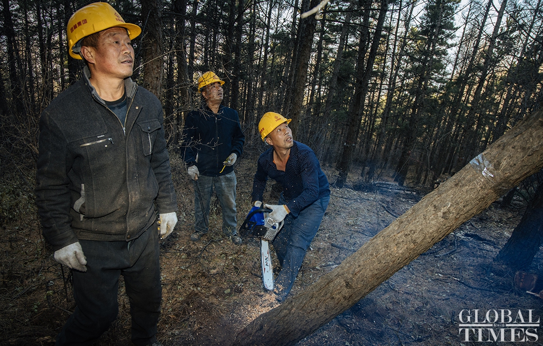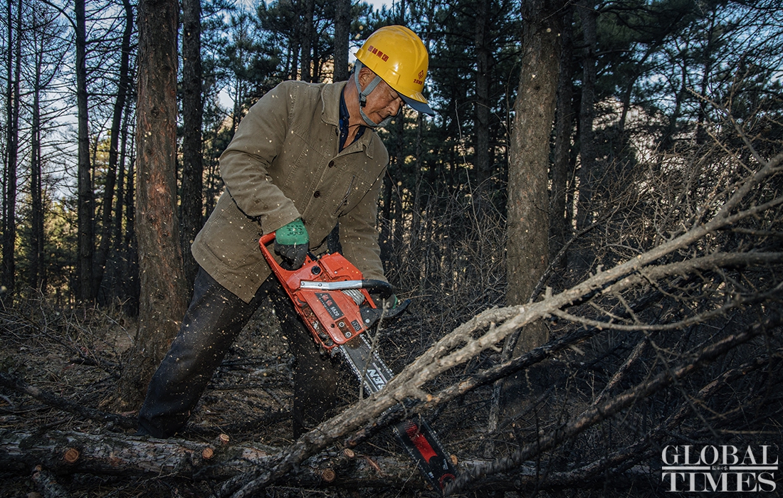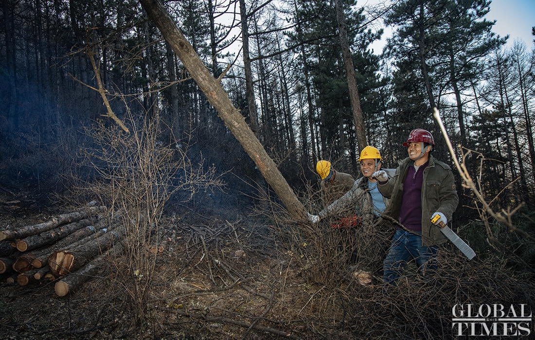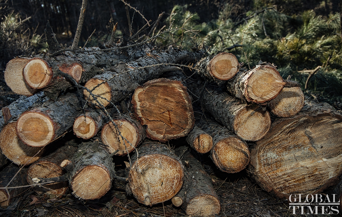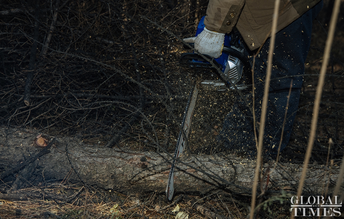 Lumberjacks were busy on Thursday cutting down trees in Beijing’s Jingxi Forest Farm. The farm had planted saplings too close together, which stunted their growth as they matured. After seeking professional advice, the farm started logging on Thursday to promote the growth of trees and enhance the biodiversity of the forest. Photos: Li Hao/GT