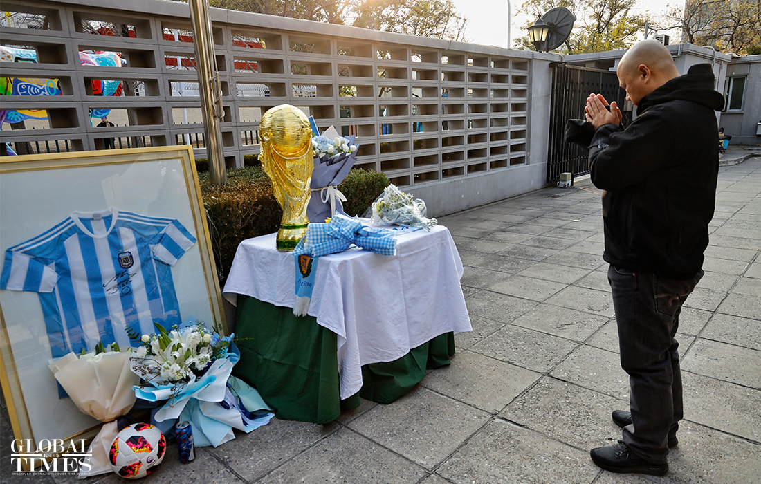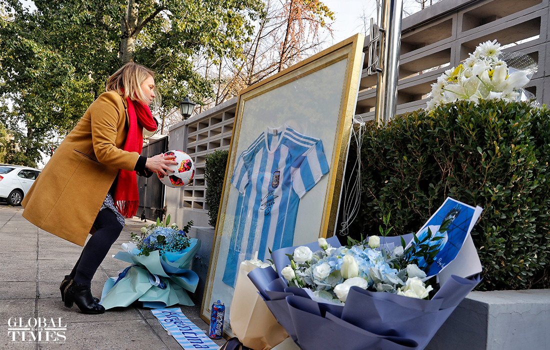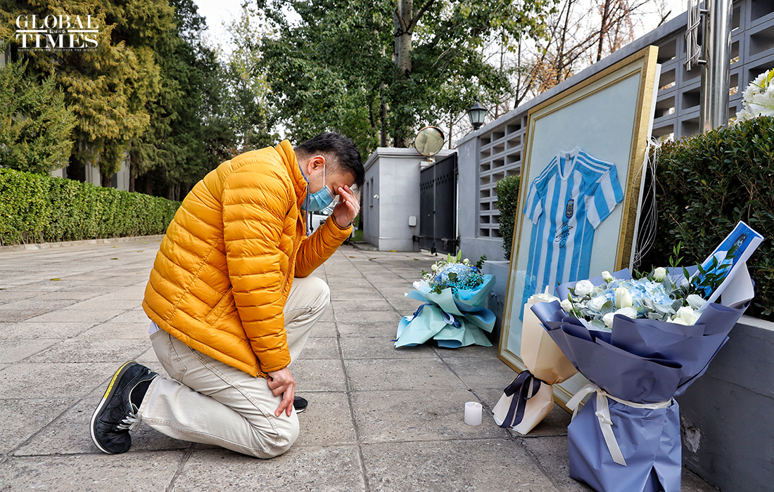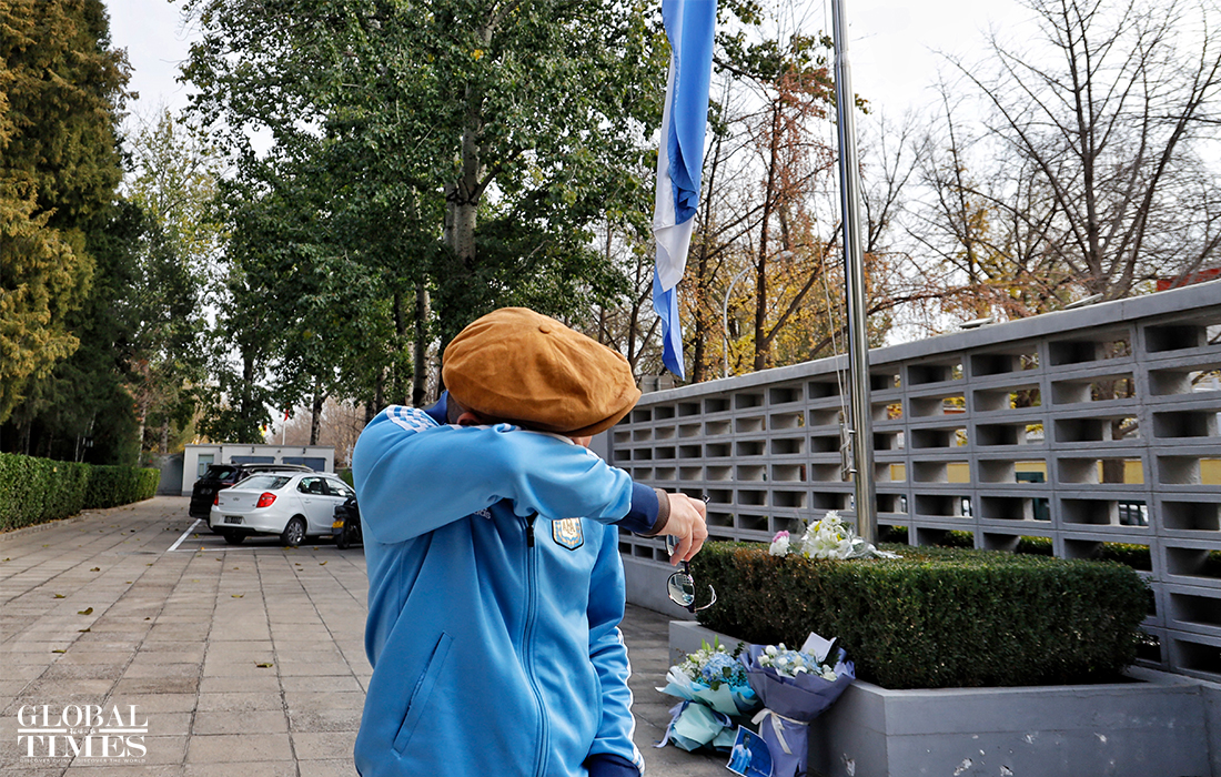 Offering flowers and lighting candles, Chinese football fans on Thursday paid tribute at the Argentine Embassy in Beijing, expressing their condolences to Argentine football legend Diego Maradona, who died of a heart attack while in his home in Buenos Aires on Wednesday local time. Photos: Li Hao/GT