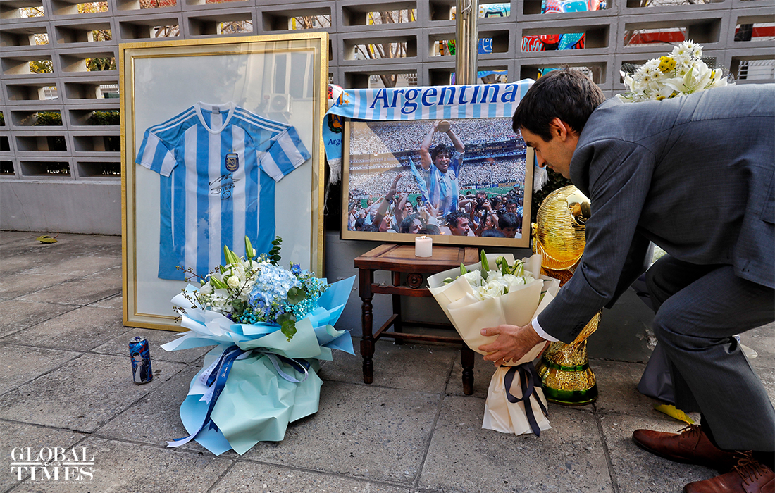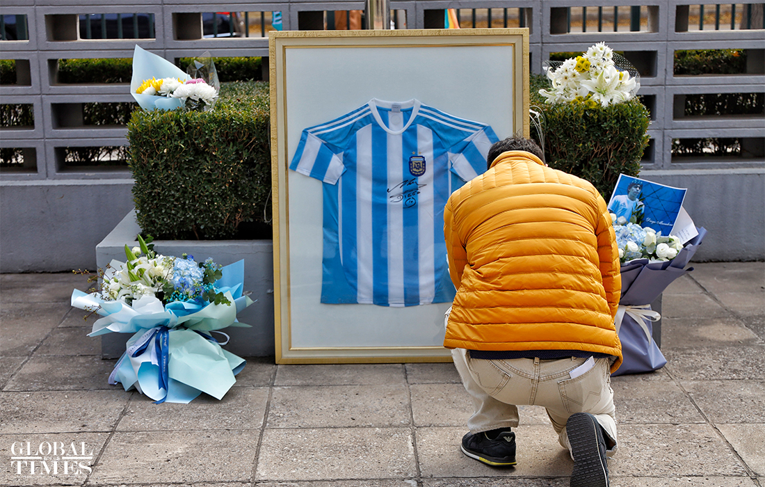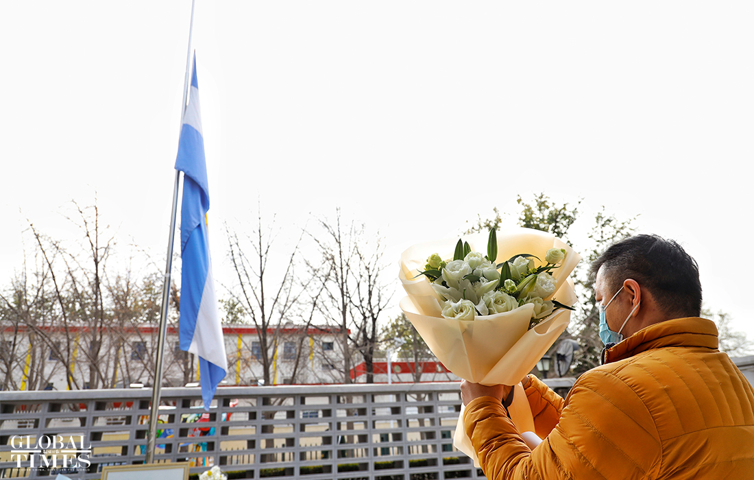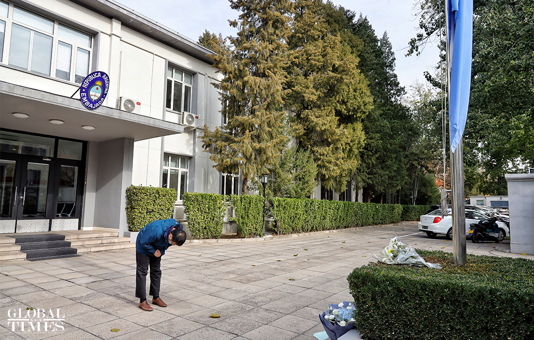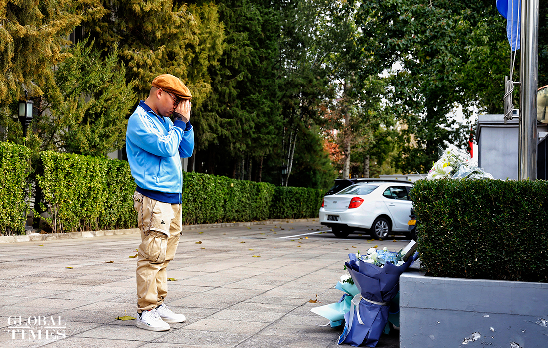 Offering flowers and lighting candles, Chinese football fans on Thursday paid tribute at the Argentine Embassy in Beijing, expressing their condolences to Argentine football legend Diego Maradona, who died of a heart attack while in his home in Buenos Aires on Wednesday local time. Photos: Li Hao/GT