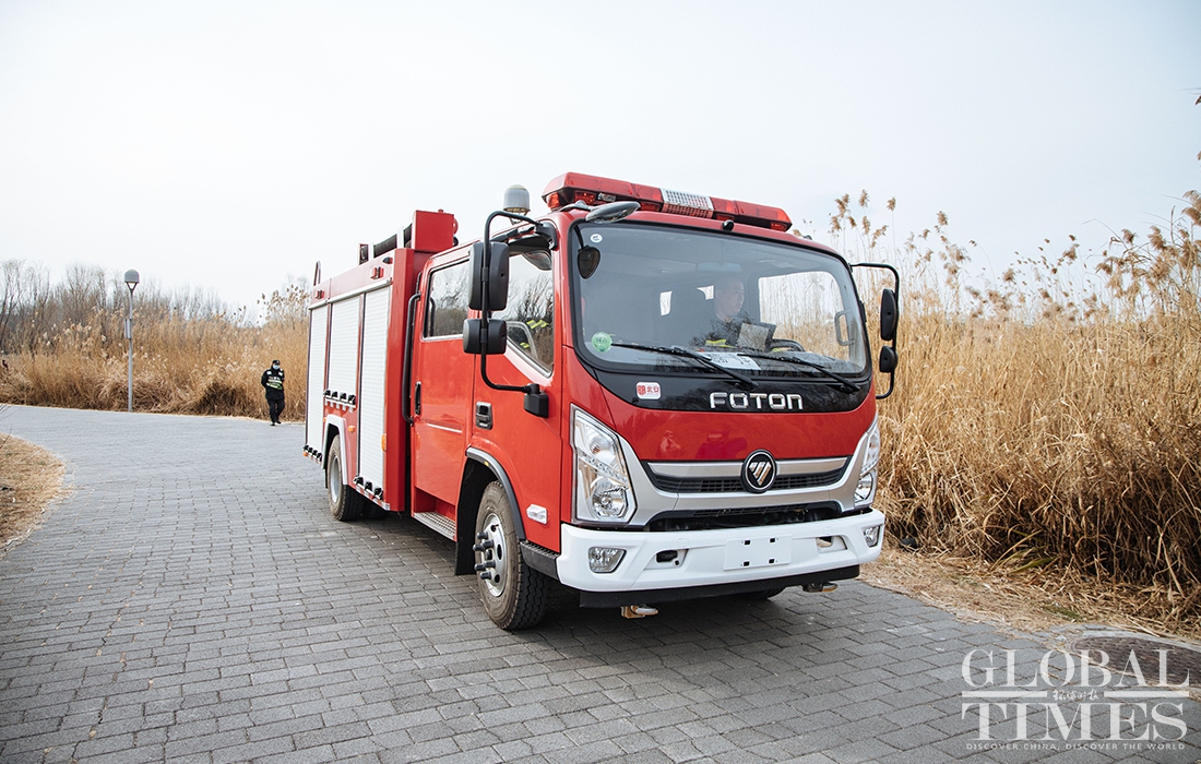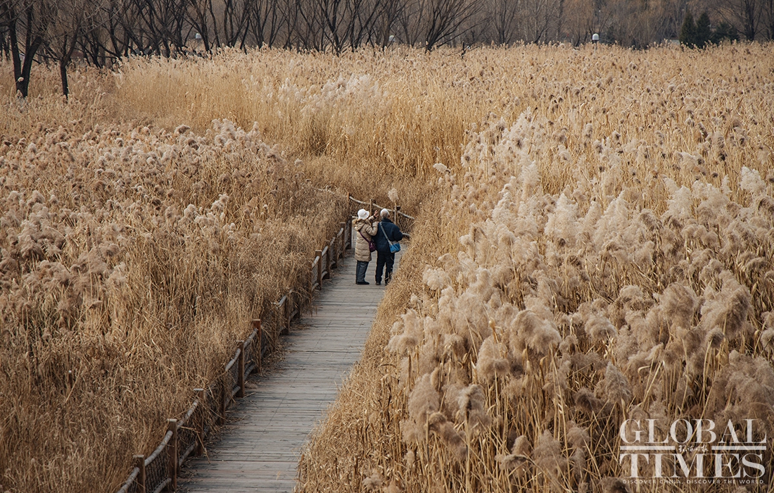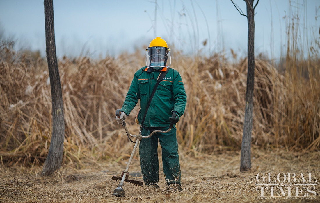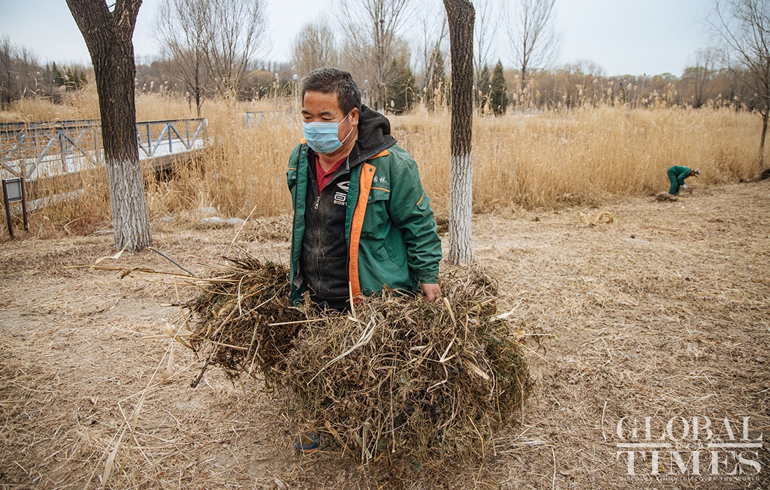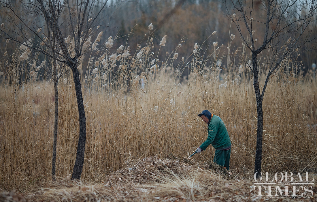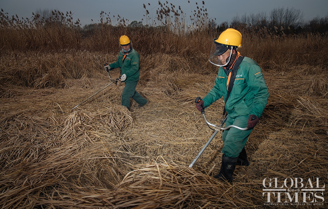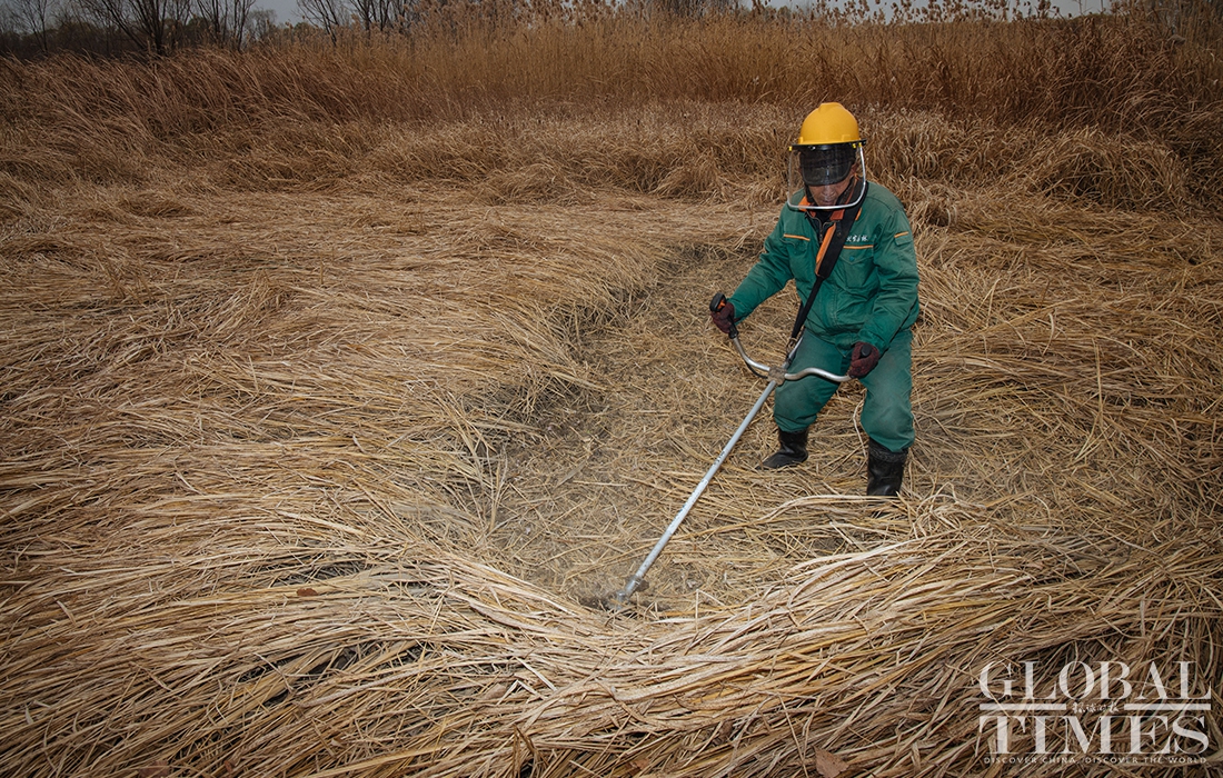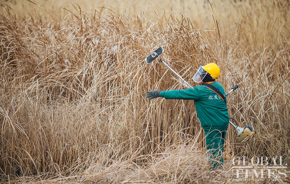 Beijing's Olympic Forest Park on Wednesday carried out reed cutting to prevent water eutrophication and protect biodiversity, which also aims to eliminate fire accidents in the dry winter. (Photos: Li Hao)