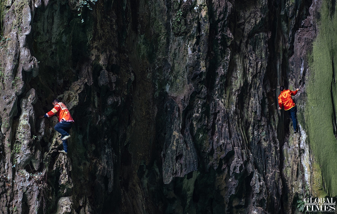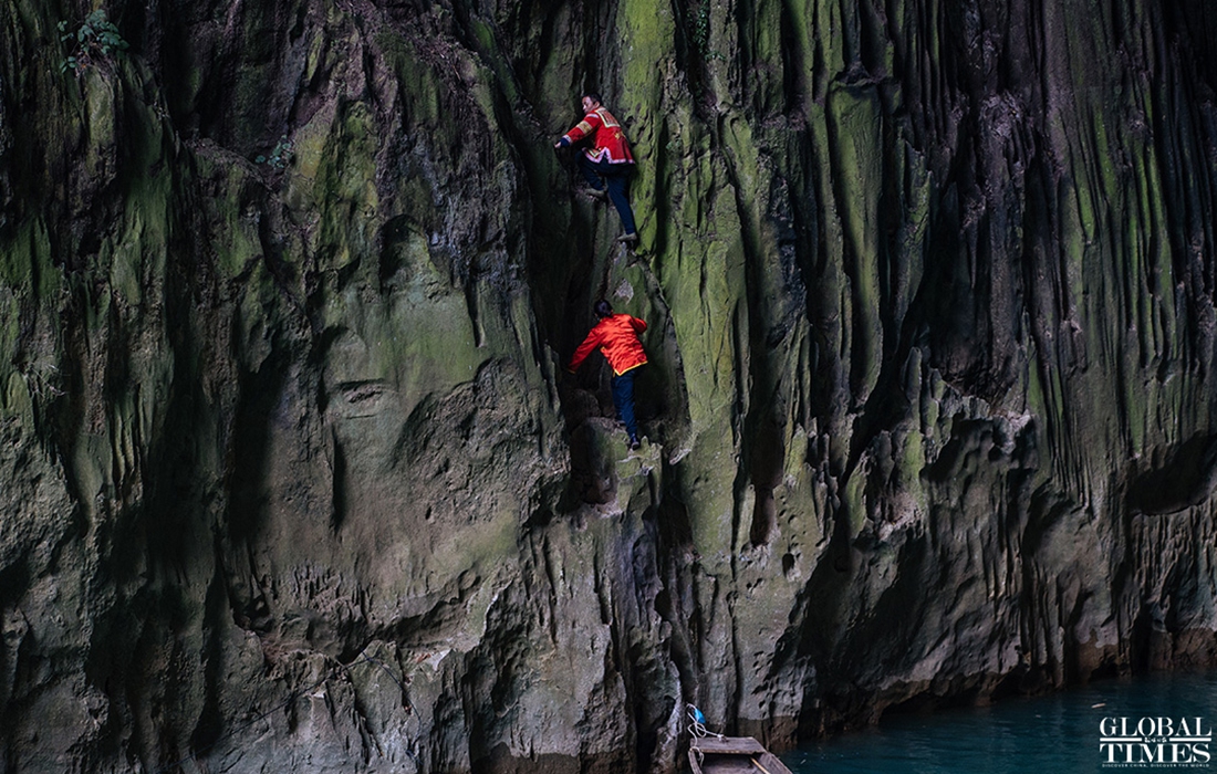 Luo Dengping and Huang Jinlin thrill spectators as they deftly climb up and down the 108-meter-tall walls of a gigantic cave without protective equipment. They are known as the “spider men” of the Getu River scenic area in the Miao-Bouyei Autonomous County of Ziyun, Southwest China's Guizhou Province.