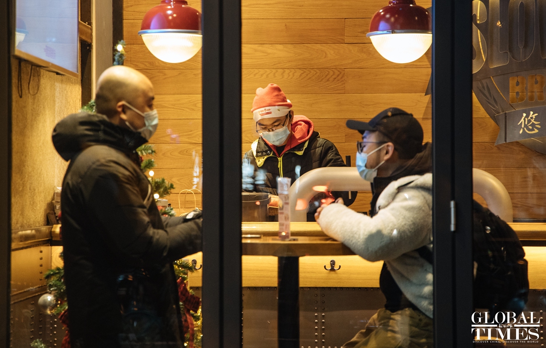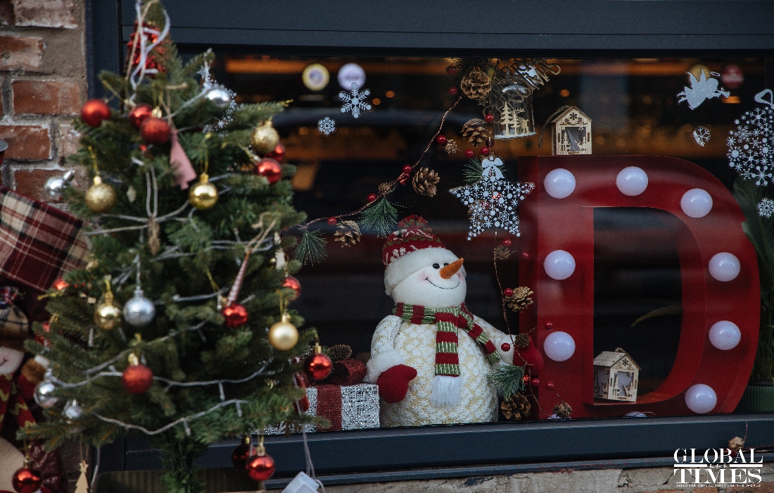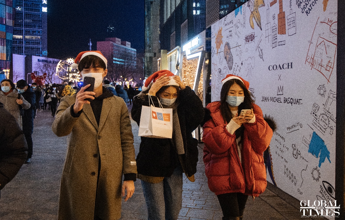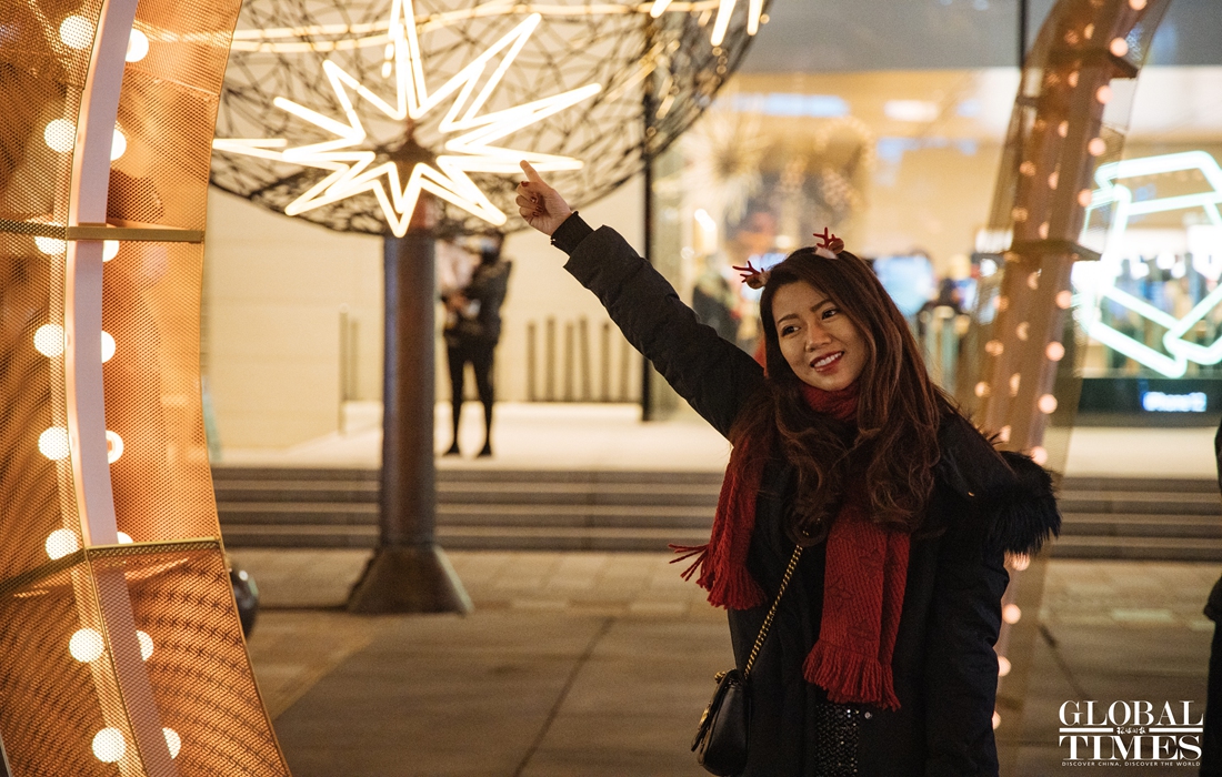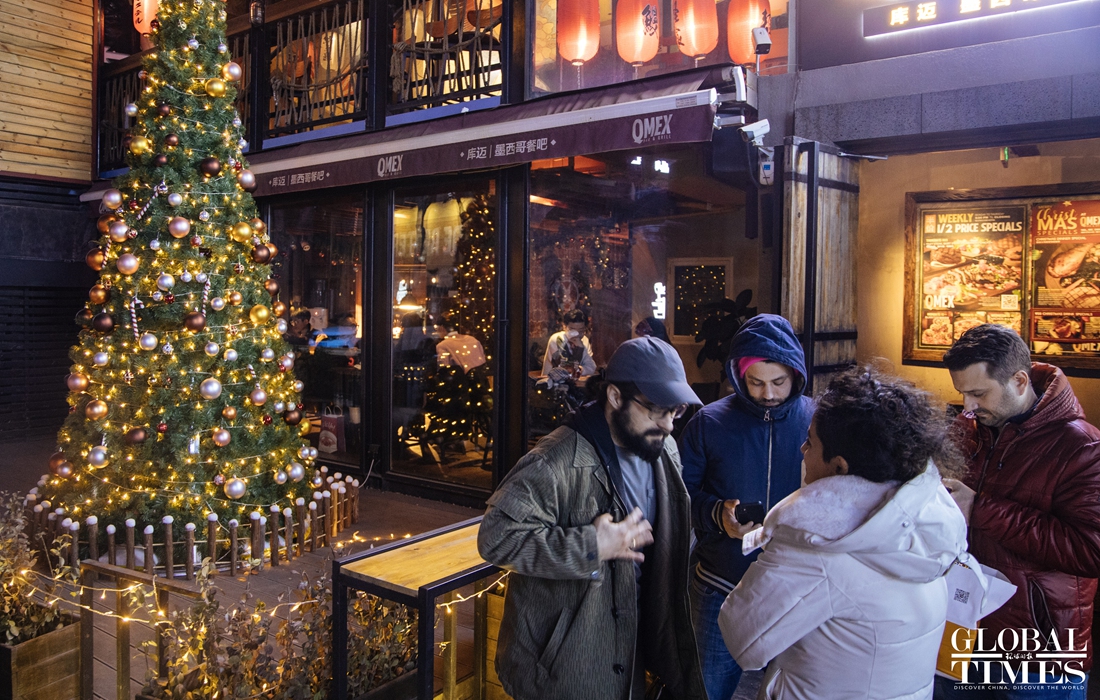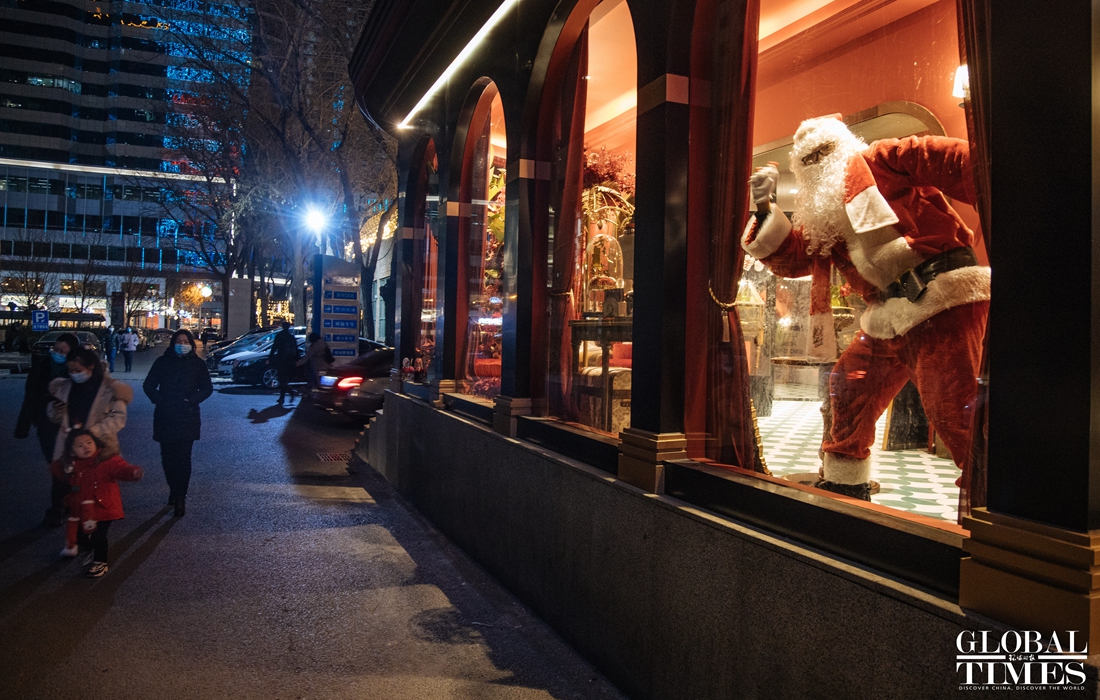 Christmas atmosphere was visible across Beijing, with special lighting on streets and Christmas trees in restaurants. At the same time, epidemic prevention and control measures were enforced at the venues. People were seen showing their health code and undergoing temperature measurement at the entrance of a busy business area. (Photos: Li Hao/GT)