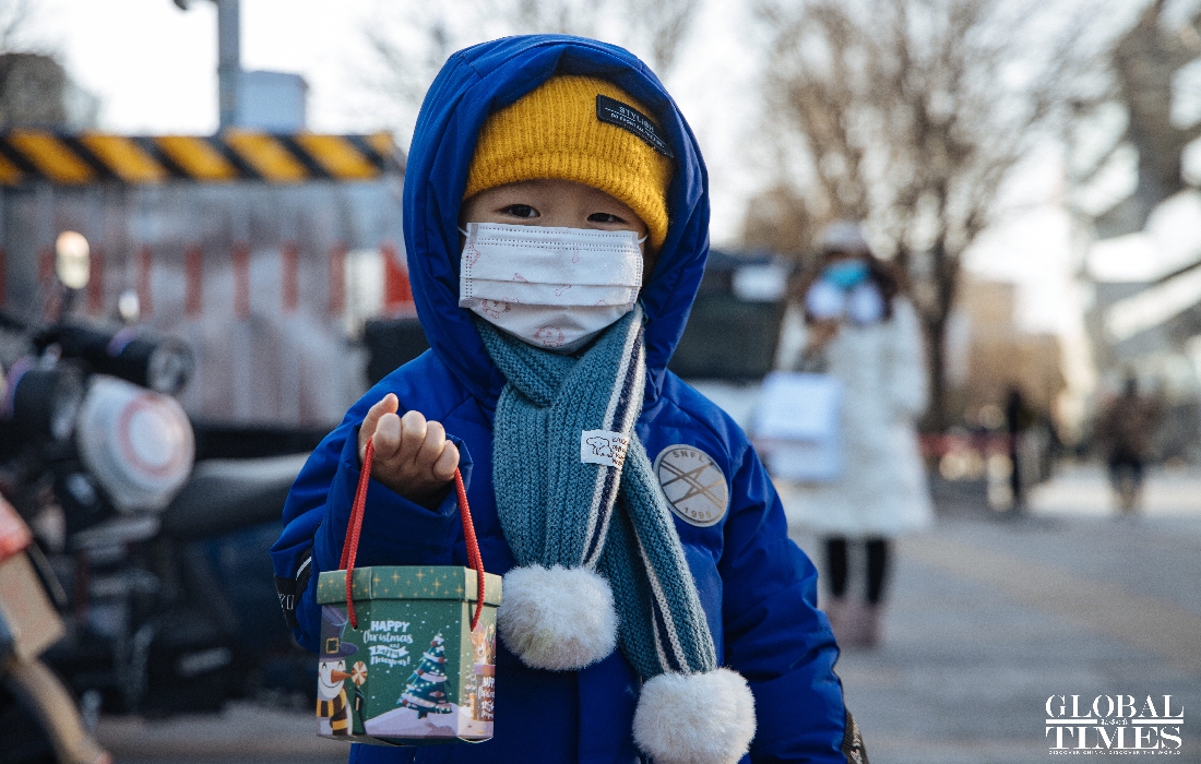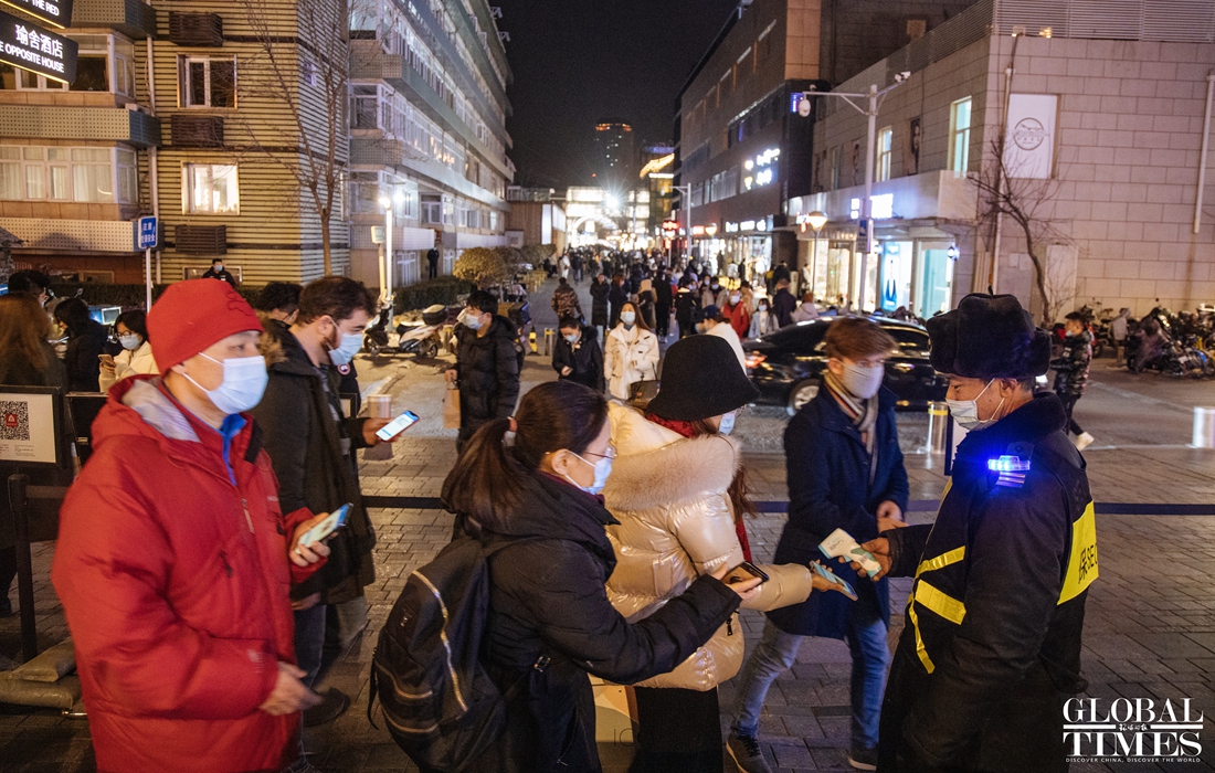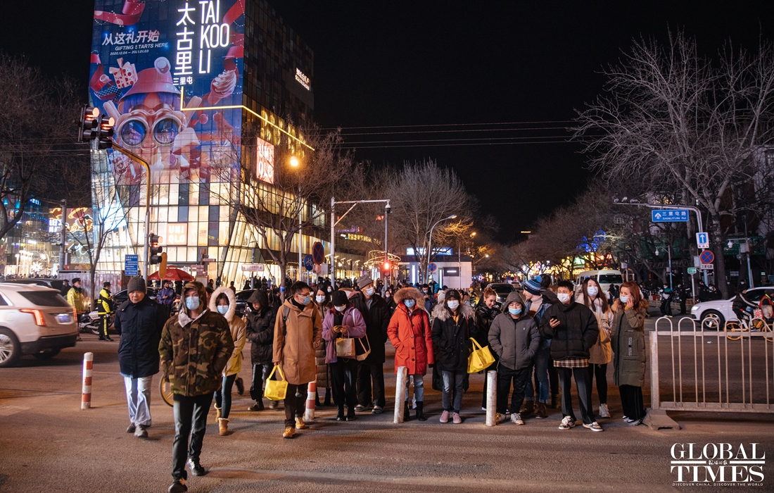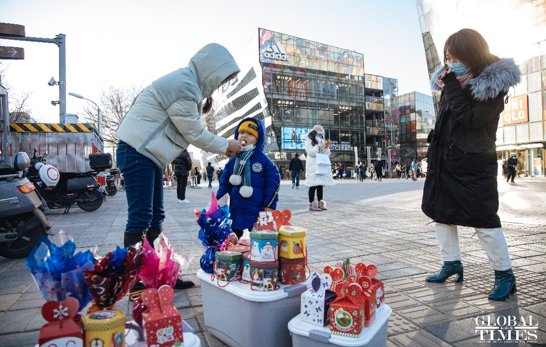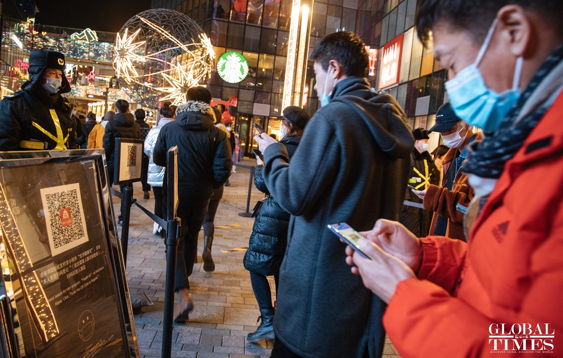 Christmas atmosphere was visible across Beijing, with special lighting on streets and Christmas trees in restaurants. At the same time, epidemic prevention and control measures were enforced at the venues. People were seen showing their health code and undergoing temperature measurement at the entrance of a busy business area. (Photos: Li Hao/GT)