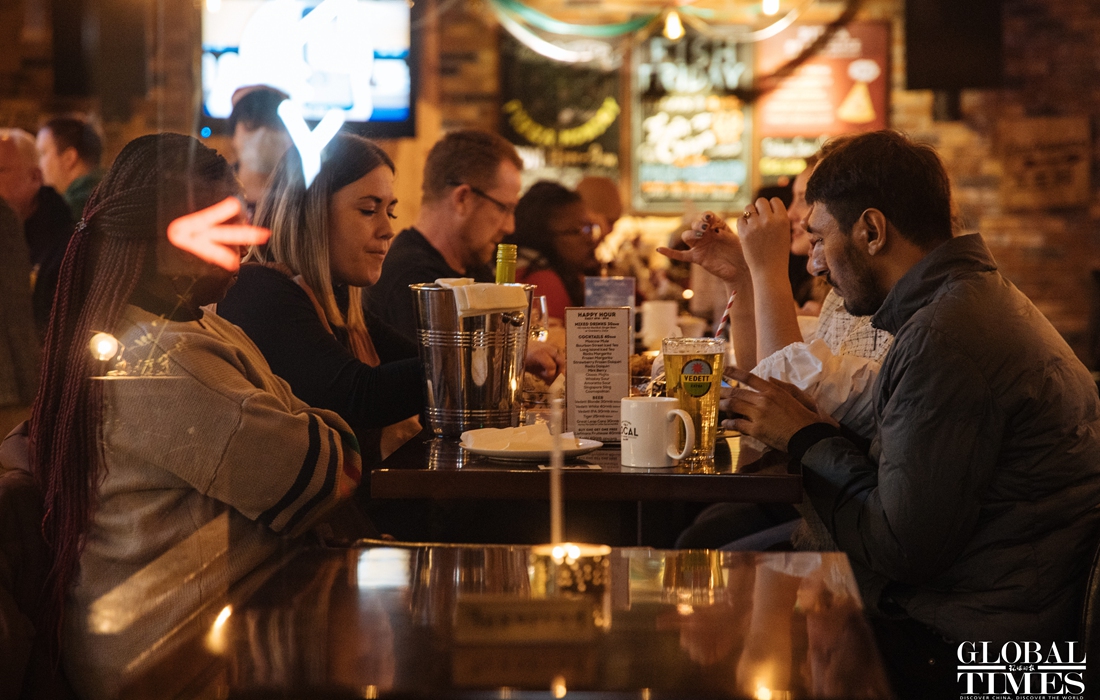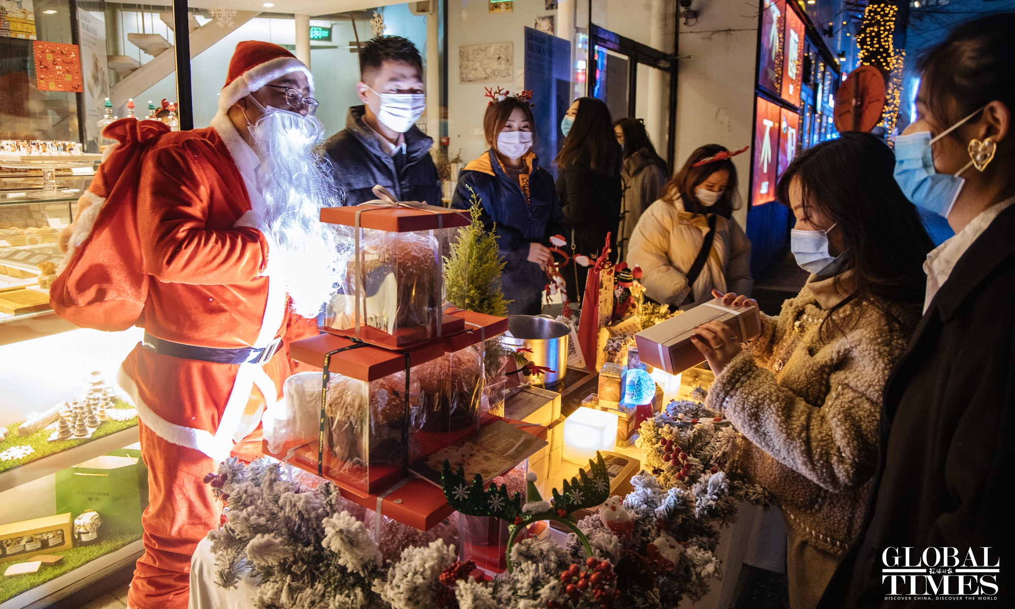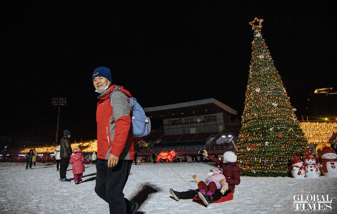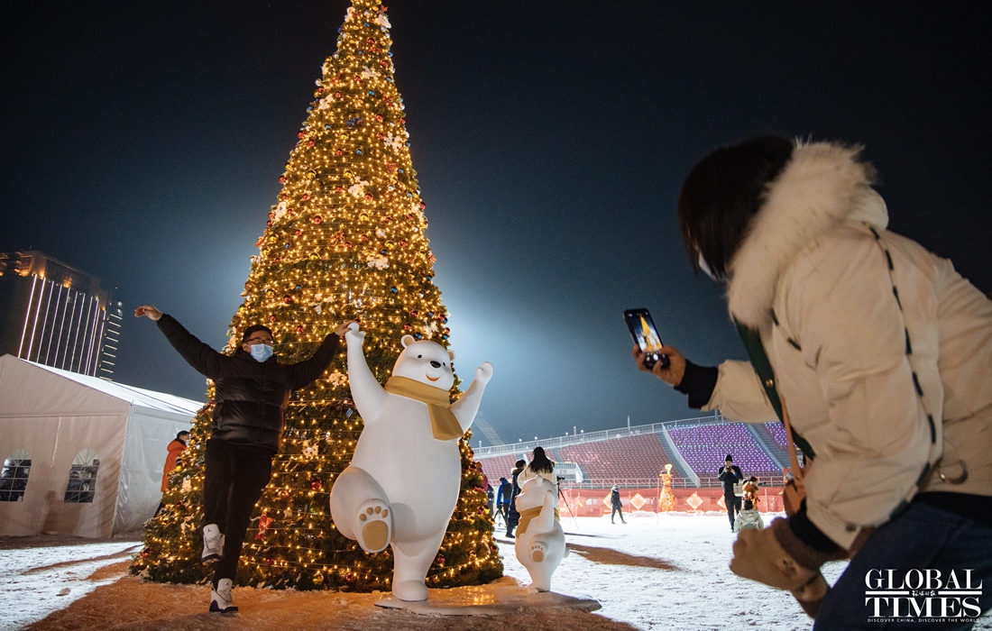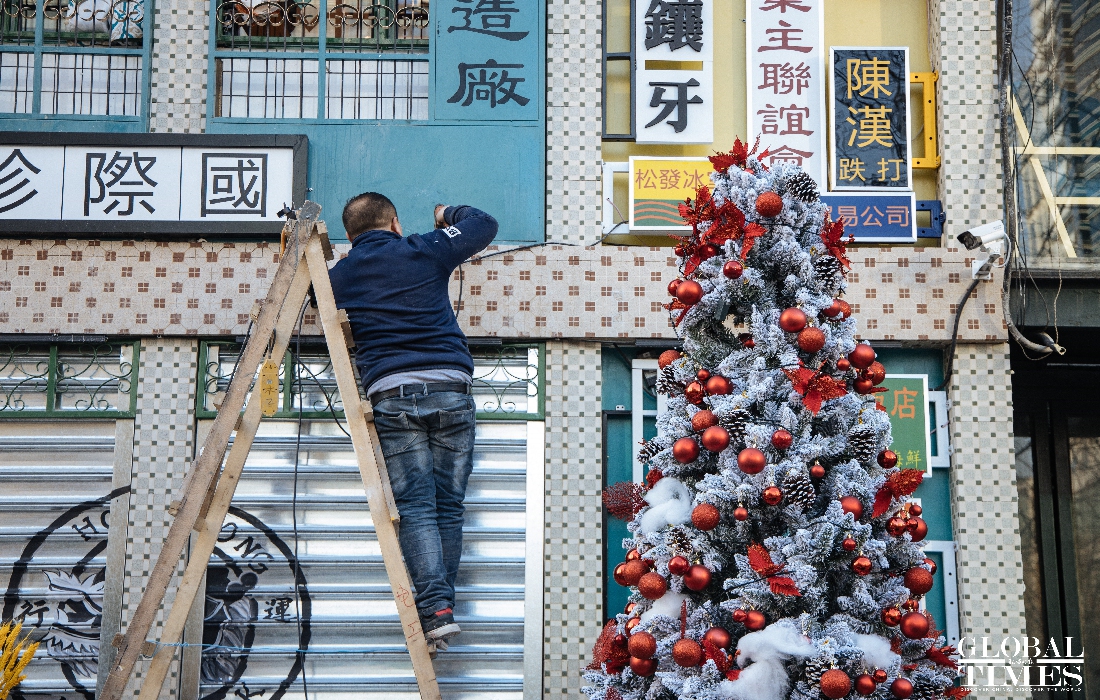 Christmas atmosphere was visible across Beijing, with special lighting on streets and Christmas trees in restaurants. At the same time, epidemic prevention and control measures were enforced at the venues. People were seen showing their health code and undergoing temperature measurement at the entrance of a busy business area. (Photos: Li Hao/GT)