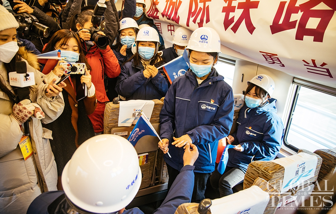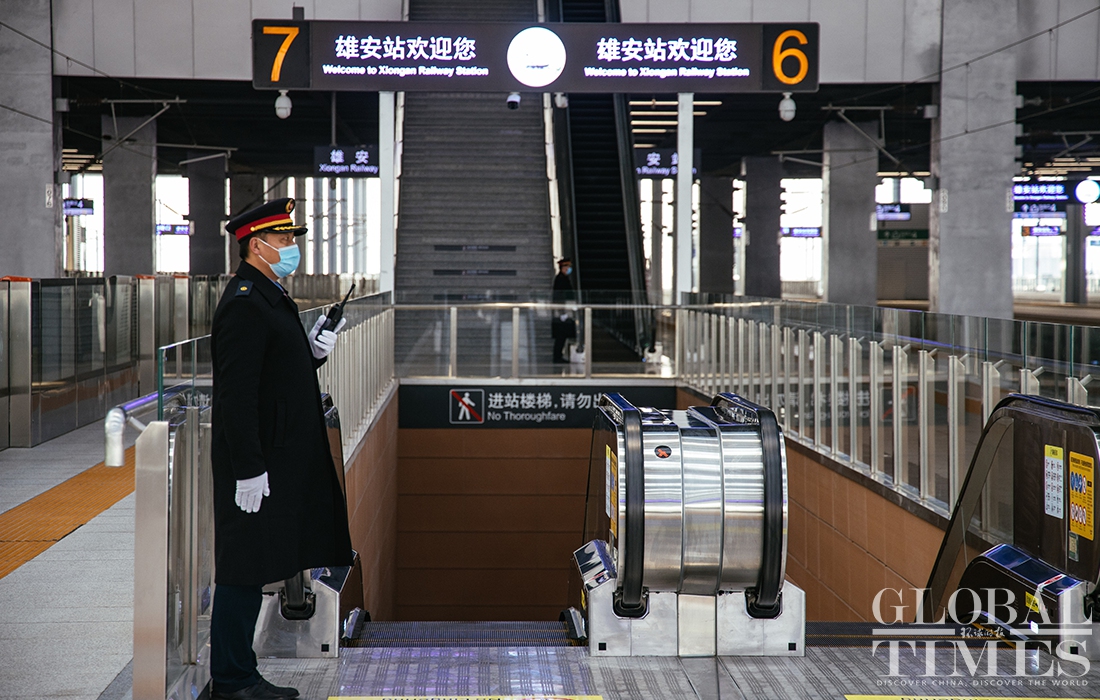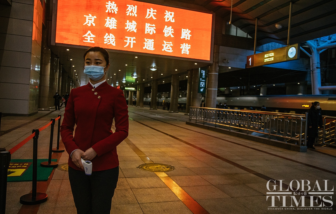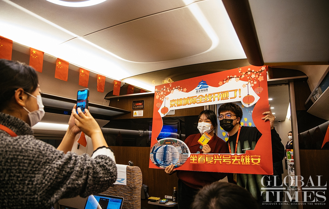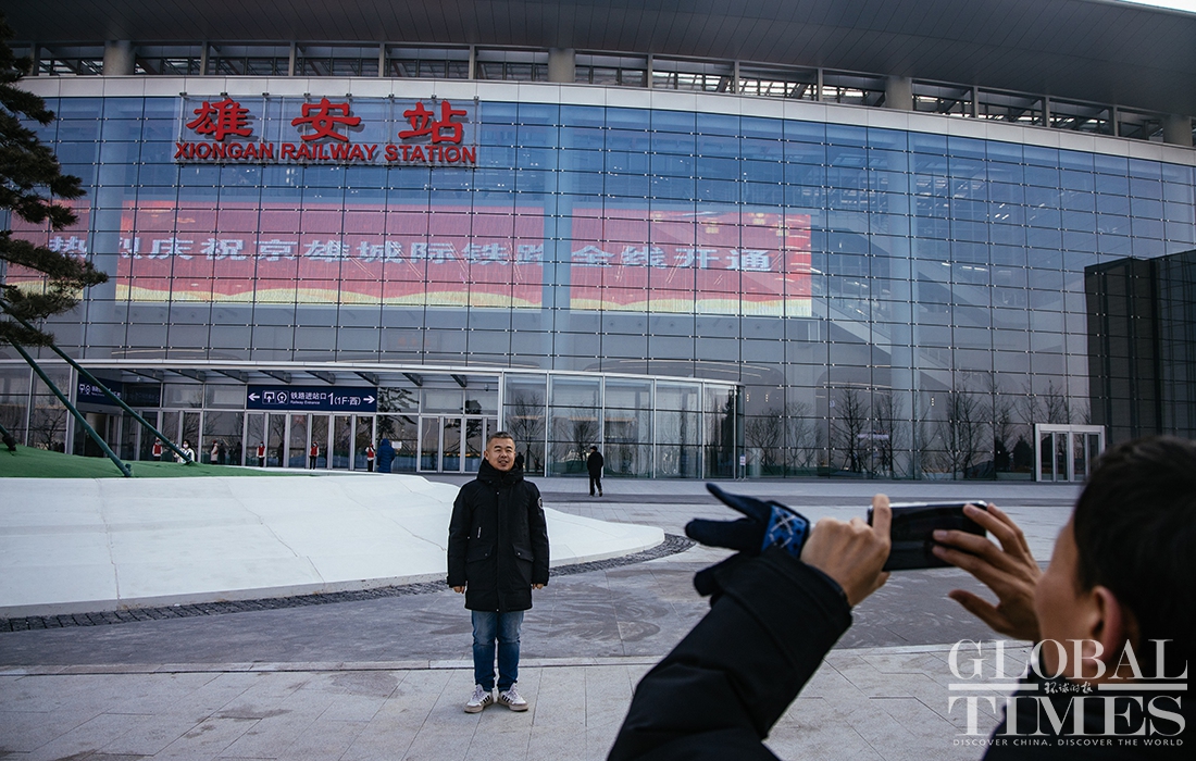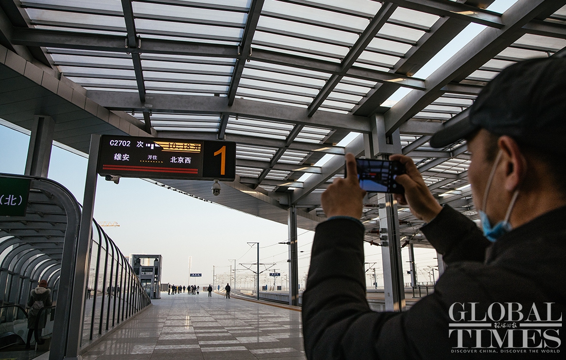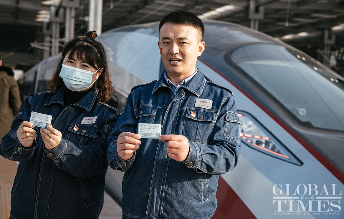 Hou Jiaming, a technical staff member, and Zhang Jing, an administrative staff member, both from China Railway Construction Engineering Group, met and fell in love during the construction of the Xiongan Railway Station. The couple got engaged on the railway's first day of operation. Photo: Li Hao/GT figcaption >