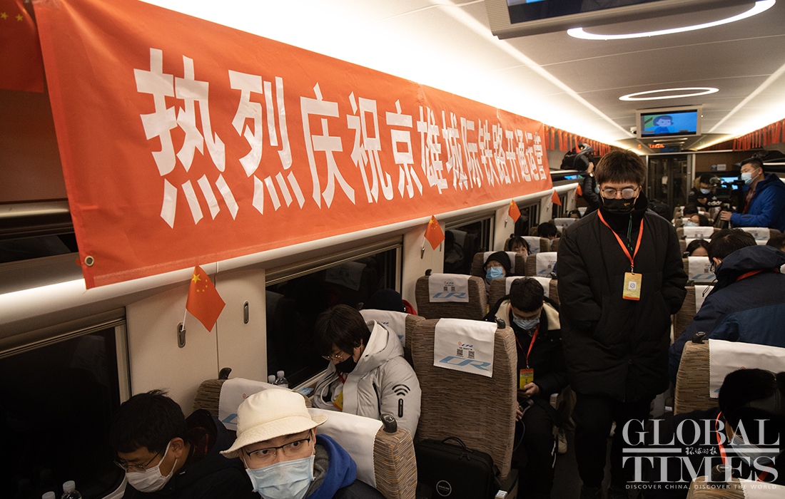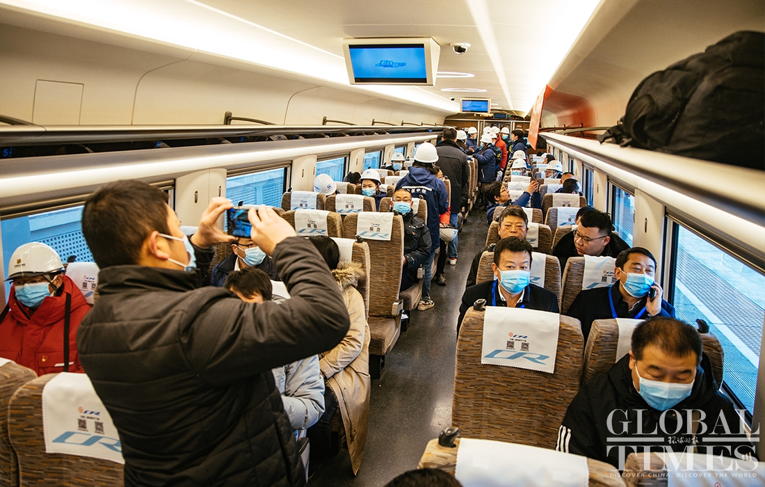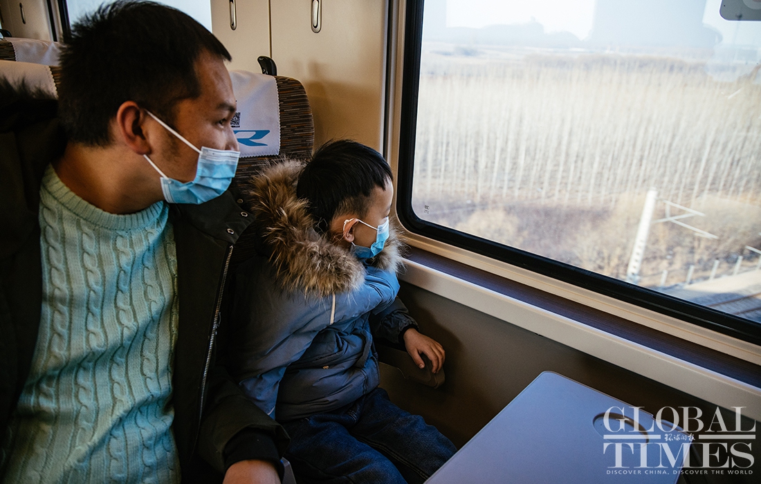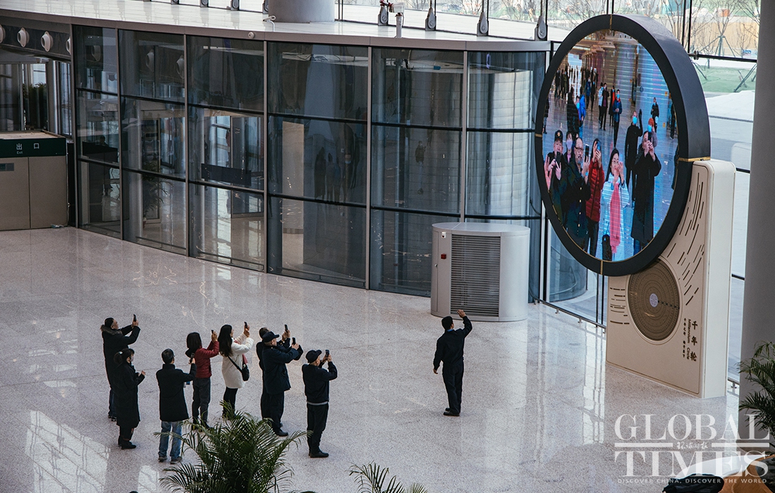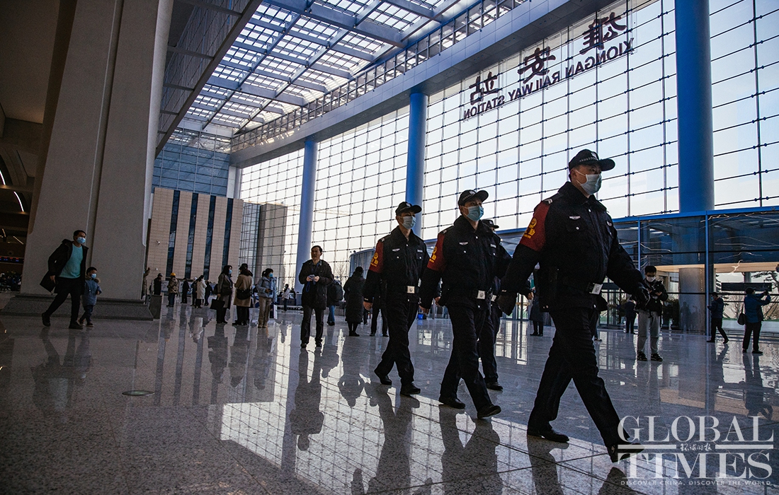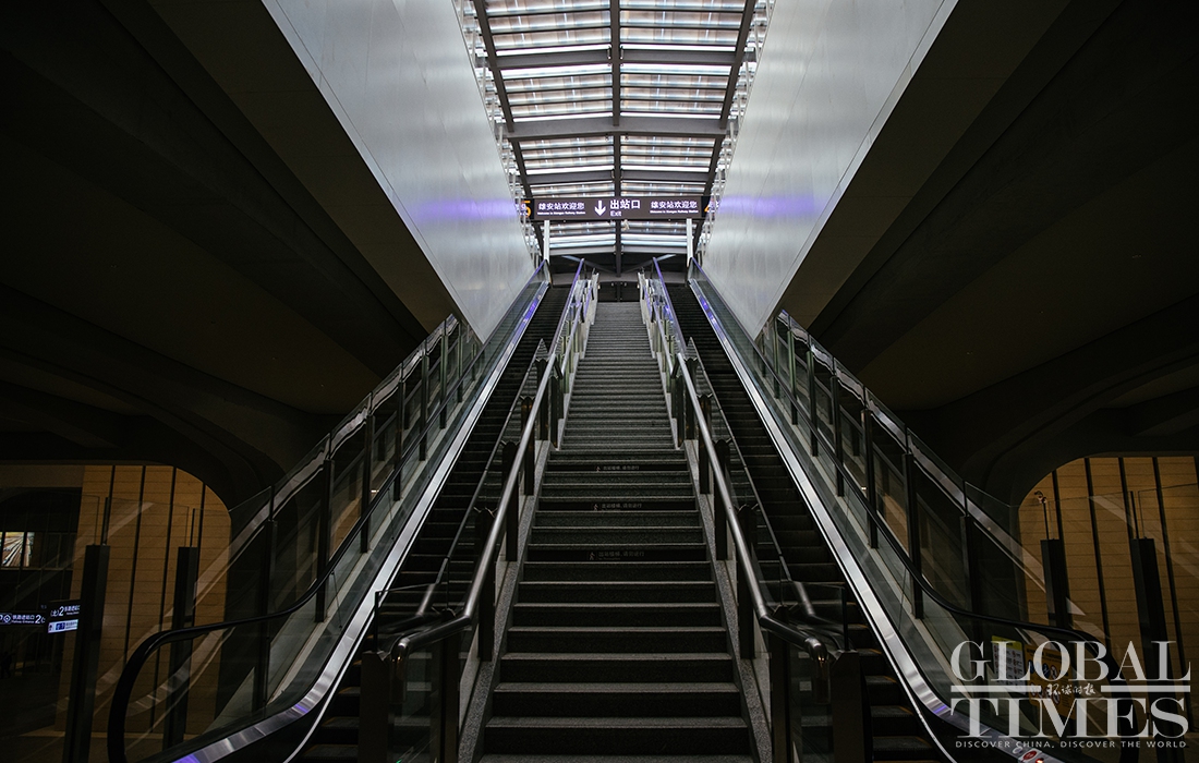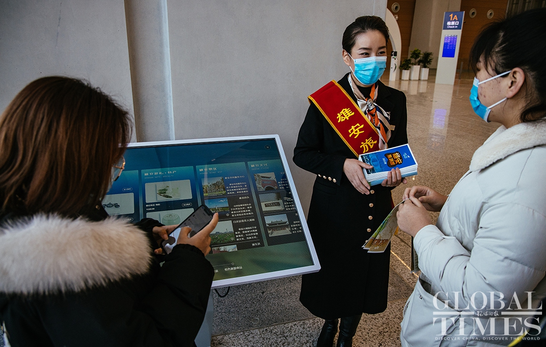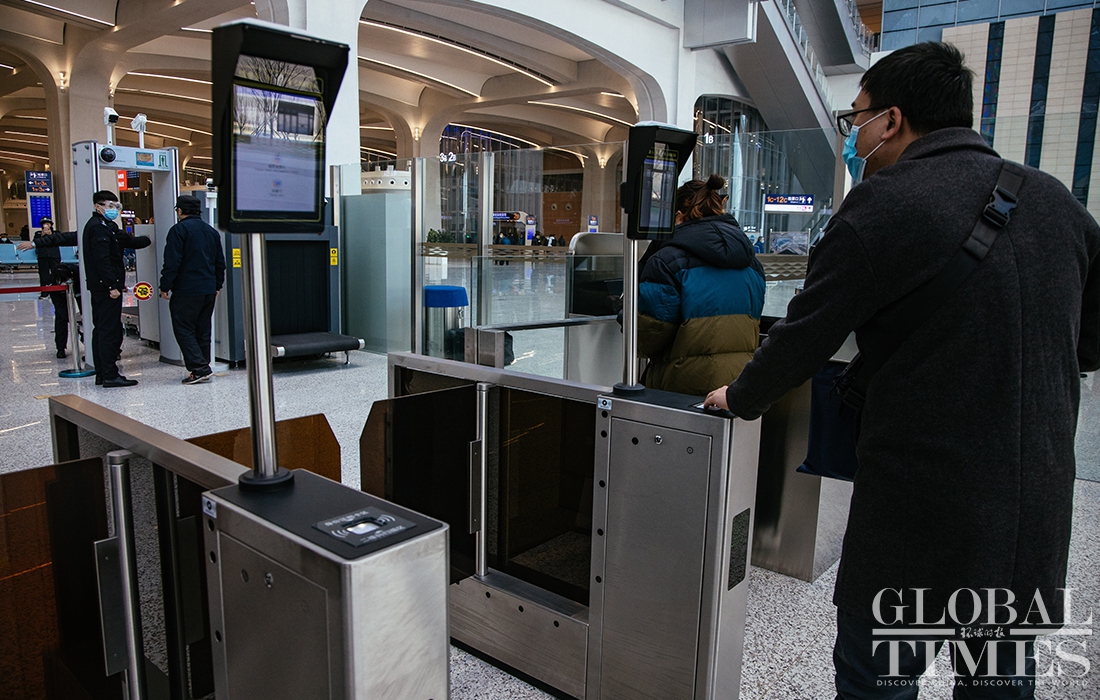 Hou Jiaming, a technical staff member, and Zhang Jing, an administrative staff member, both from China Railway Construction Engineering Group, met and fell in love during the construction of the Xiongan Railway Station. The couple got engaged on the railway's first day of operation. Photo: Li Hao/GT figcaption >