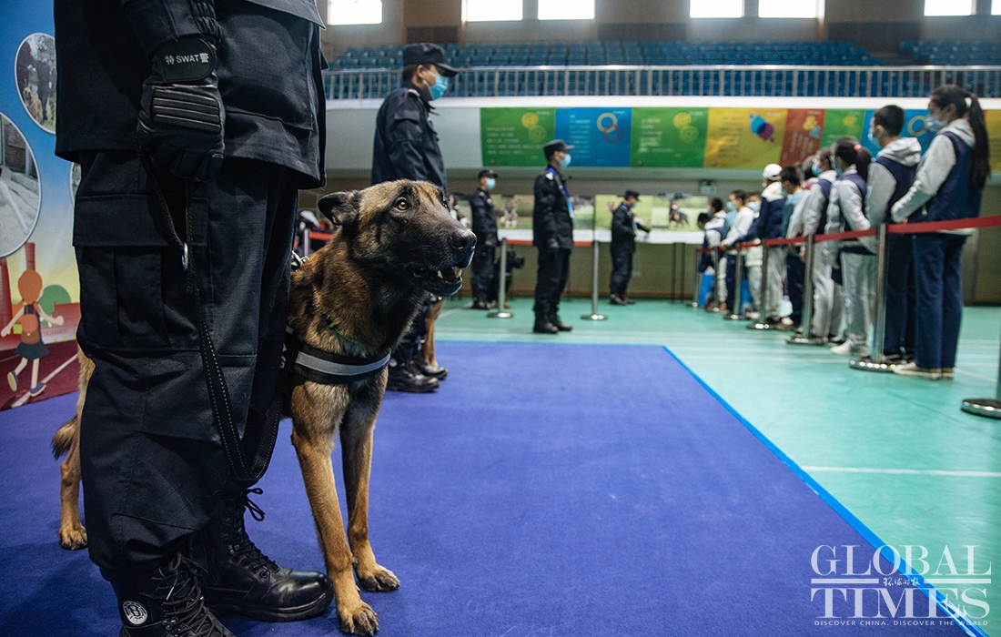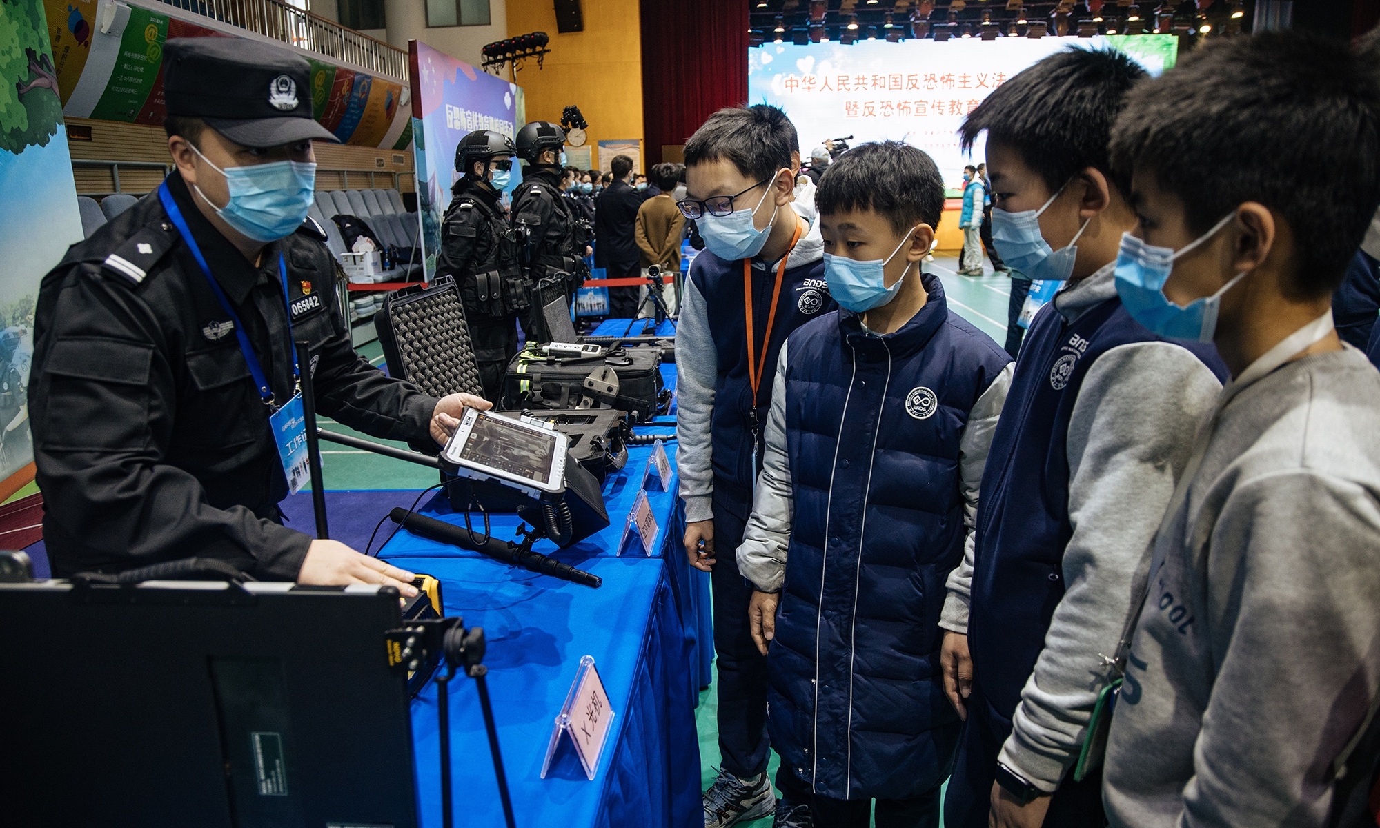 An anti-terrorism education campaign was held at Beijing National Day School, a public senior high school in Beijing on Sunday. It involved the distribution of education brochures, an interactive police dog performance, question and answer session relating to the Anti-terrorism Act, as well as an anti-terrorism equipment display.