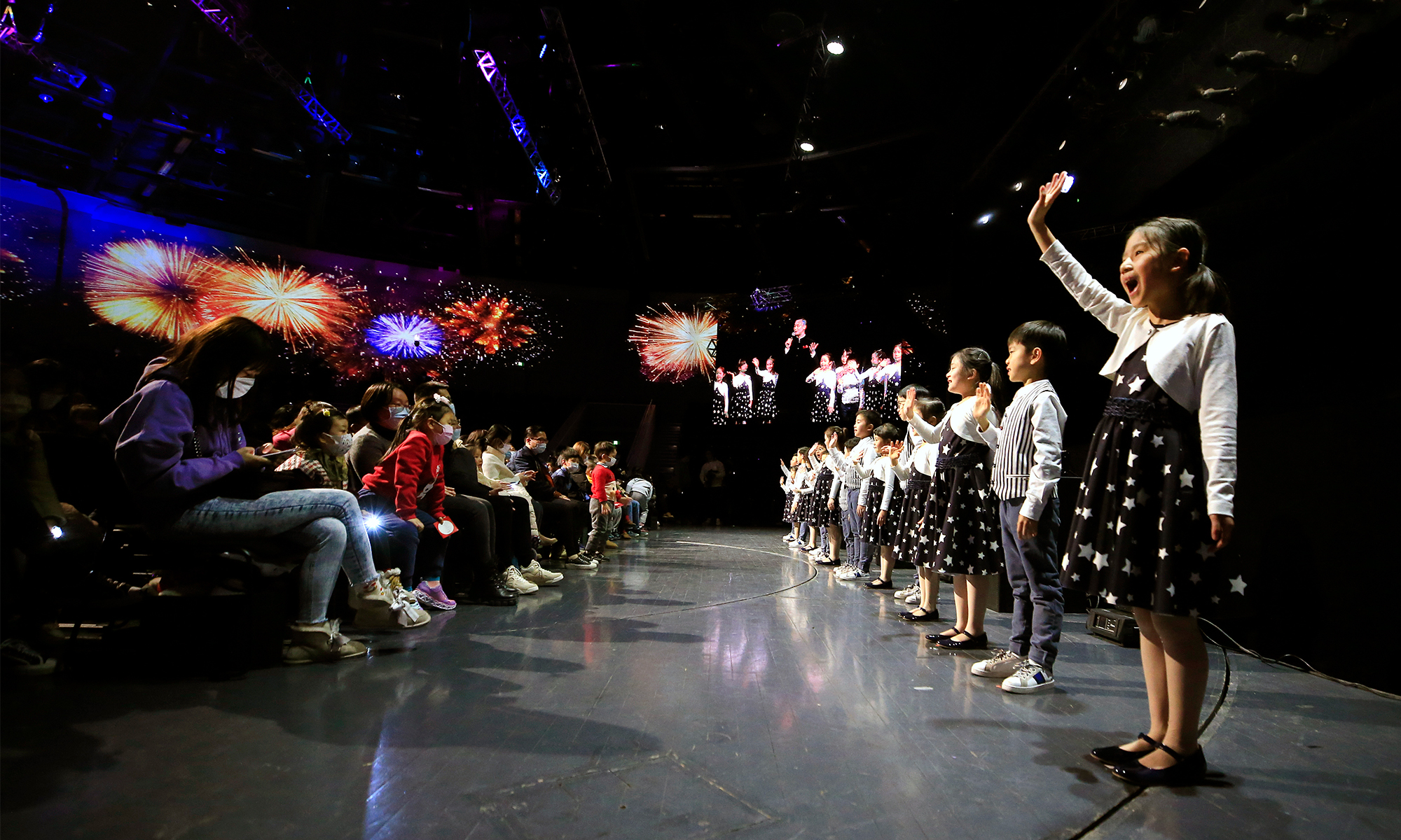 One by one, the members of the Italy's Little Choir of Antoniano "landed" on the stage of the Shanghai Children's Art Theatre on Thursday night. Together with Little Choir of Hydrangea, which is in Shanghai, the Little Choir of Antoniano sang some of their most popular songs – "The Vegetarian Zombie," "The Shark" and "Forza Gesù."