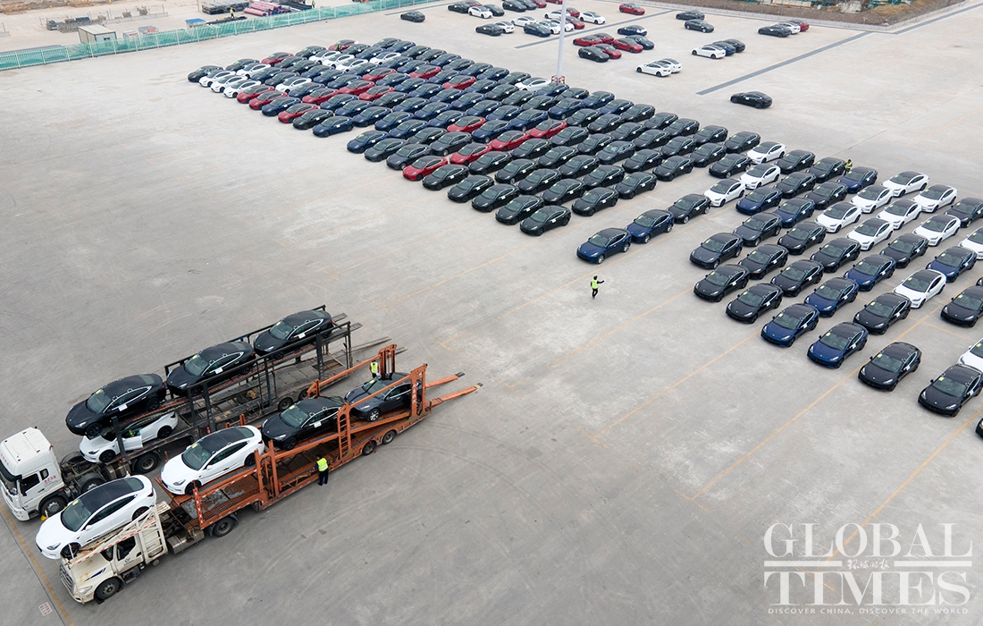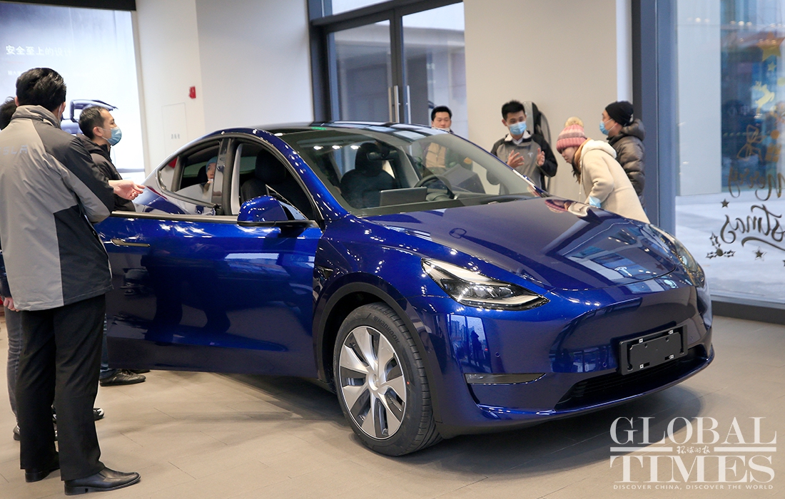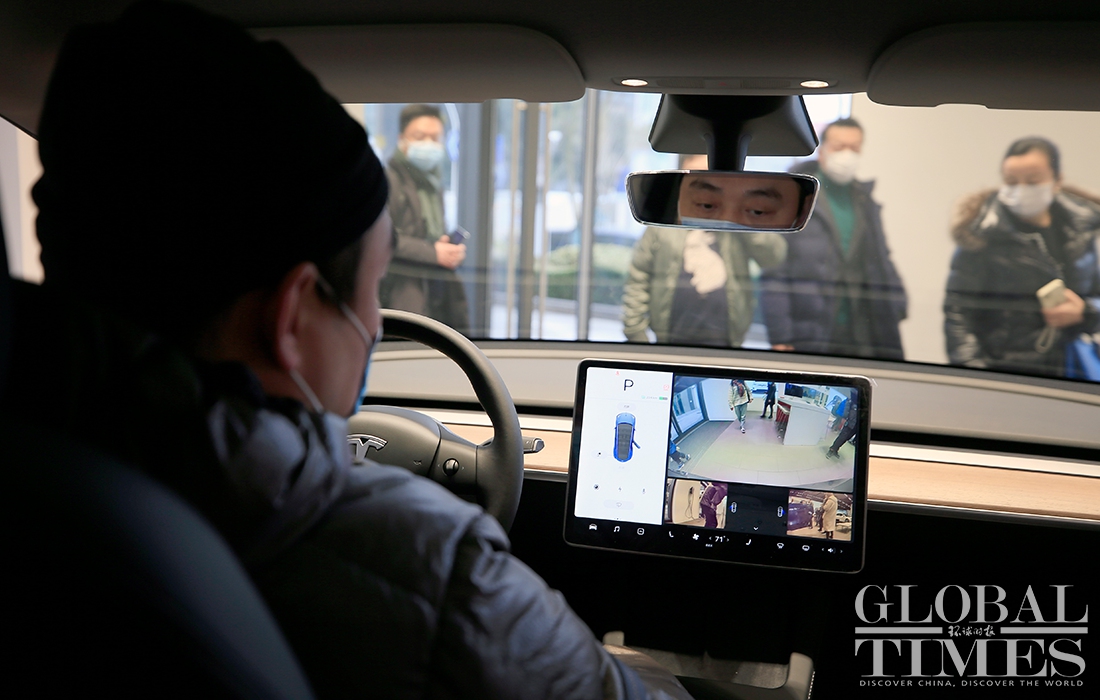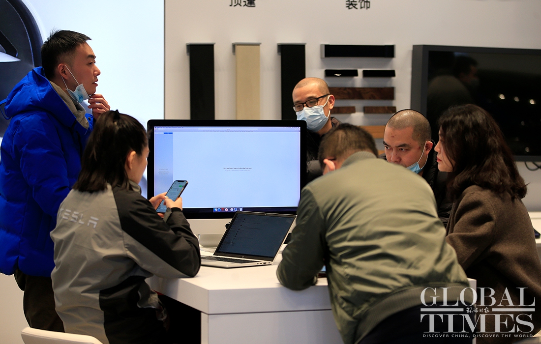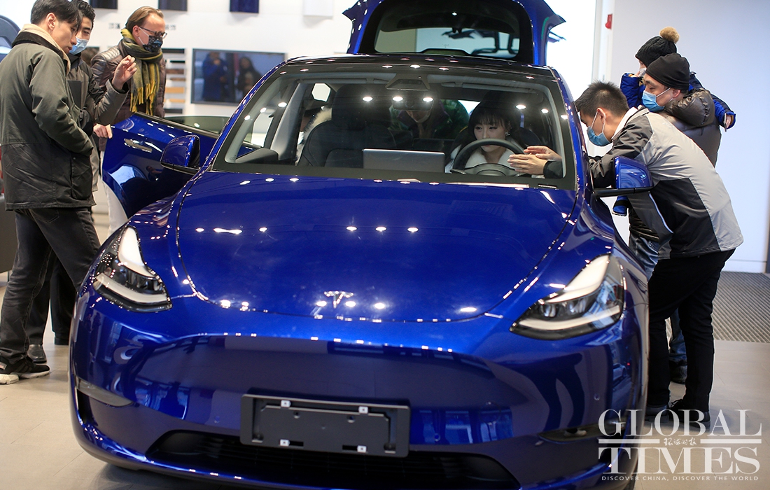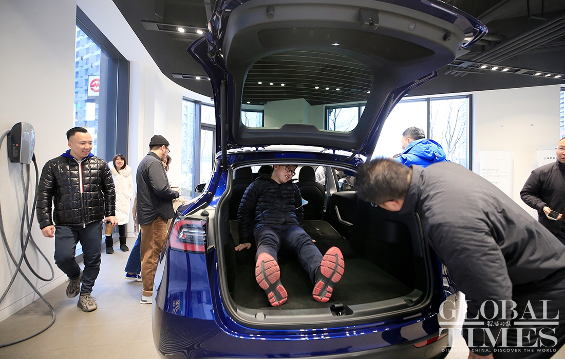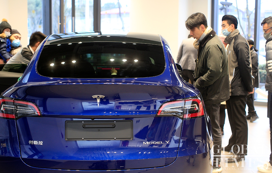 The phase two project of Tesla's Shanghai plant has finished construction and started production. Hundreds of Model Ys and Model 3s are parked at the factory. At a Tesla store in HKRI Taikoo Hui shopping square, where a sapphire-colored Model Y is displayed, flows of customers went inside to inquire about it and try it out. According to the store's salespeople, a buyer could receive the car in about two months if the order is placed now. Photos: Yang Hui/GT