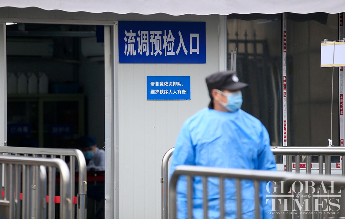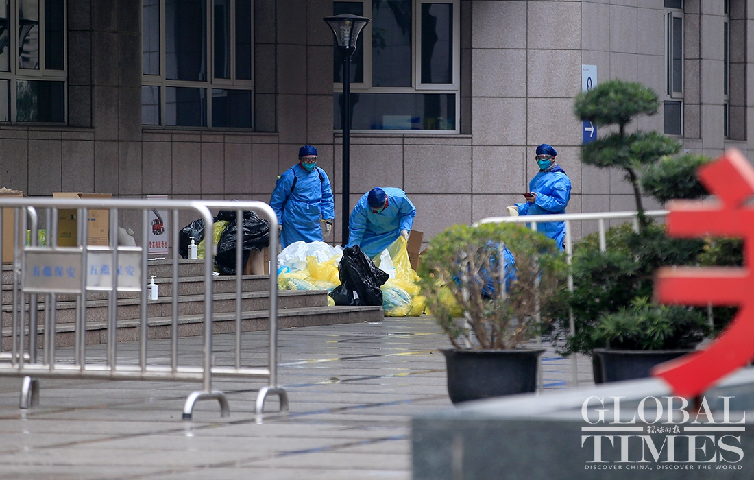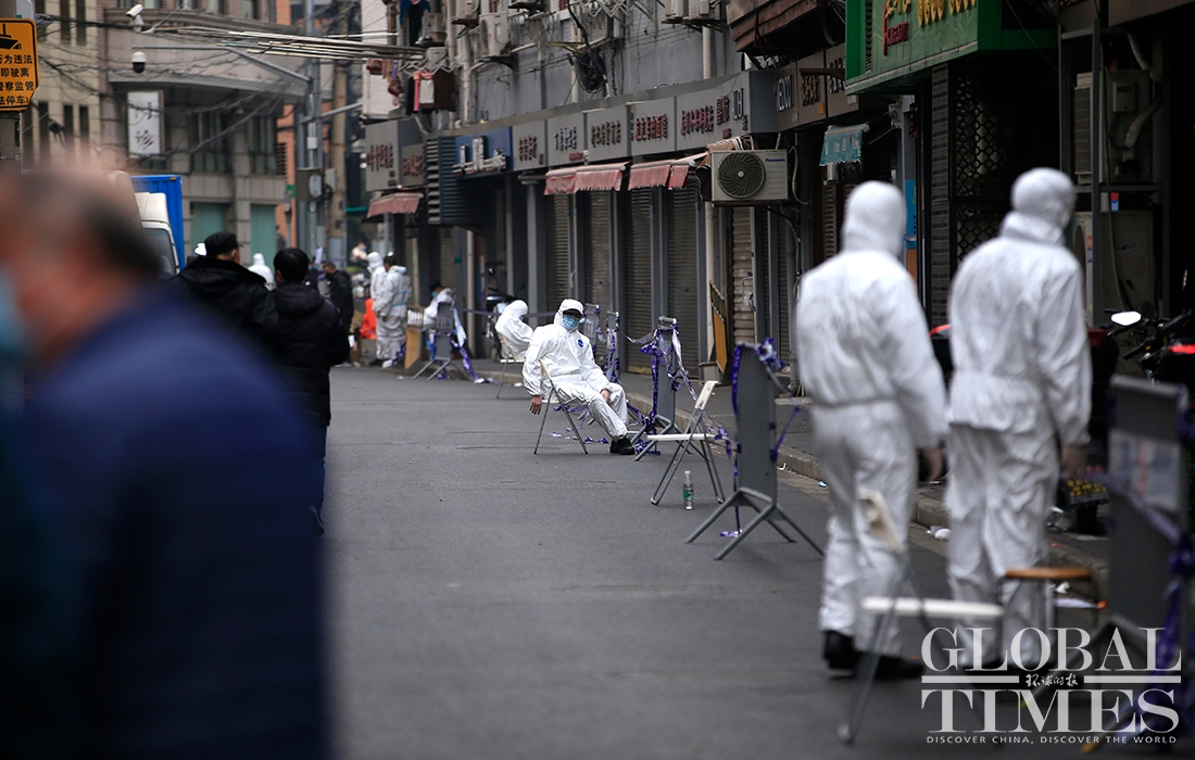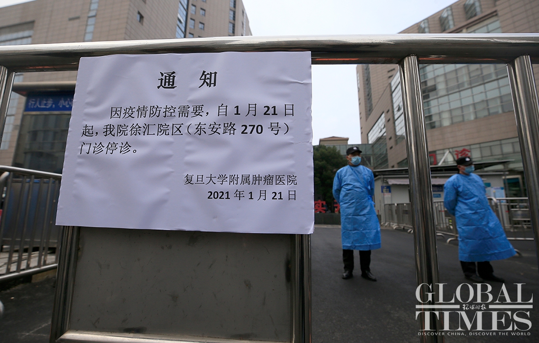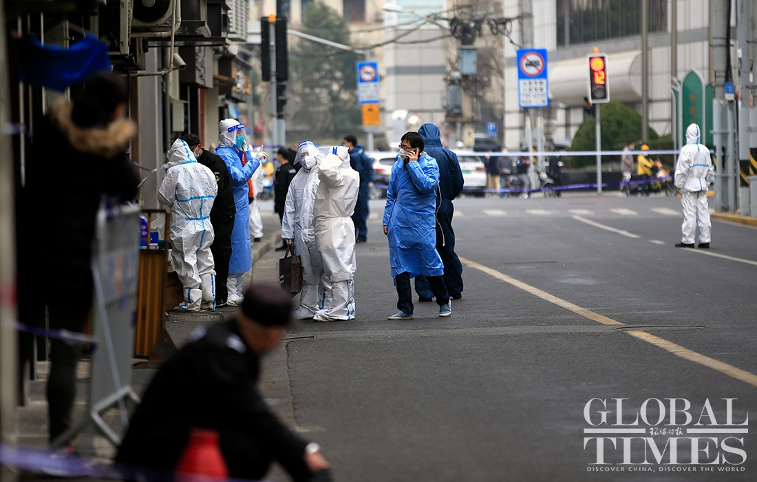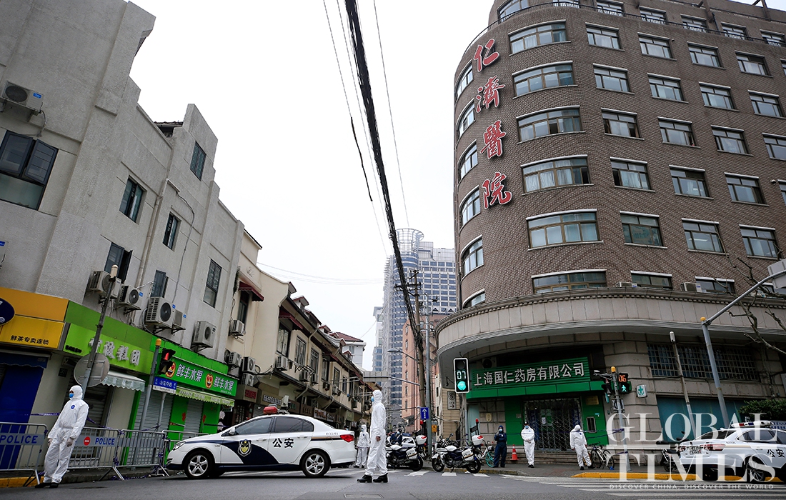 A Global Times reporter found on Thursday morning that the cancer center had been cordoned off, and the entire area surrounding the Renji Hospital, including residential compounds, had been put into lockdown, with medical staffers from the local center for disease control and prevention and epidemiological investigation personal working on site. Photos: Yang Hui/GT