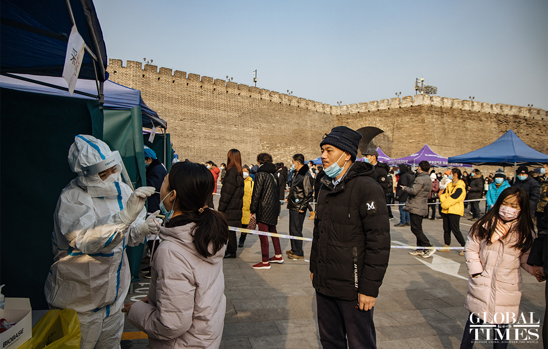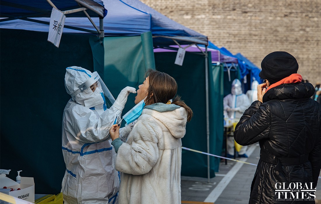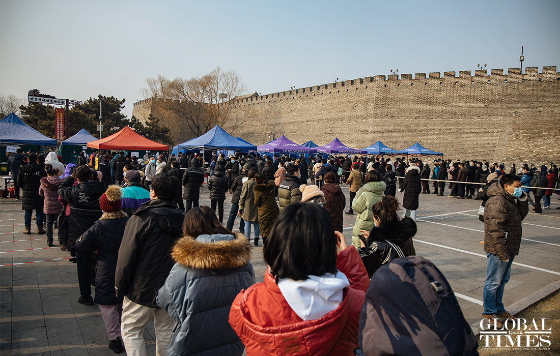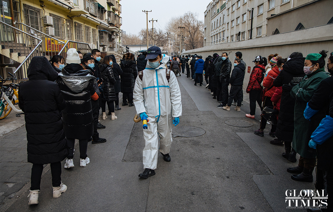 Beijing announced on Friday that the city is organizing nucleic acid testing for over two million residents in the city's Dongcheng and Xicheng districts from Friday to Saturday. People were seen lining up in an orderly manner at test locations and staff regularly disinfected crowded places to ensure the safety of nucleic acid testing. Beijing reported three new confirmed cases and one asymptomatic carrier on Thursday, with two imported silent carriers. Photos: Li Hao/GT