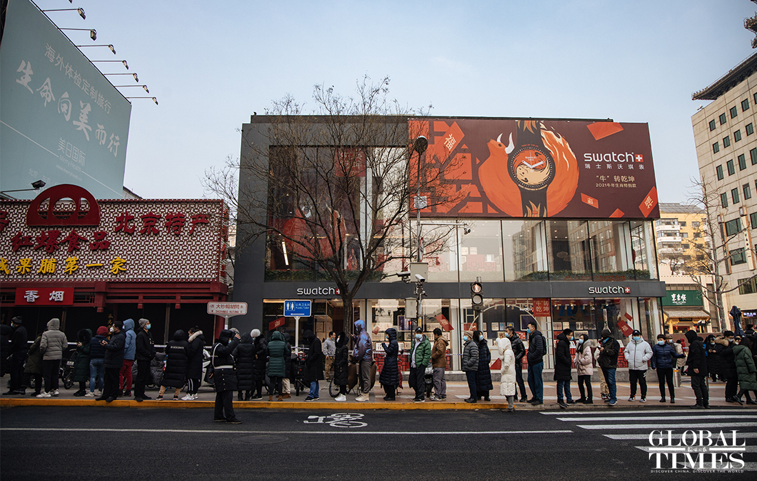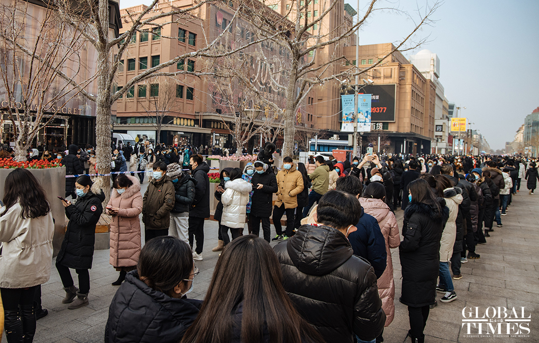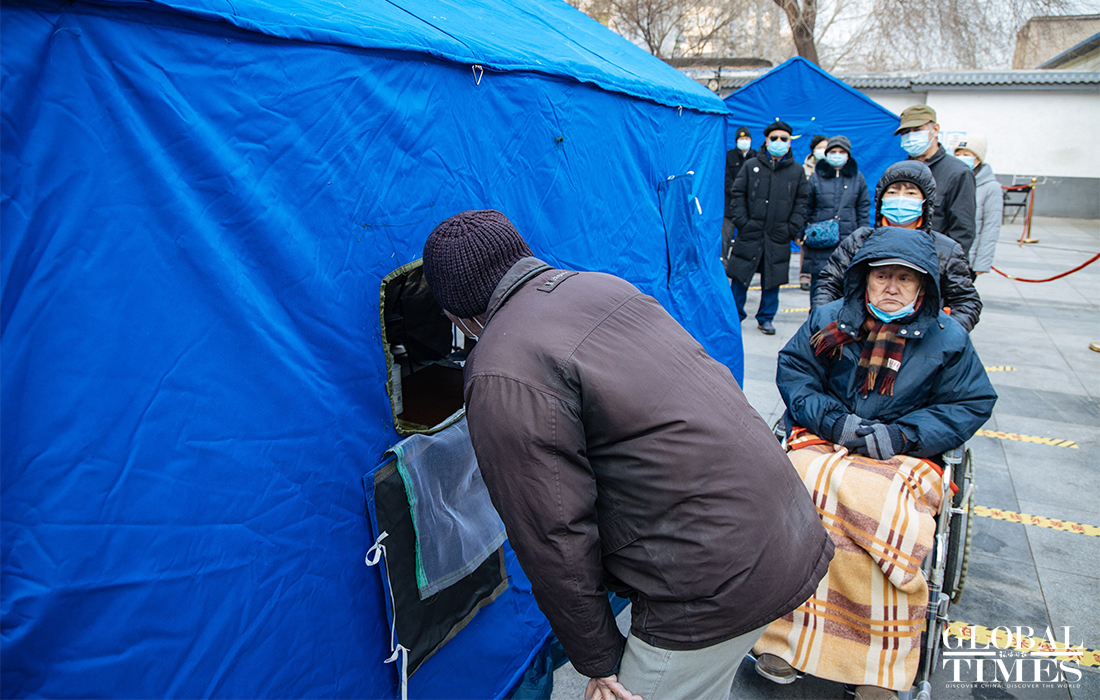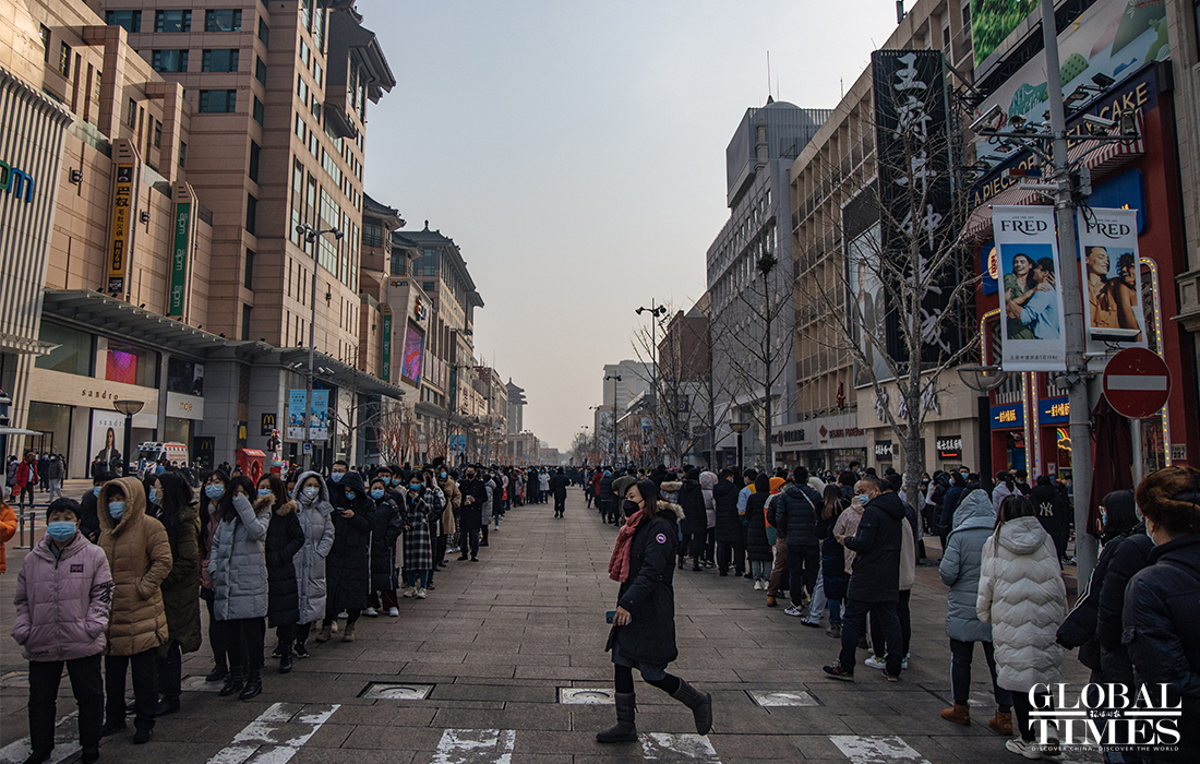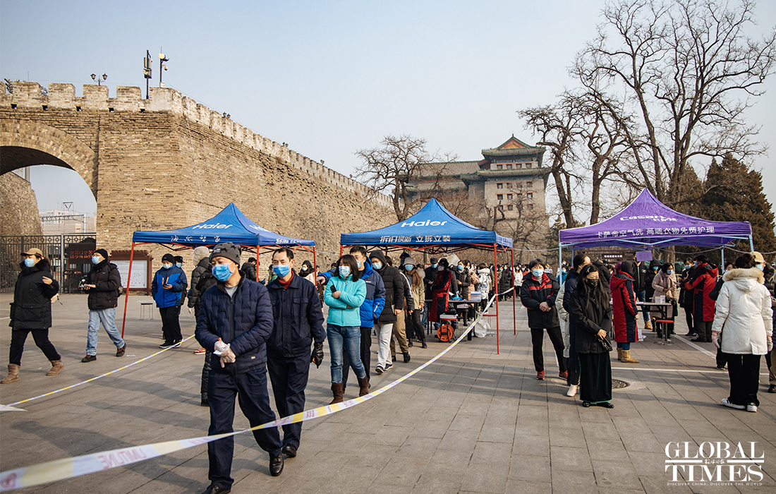 Beijing announced on Friday that the city is organizing nucleic acid testing for over two million residents in the city's Dongcheng and Xicheng districts from Friday to Saturday. People were seen lining up in an orderly manner at test locations and staff regularly disinfected crowded places to ensure the safety of nucleic acid testing. Beijing reported three new confirmed cases and one asymptomatic carrier on Thursday, with two imported silent carriers. Photos: Li Hao/GT
