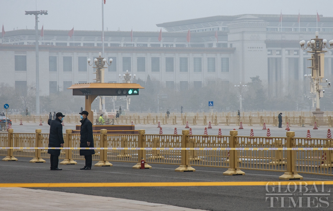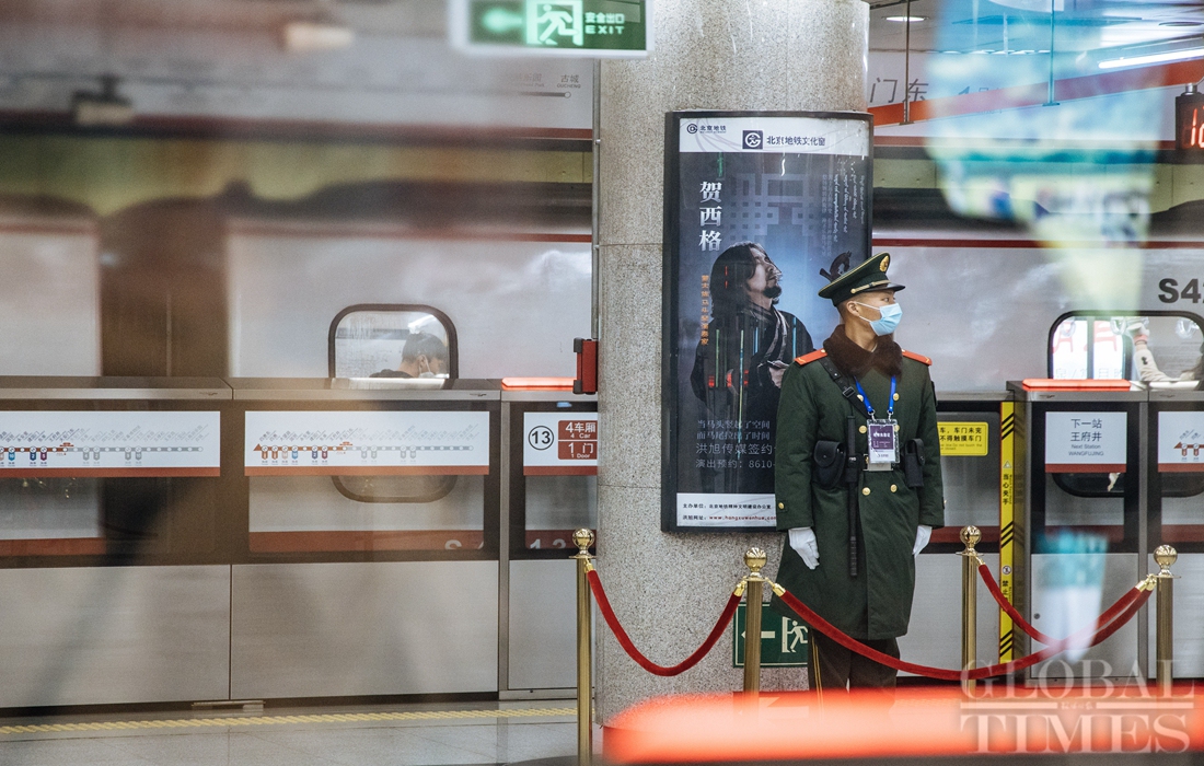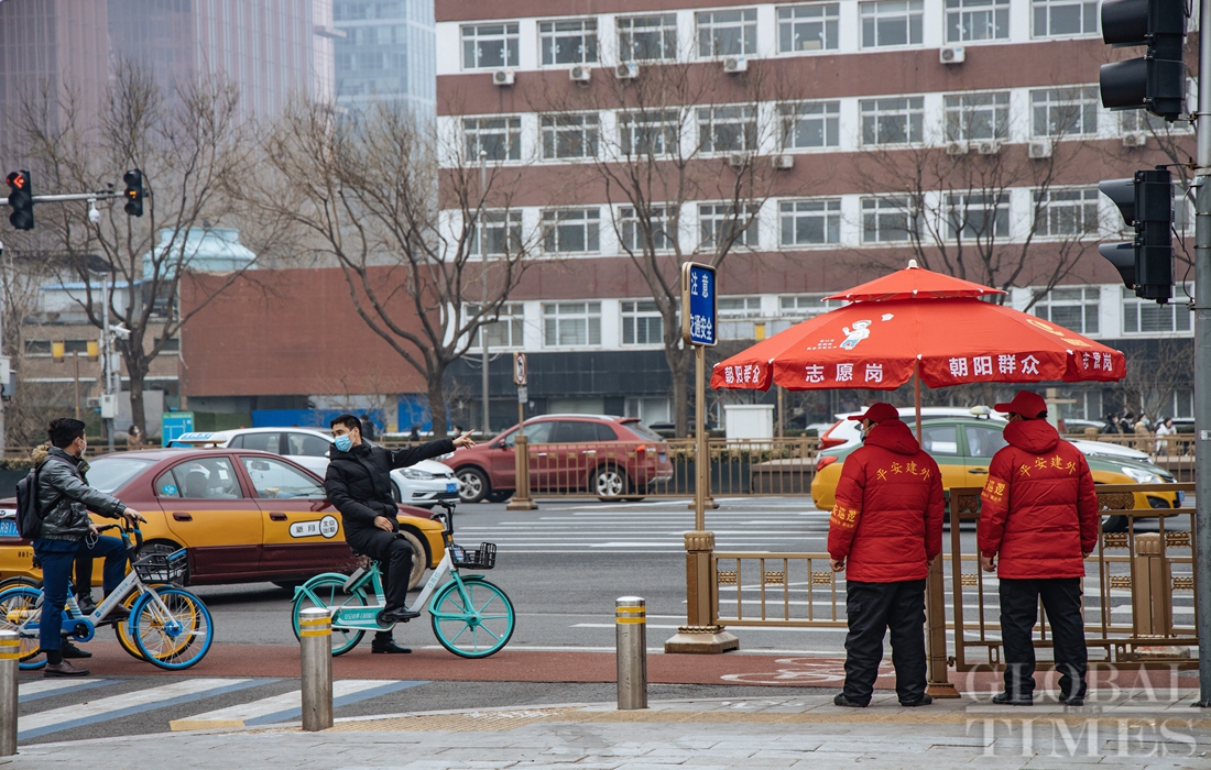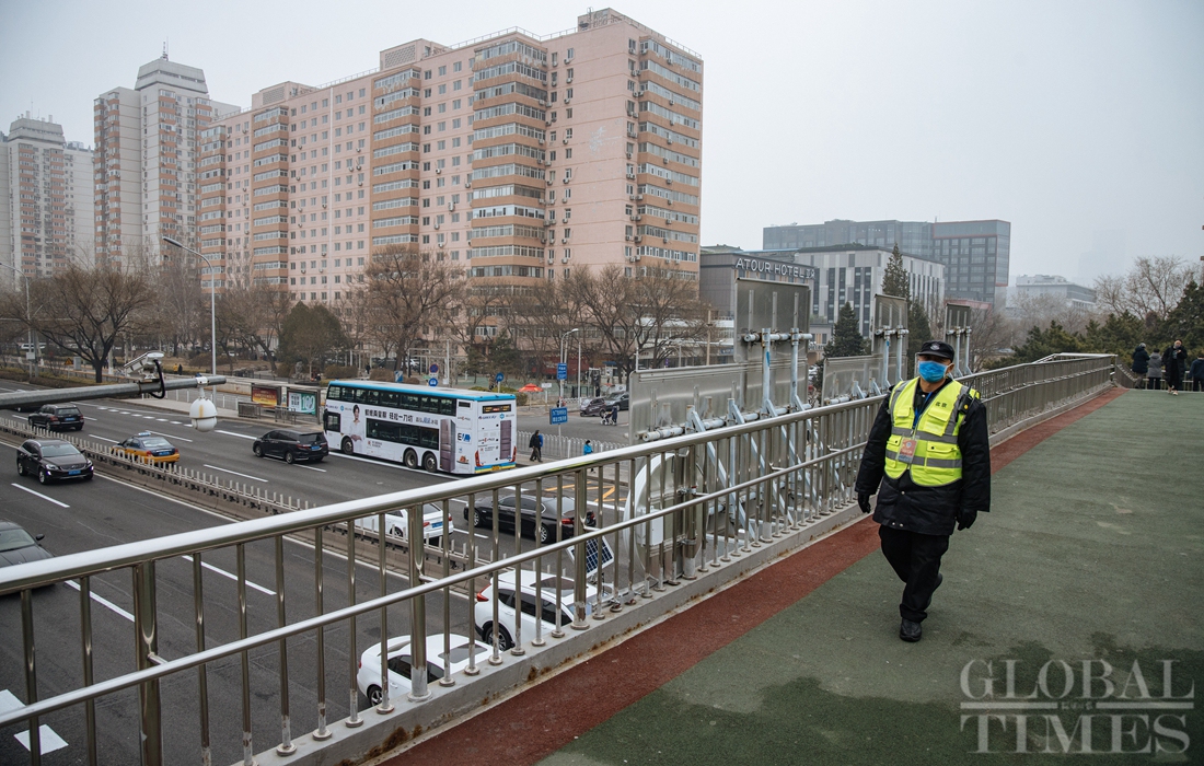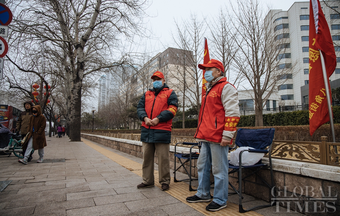 Security in the city has been upgraded, and resident volunteers can be seen on the streets. Outdoor electronic info screens have been set up to facilitate residents’ access to the sessions’ agenda and information. Photos: Li Hao/GT