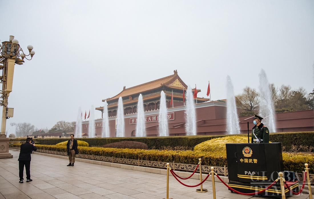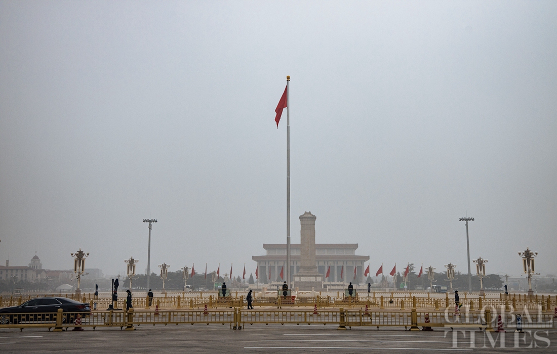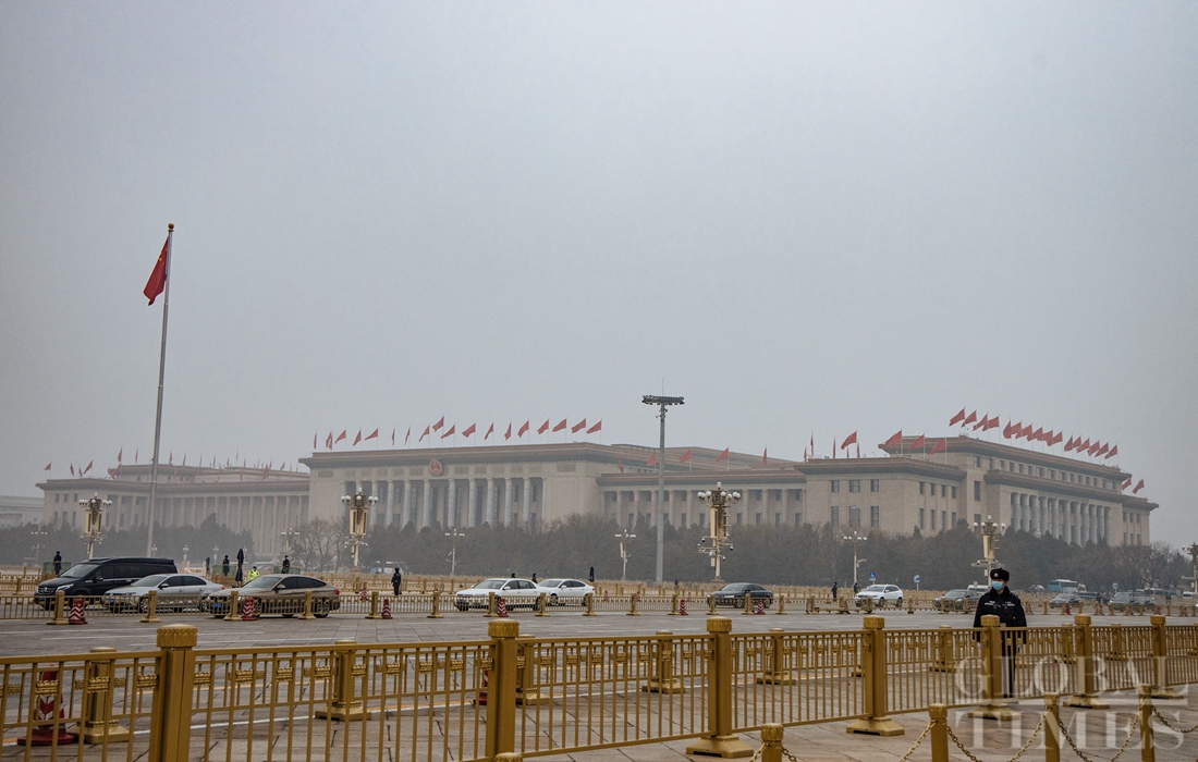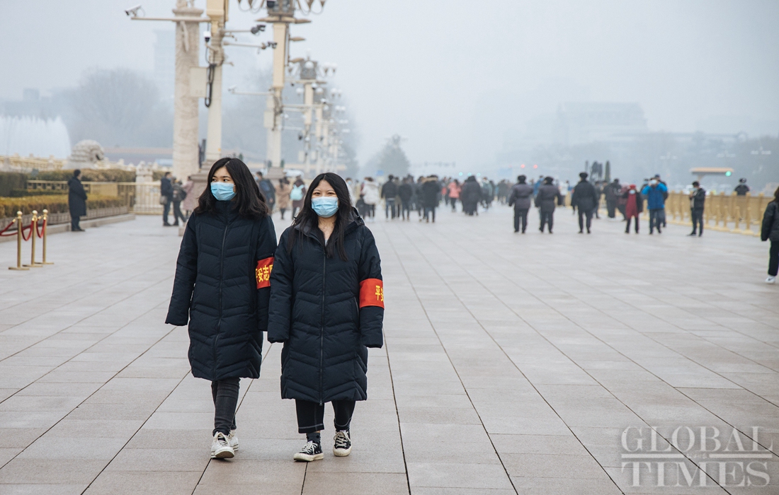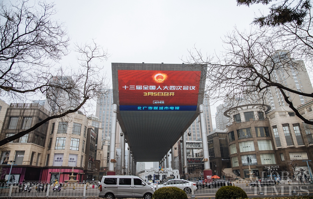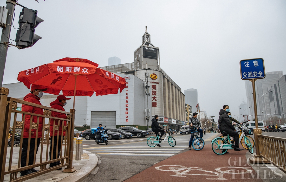 Security in the city has been upgraded, and resident volunteers can be seen on the streets. Outdoor electronic info screens have been set up to facilitate residents’ access to the sessions’ agenda and information. Photos: Li Hao/GT