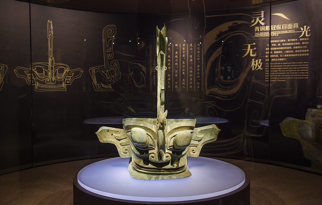 A bronze mask is on exhibition at the Sanxingdui Museum. Photo: VCG figcaption >